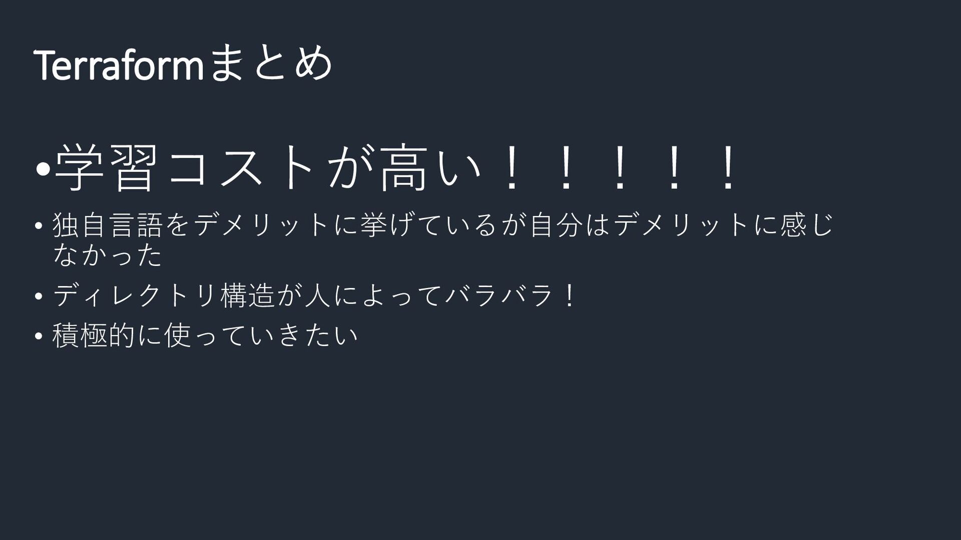 Terraformまとめ •学習コストが高い!!!!! • 独自言語をデメリットに挙げているが自分はデメリットに感じ なかった • ディレクトリ構造が人によってバラバラ! • 積極的に使っていきたい