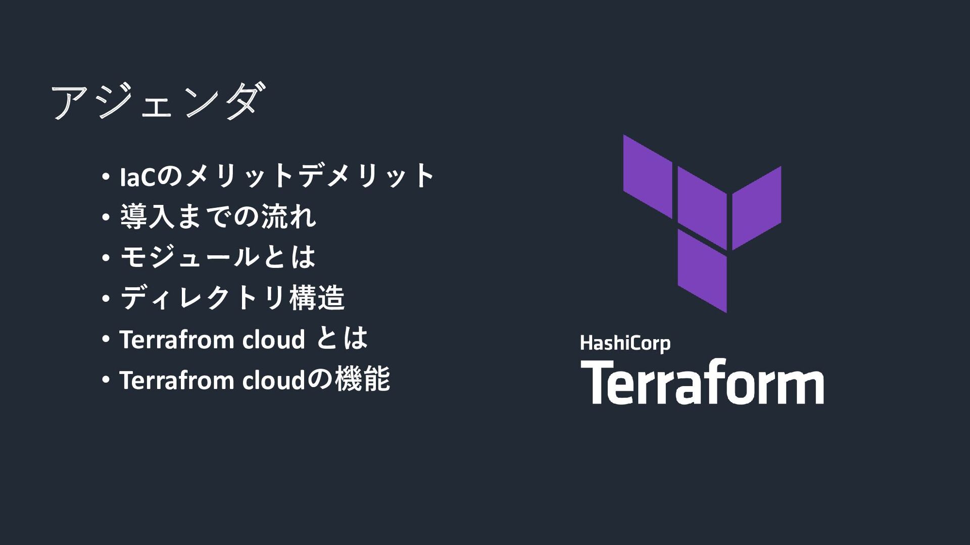 アジェンダ • IaCのメリットデメリット • 導入までの流れ • モジュールとは • ディレクトリ構造 •