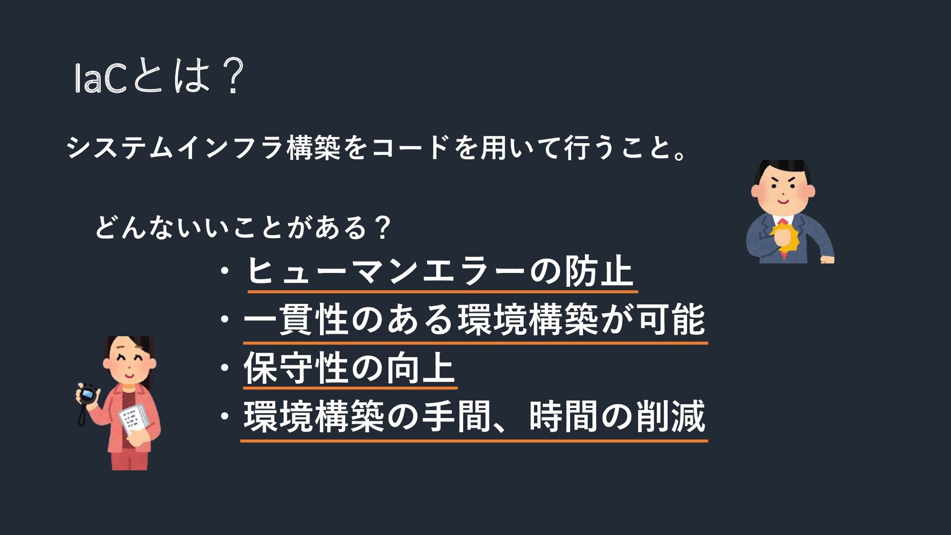 IaCとは? システムインフラ構築をコードを用いて行うこと。 どんないいことがある? ・ヒューマンエラーの防止 ・一貫性のある環境構築が可能 ・保守性の向上 ・環境構築の手間、時間の削減
