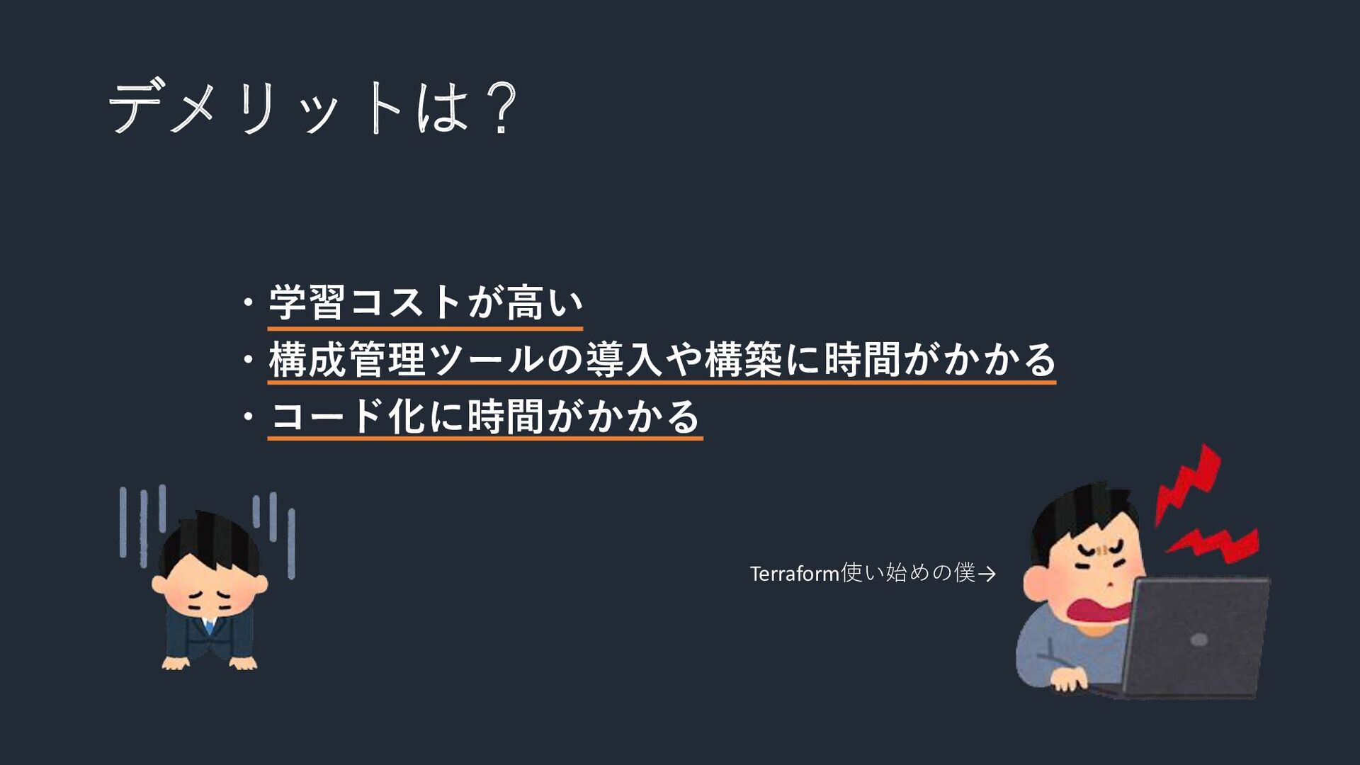デメリットは? ・学習コストが高い ・構成管理ツールの導入や構築に時間がかかる ・コード化に時間がかかる Terraform使い始めの僕→