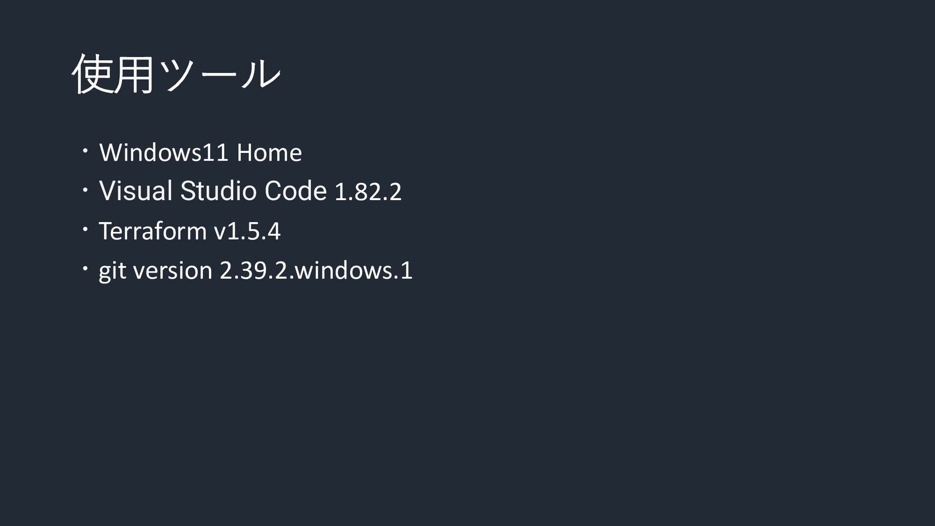 使用ツール ・Windows11 Home ・Visual Studio Code 1.82.2 ・Terraform v1.5.4 ・git