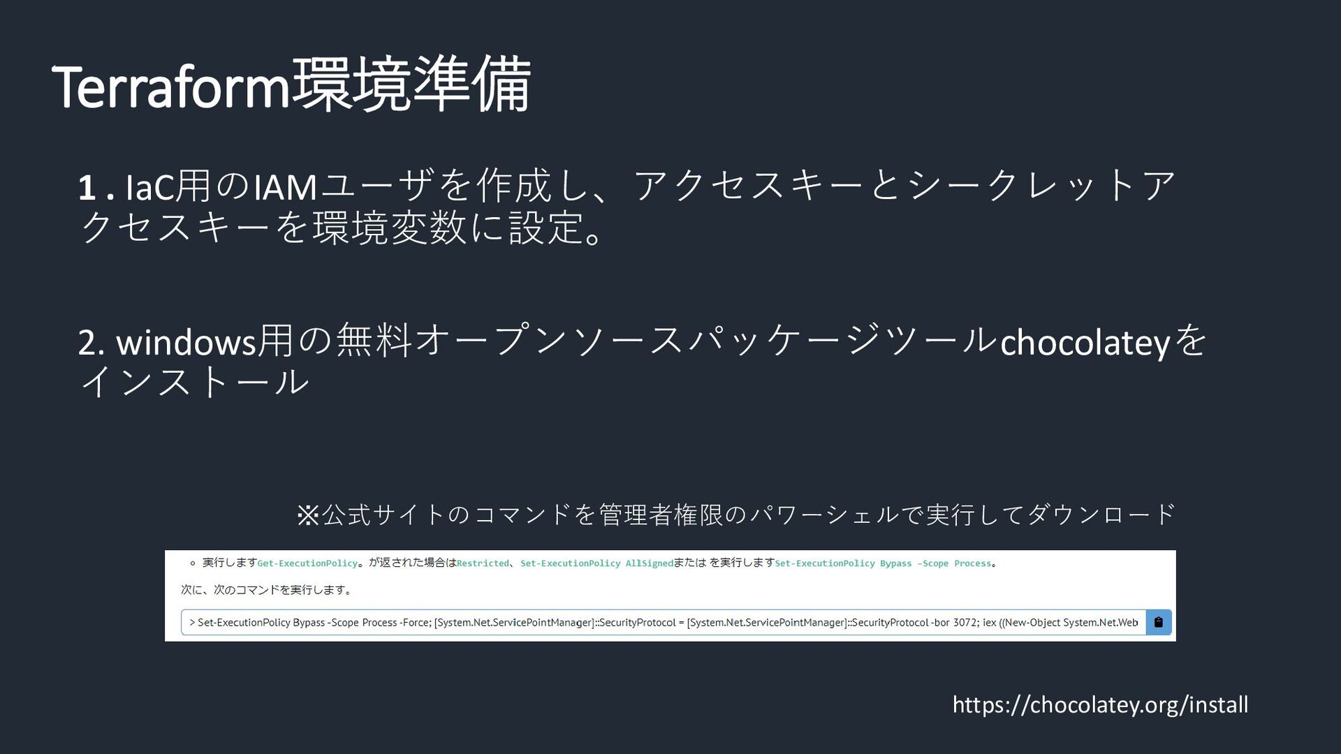 Terraform環境準備 1 . IaC用のIAMユーザを作成し、アクセスキーとシークレットア クセスキーを環境変数に設定。 2. windows用の無料オープンソースパッケージツールchocolateyを インストール ※公式サイトのコマンドを管理者権限のパワーシェルで実行してダウンロード https://chocolatey.org/install
