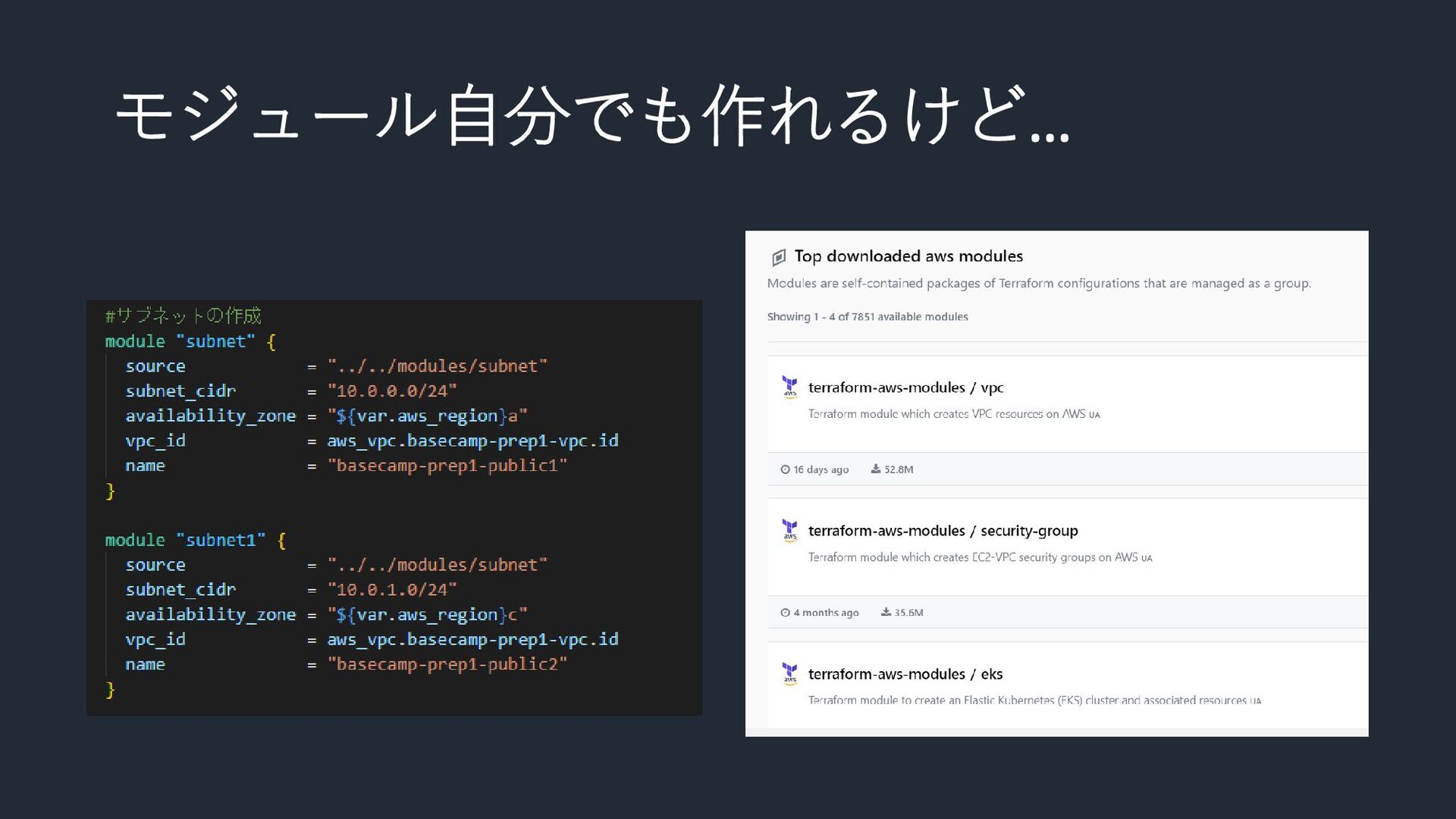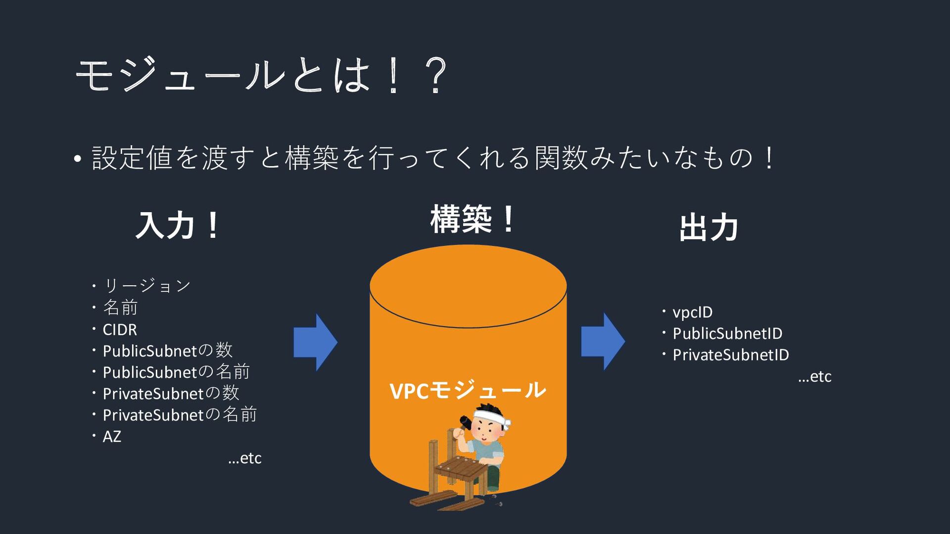 モジュールとは!? • 設定値を渡すと構築を行ってくれる関数みたいなもの! VPCモジュール ・リージョン ・名前 ・CIDR ・PublicSubnetの数 ・PublicSubnetの名前 ・PrivateSubnetの数