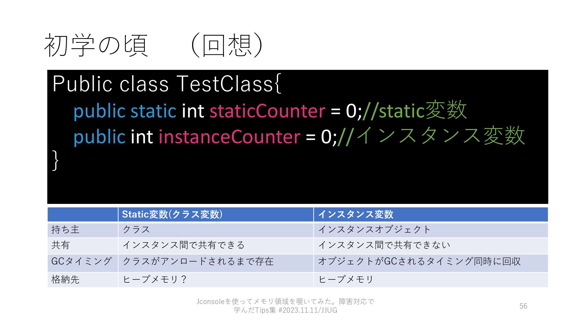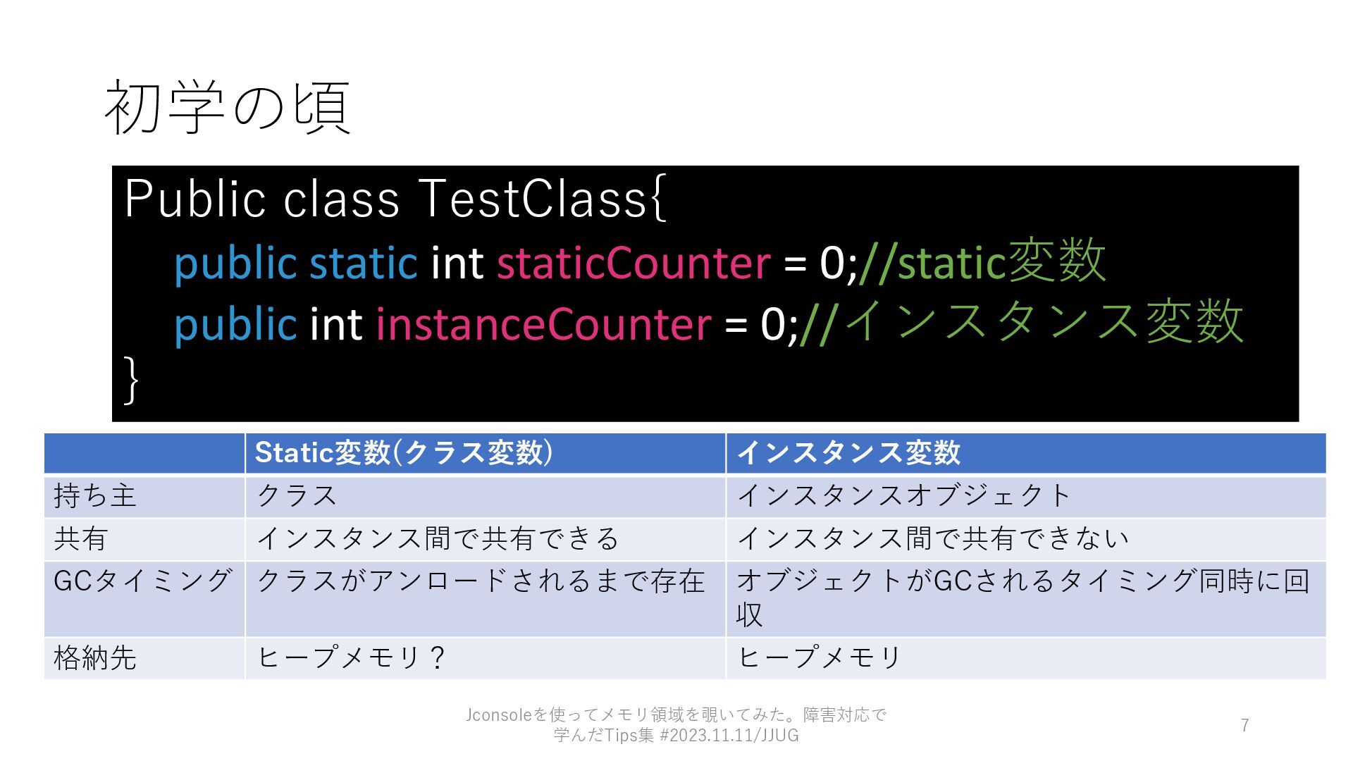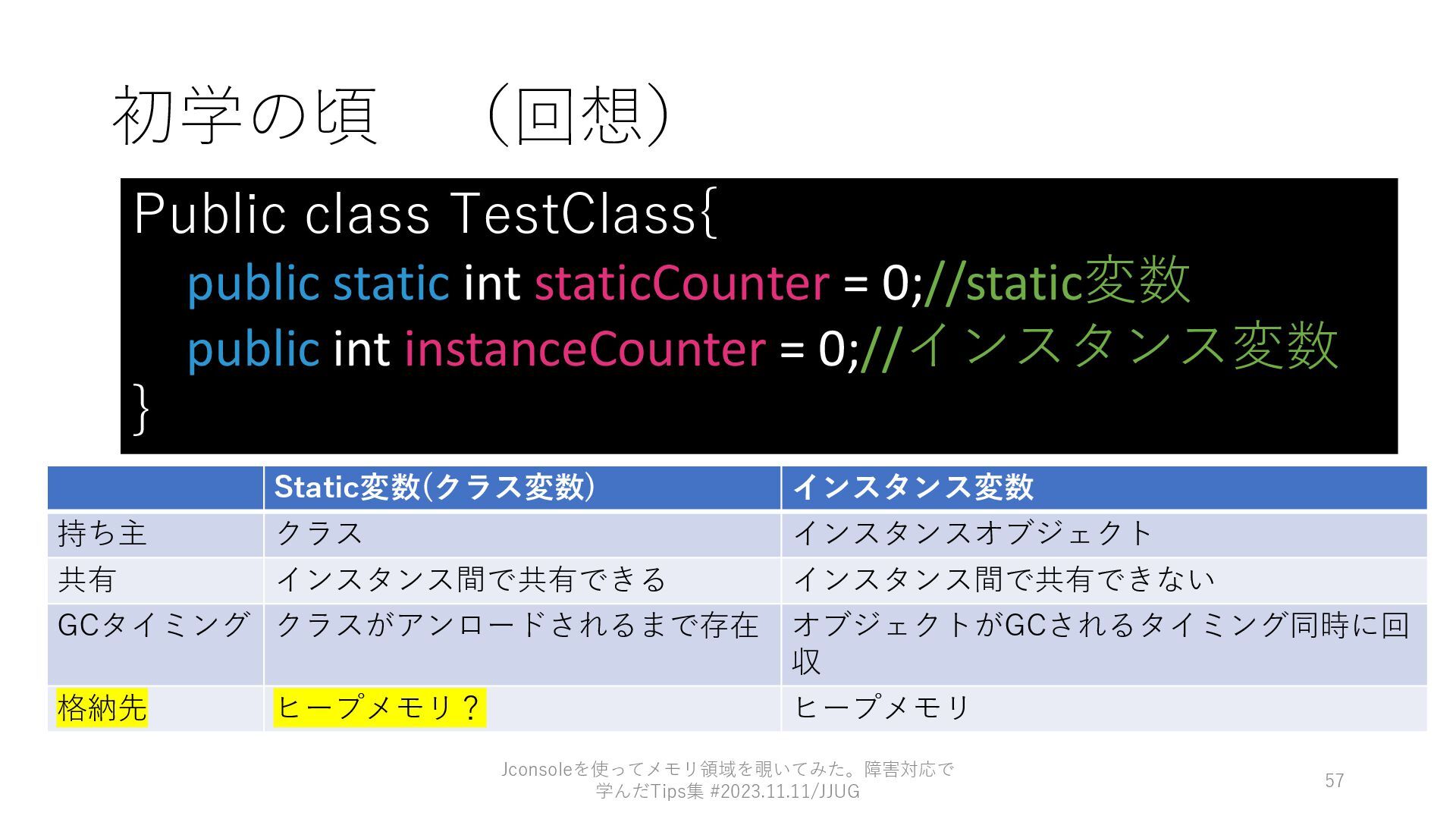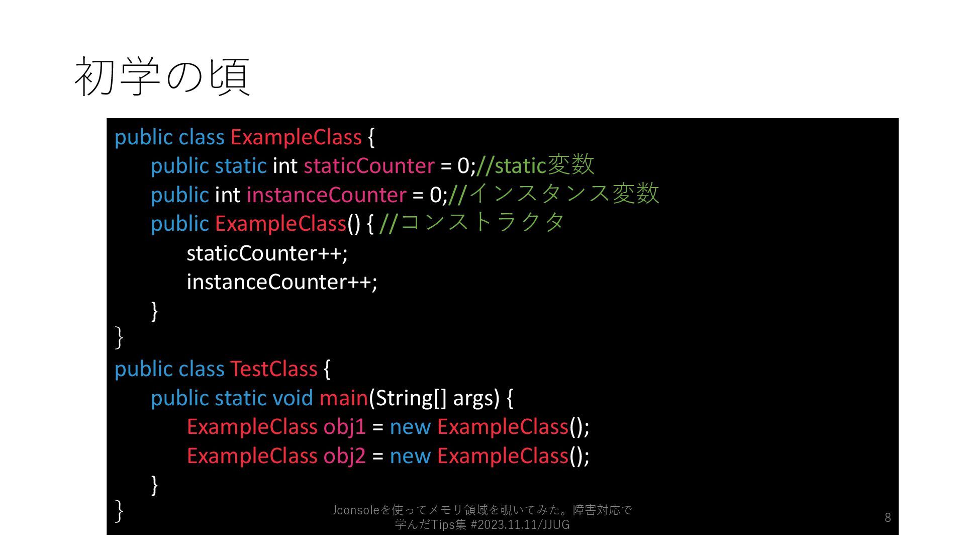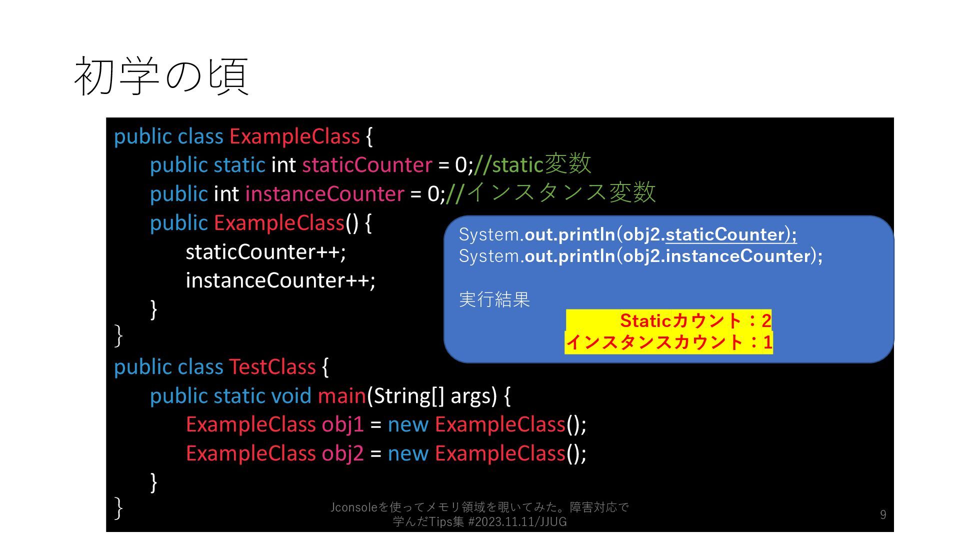 public int instanceCounter = 0;//インスタンス変数 public ExampleClass() { staticCounter++; instanceCounter++; } } public class TestClass { public static void main(String[] args) { ExampleClass obj1 = new ExampleClass(); ExampleClass obj2 = new ExampleClass(); } } System.out.println(obj2.staticCounter); System.out.println(obj2.instanceCounter); 実行結果 Staticカウント:2 インスタンスカウント:1 初学の頃 Jconsoleを使ってメモリ領域を覗いてみた。障害対応で 学んだTips集 #2023.11.11/JJUG 9