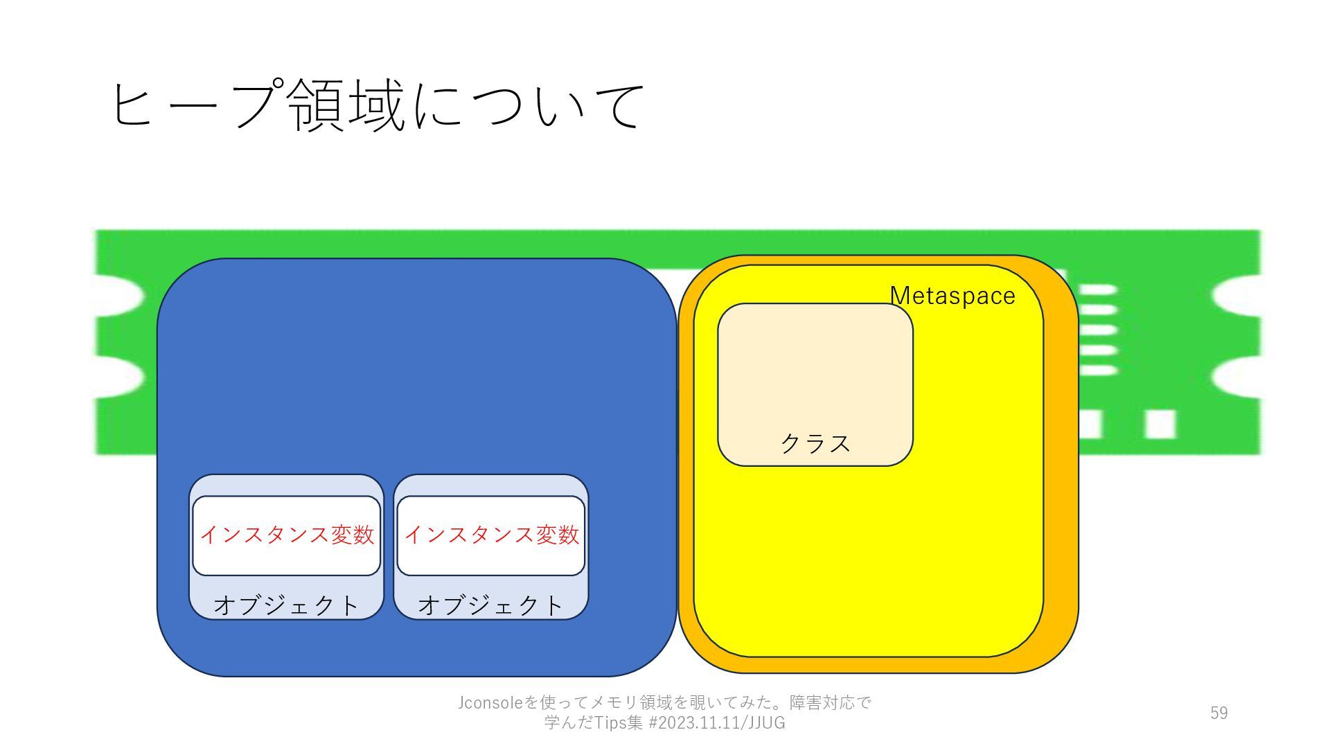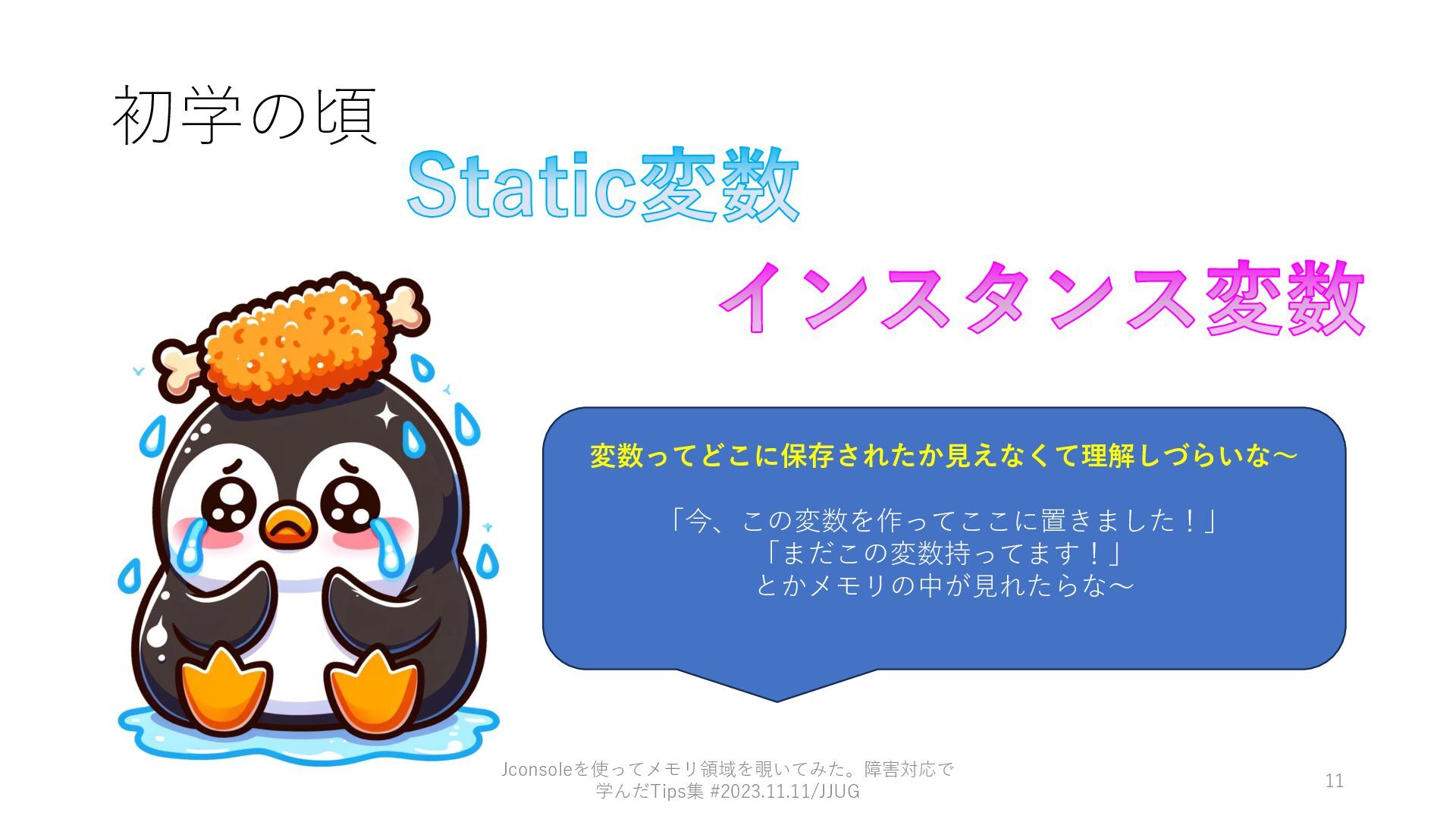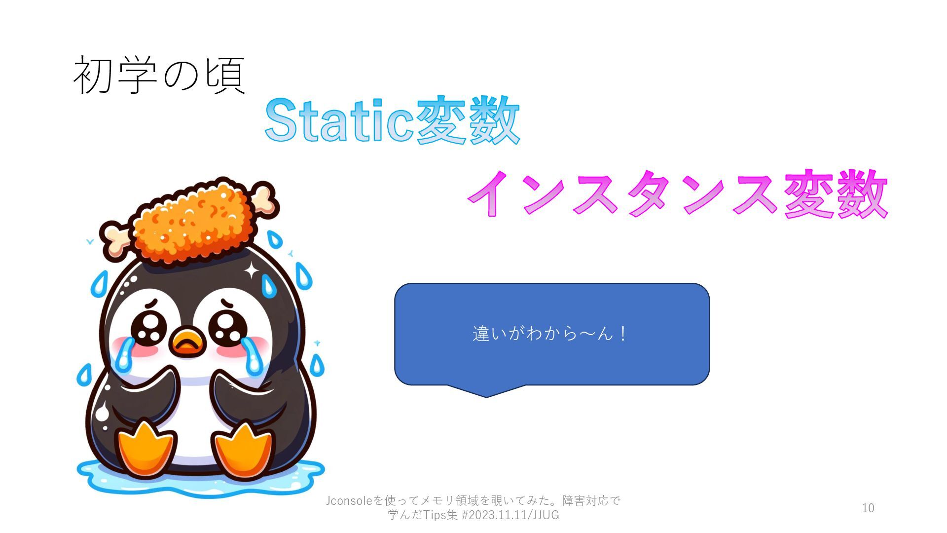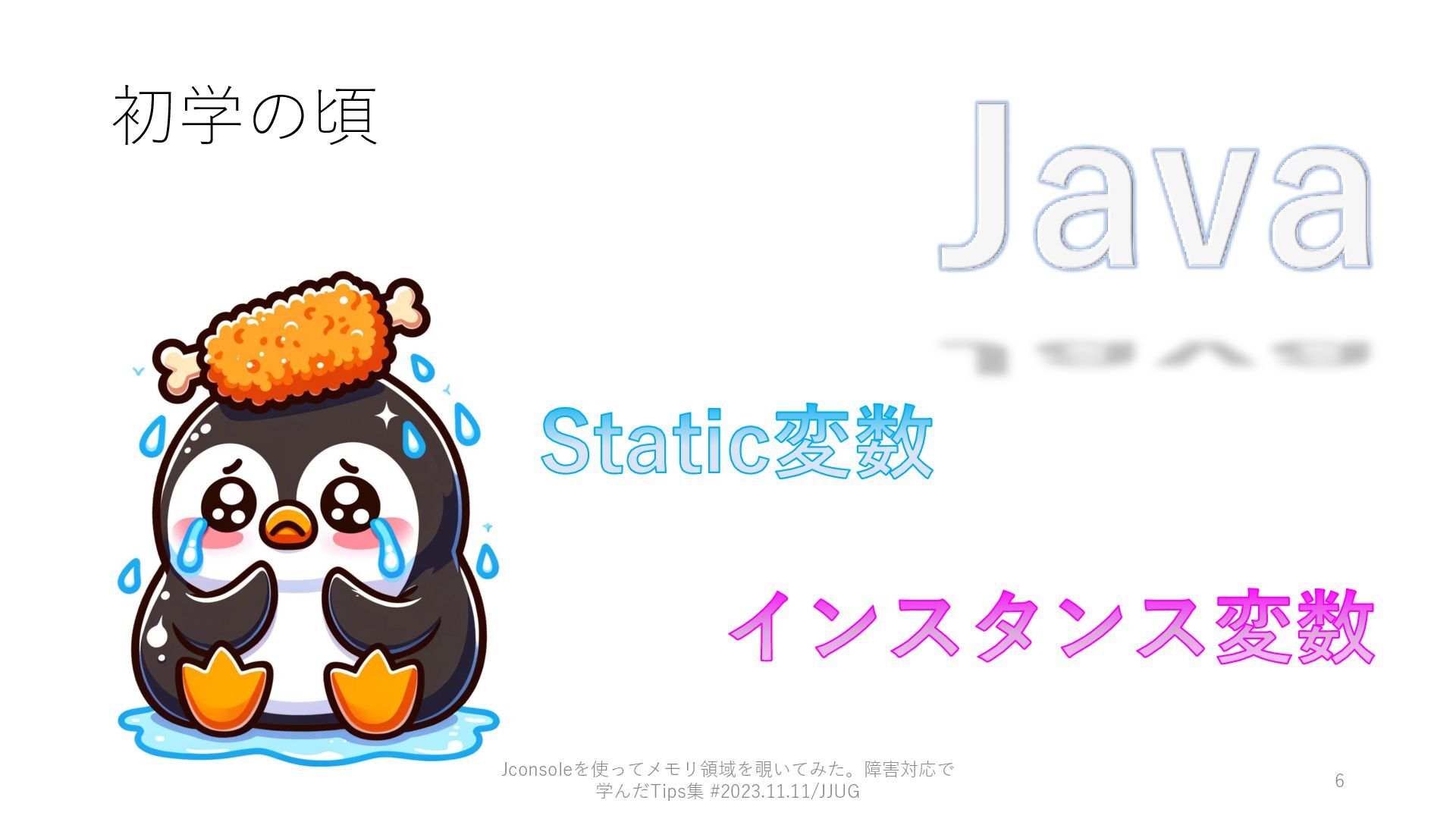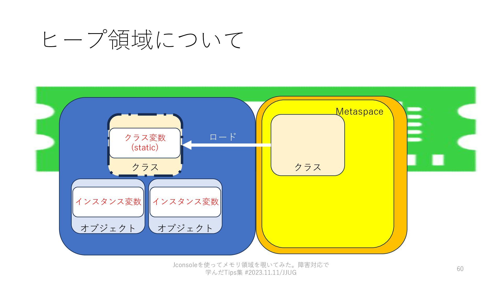 public int instanceCounter = 0;//インスタンス変数 public ExampleClass() { staticCounter++; instanceCounter++; } } public class TestClass { public static void main(String[] args) { ExampleClass obj1 = new ExampleClass(); ExampleClass obj2 = new ExampleClass(); } } System.out.println(obj2.staticCounter); System.out.println(obj2.instanceCounter); 実行結果 Staticカウント:2 インスタンスカウント:1 初学の頃 Jconsoleを使ってメモリ領域を覗いてみた。障害対応で 学んだTips集 #2023.11.11/JJUG 9