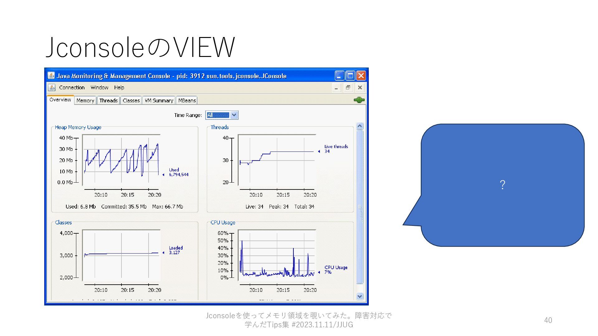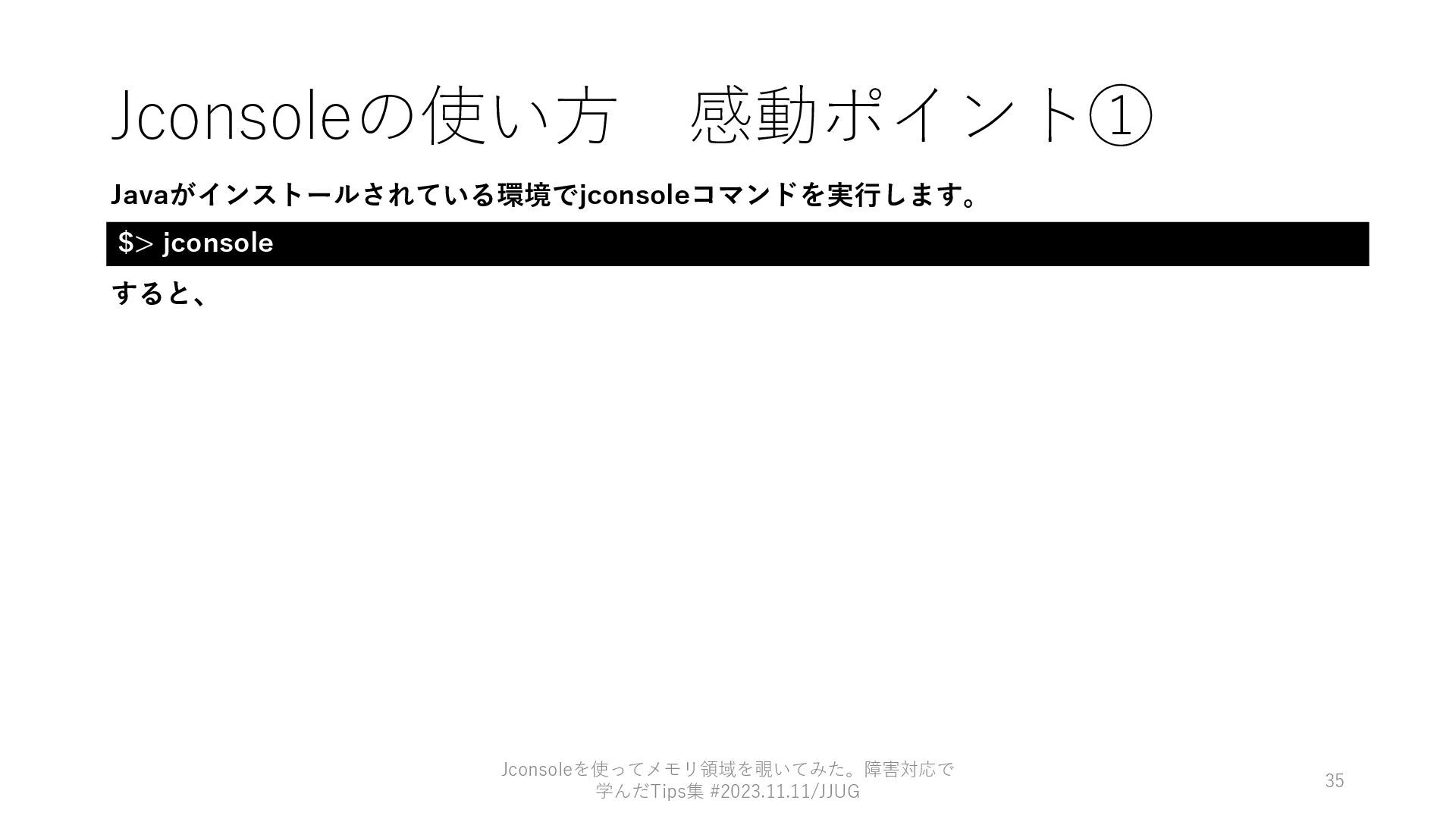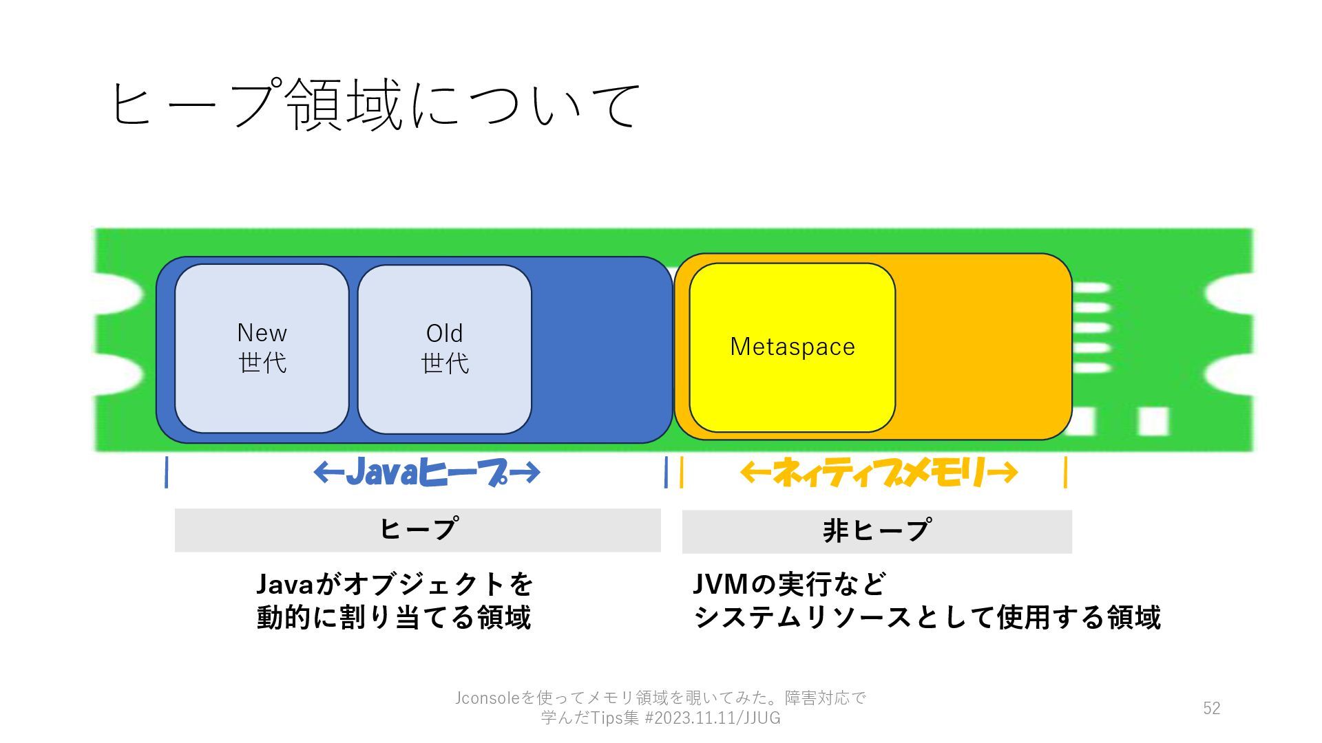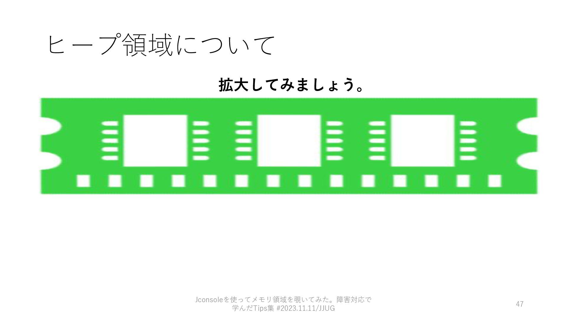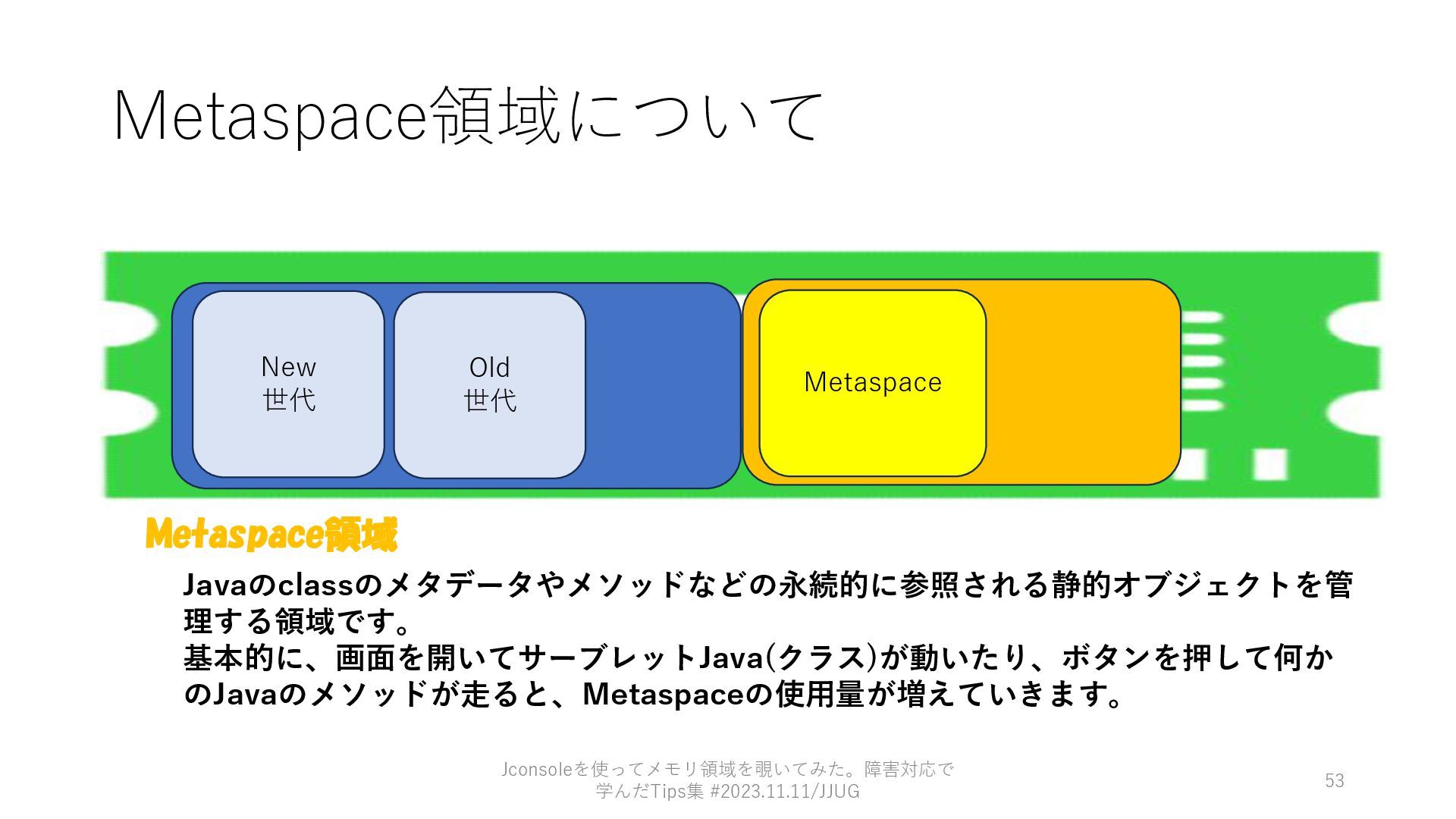 public int instanceCounter = 0;//インスタンス変数 public ExampleClass() { staticCounter++; instanceCounter++; } } public class TestClass { public static void main(String[] args) { ExampleClass obj1 = new ExampleClass(); ExampleClass obj2 = new ExampleClass(); } } System.out.println(obj2.staticCounter); System.out.println(obj2.instanceCounter); 実行結果 Staticカウント:2 インスタンスカウント:1 初学の頃 Jconsoleを使ってメモリ領域を覗いてみた。障害対応で 学んだTips集 #2023.11.11/JJUG 9