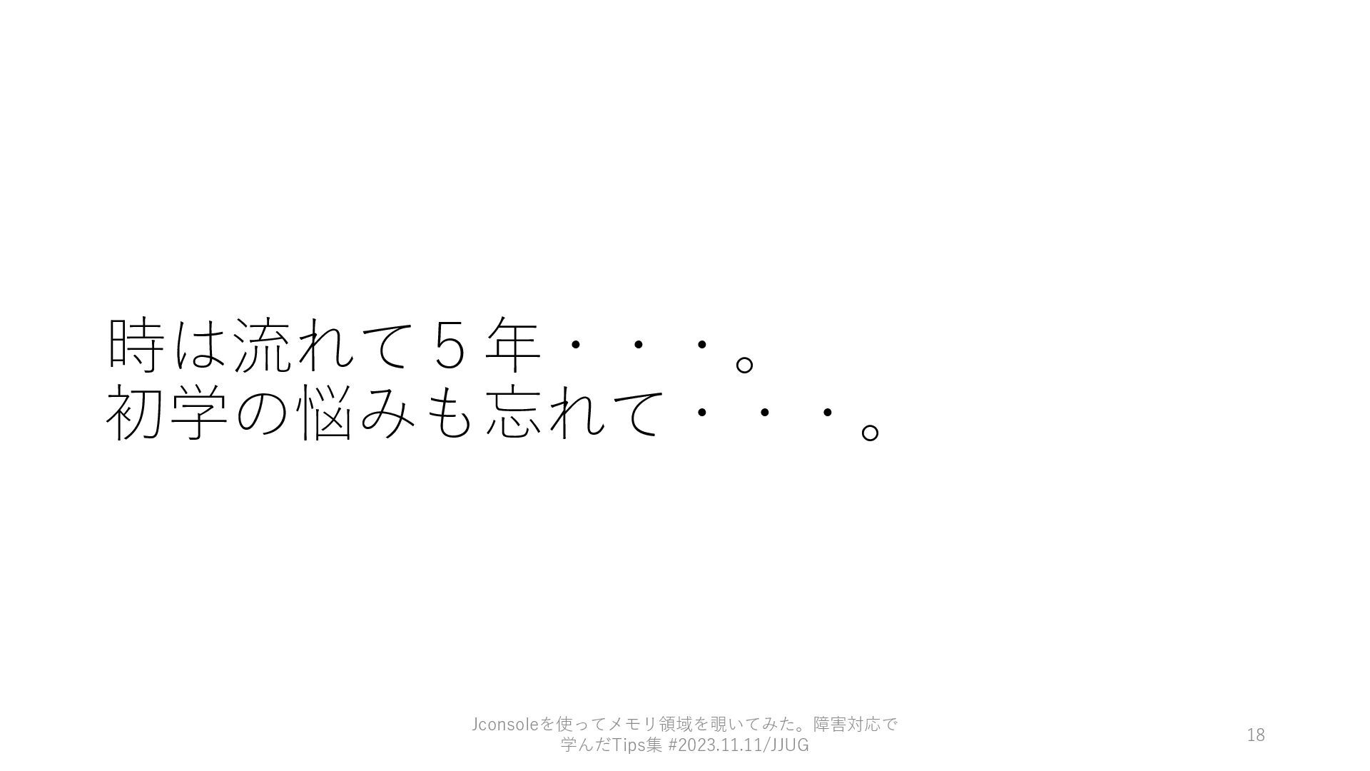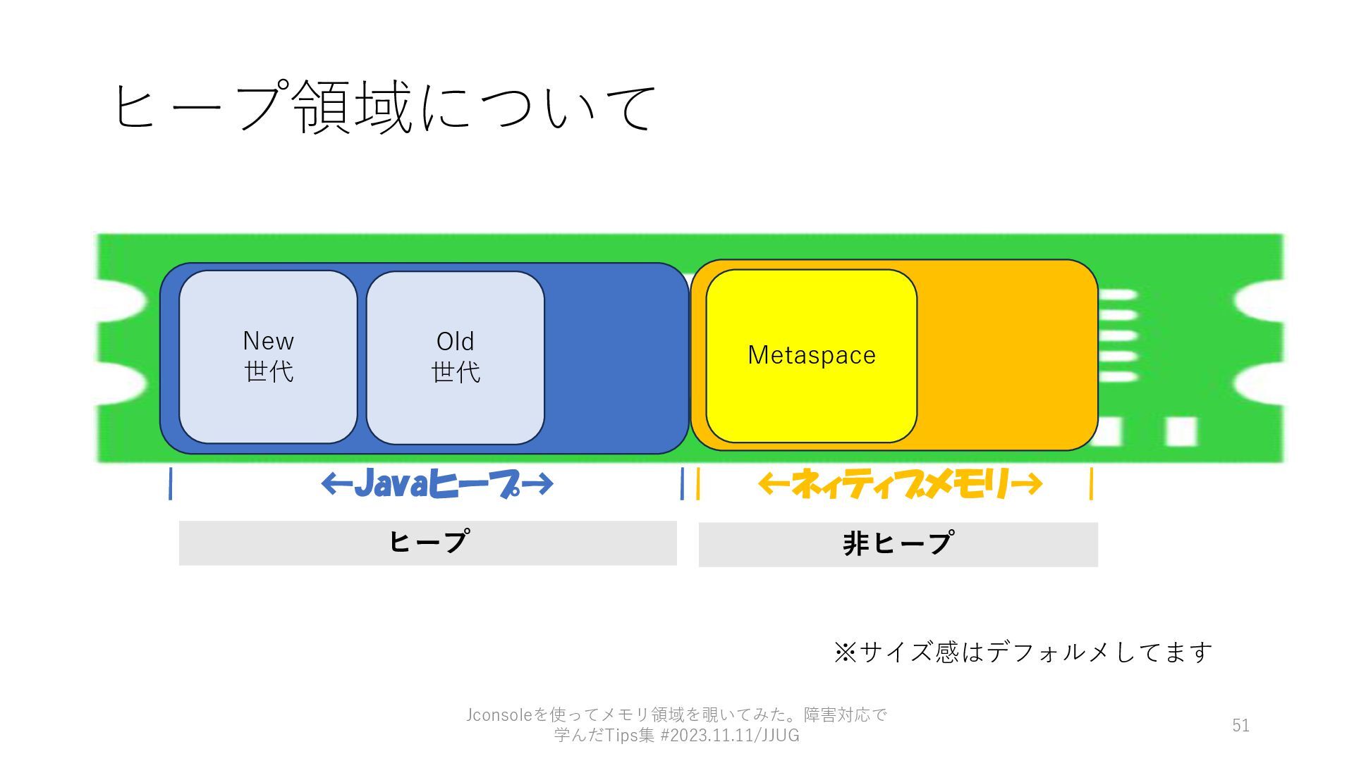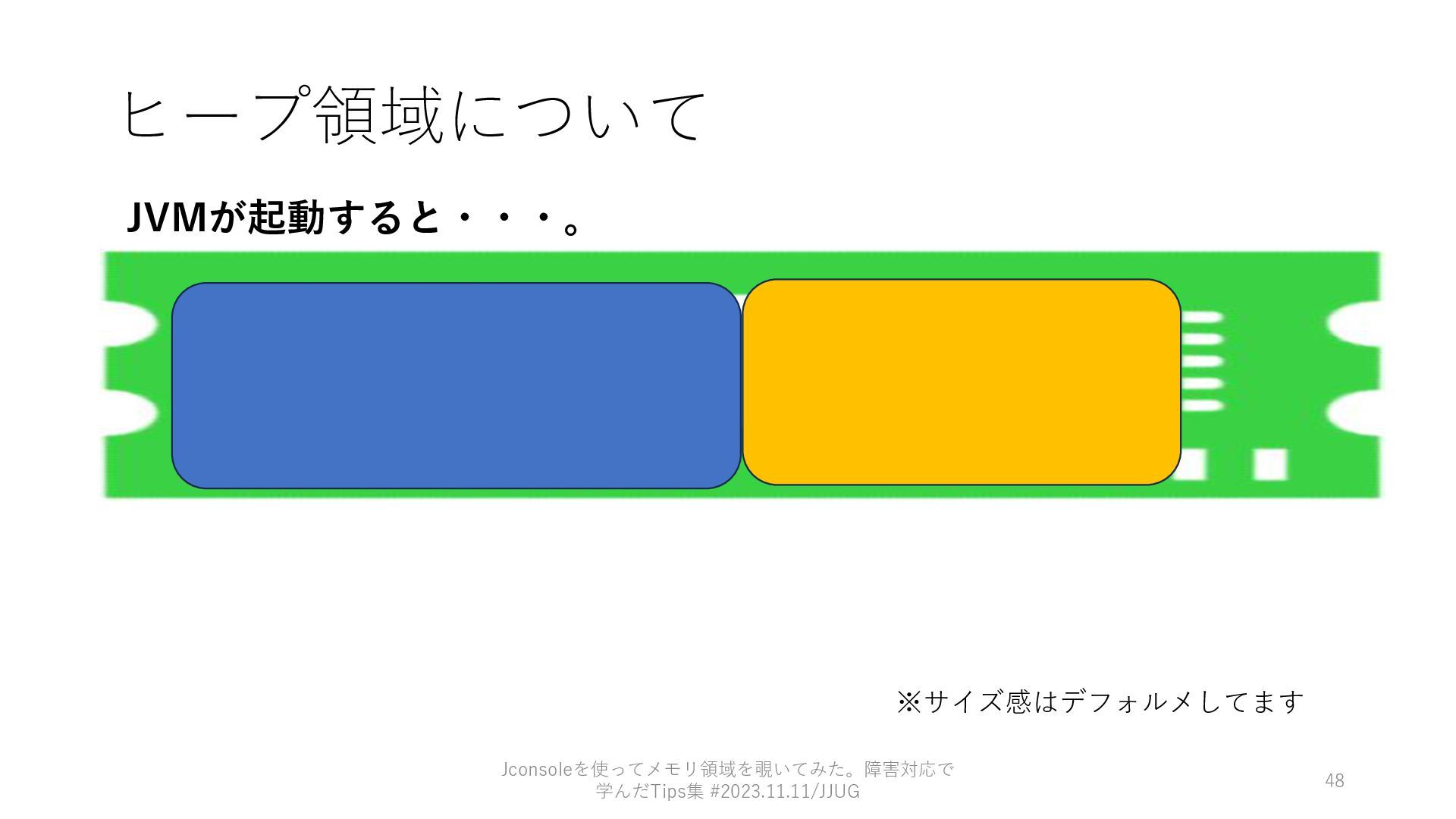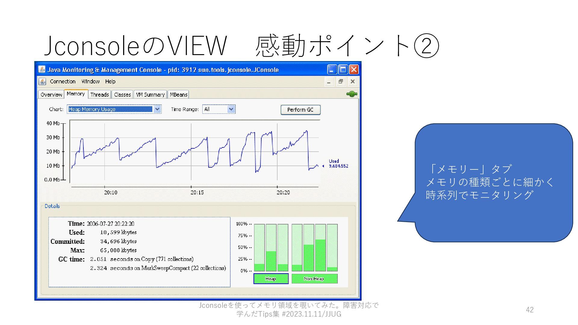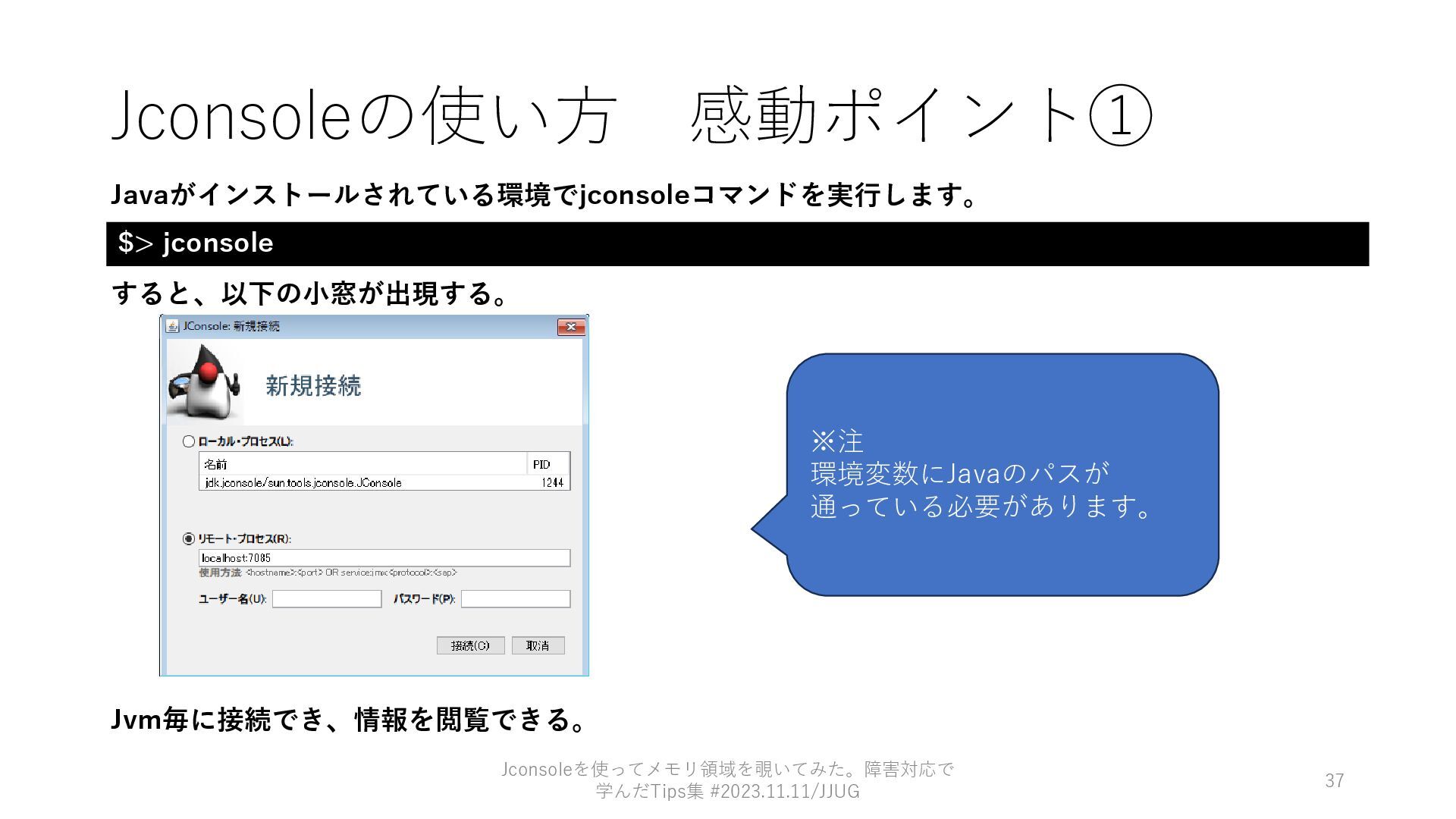 public int instanceCounter = 0;//インスタンス変数 public ExampleClass() { staticCounter++; instanceCounter++; } } public class TestClass { public static void main(String[] args) { ExampleClass obj1 = new ExampleClass(); ExampleClass obj2 = new ExampleClass(); } } System.out.println(obj2.staticCounter); System.out.println(obj2.instanceCounter); 実行結果 Staticカウント:2 インスタンスカウント:1 初学の頃 Jconsoleを使ってメモリ領域を覗いてみた。障害対応で 学んだTips集 #2023.11.11/JJUG 9