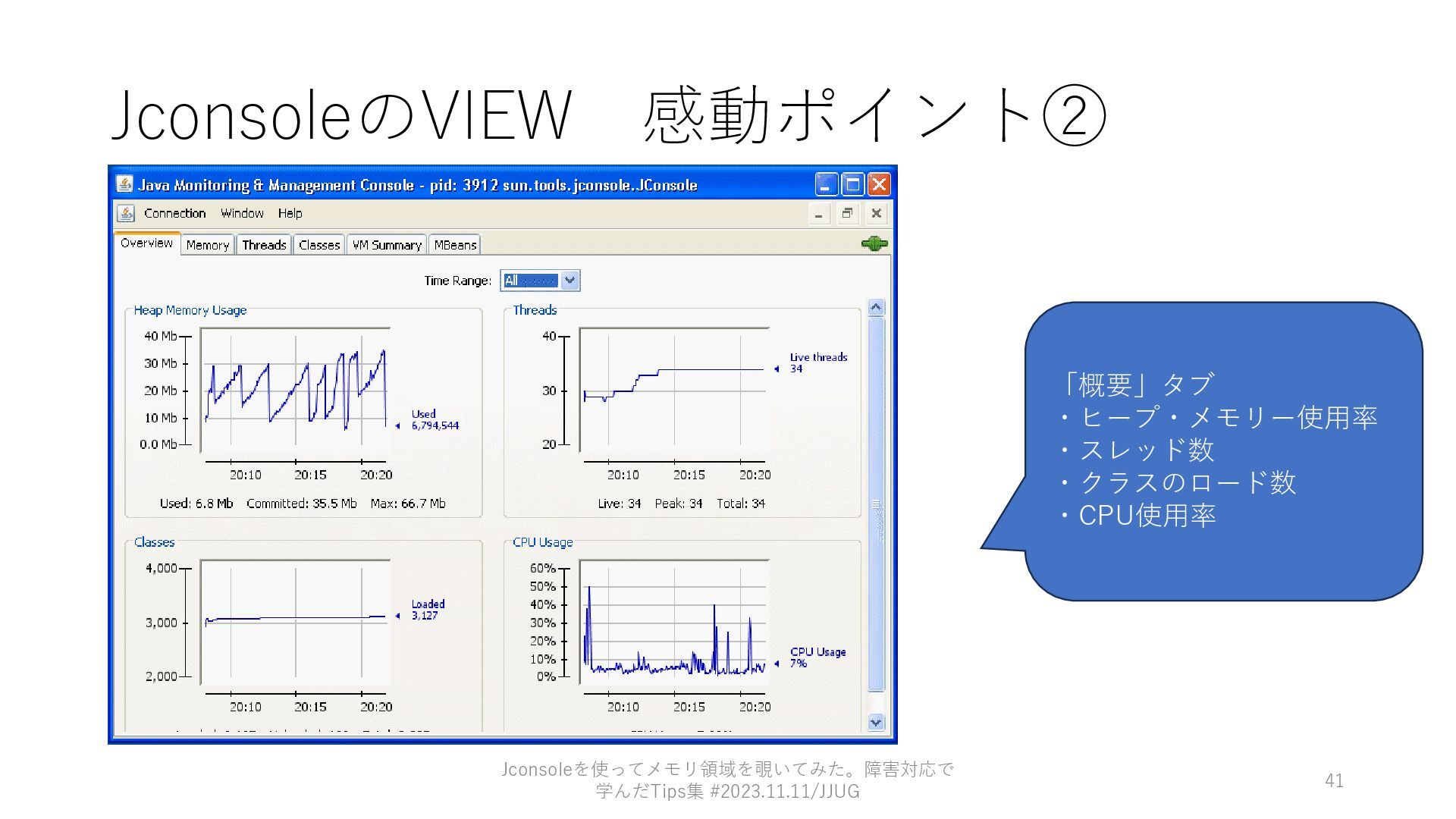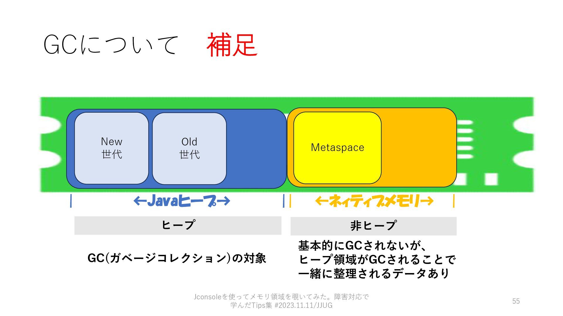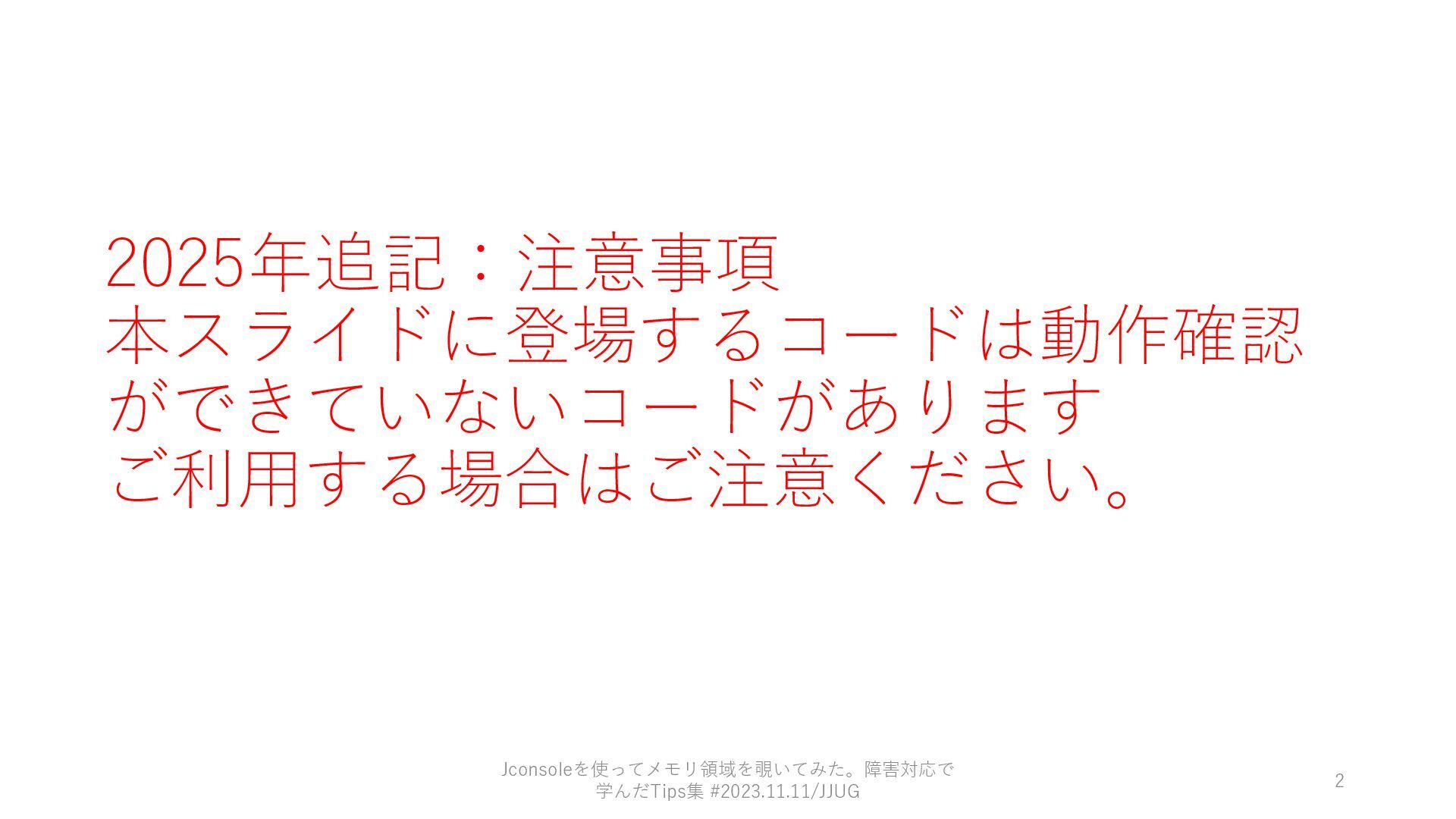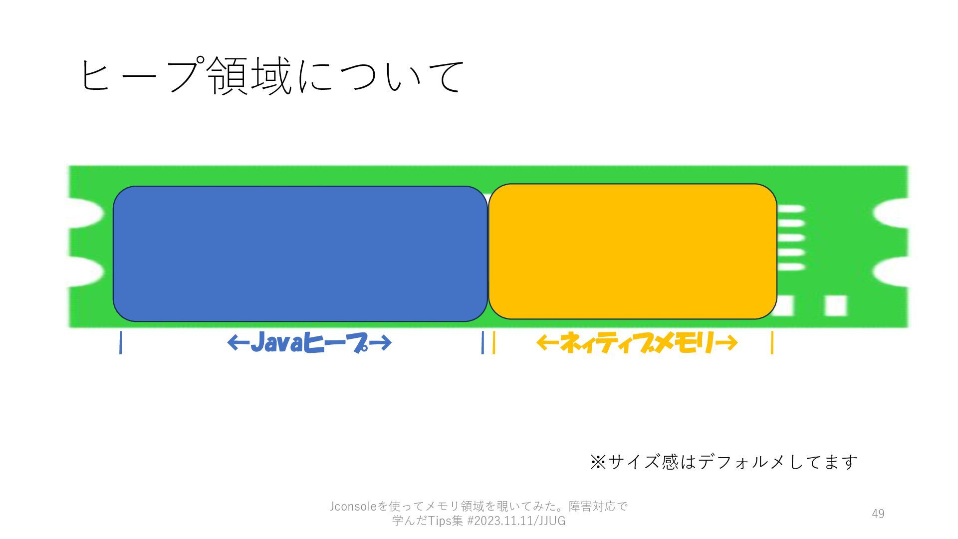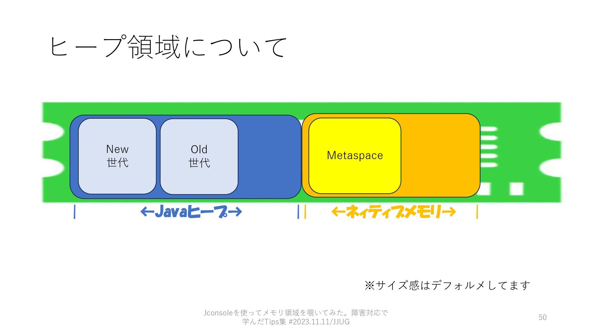 public int instanceCounter = 0;//インスタンス変数 public ExampleClass() { staticCounter++; instanceCounter++; } } public class TestClass { public static void main(String[] args) { ExampleClass obj1 = new ExampleClass(); ExampleClass obj2 = new ExampleClass(); } } System.out.println(obj2.staticCounter); System.out.println(obj2.instanceCounter); 実行結果 Staticカウント:2 インスタンスカウント:1 初学の頃 Jconsoleを使ってメモリ領域を覗いてみた。障害対応で 学んだTips集 #2023.11.11/JJUG 9