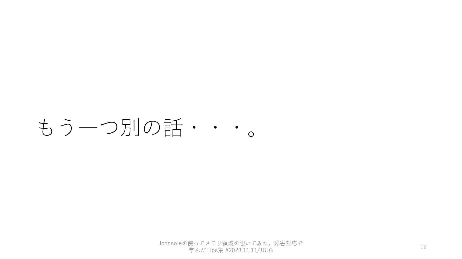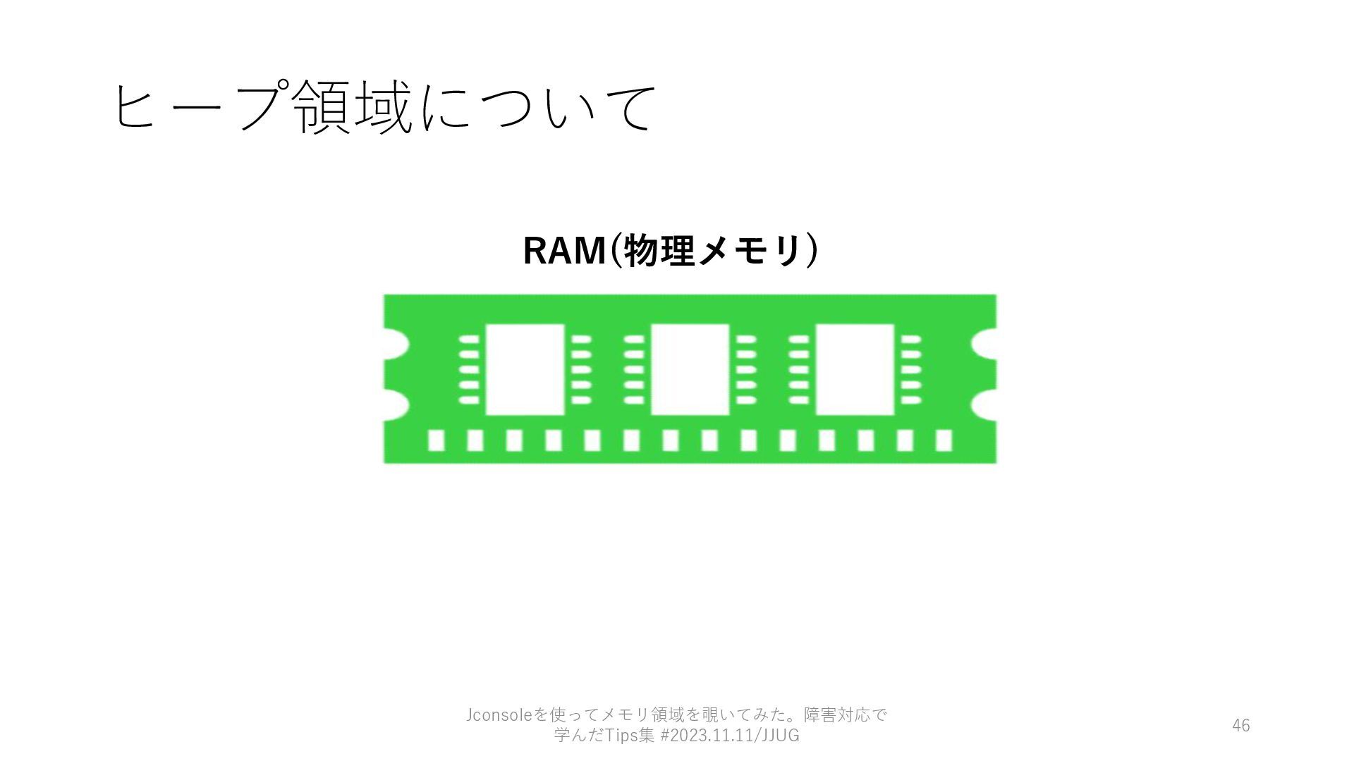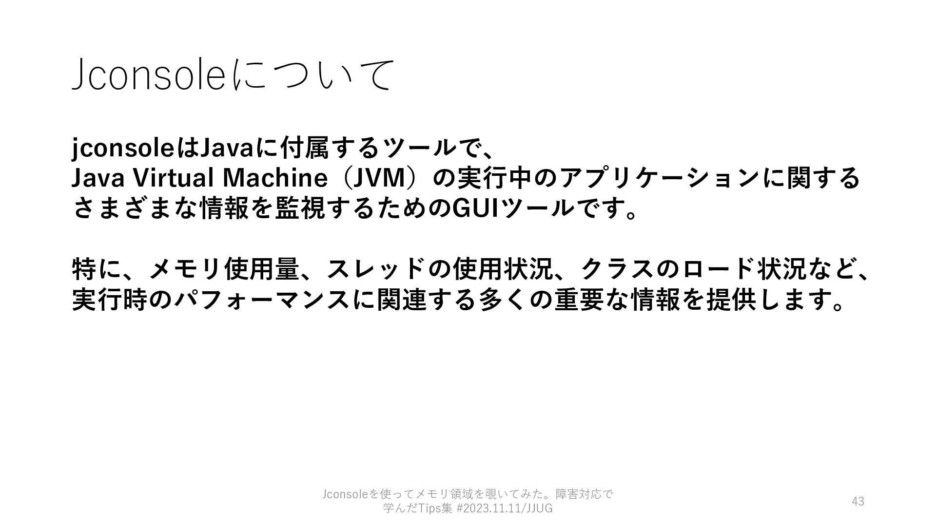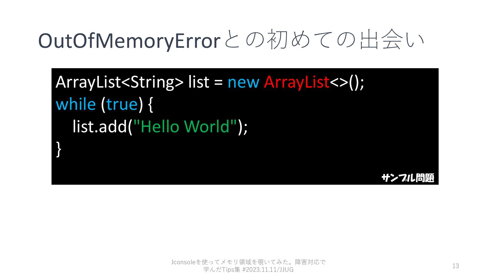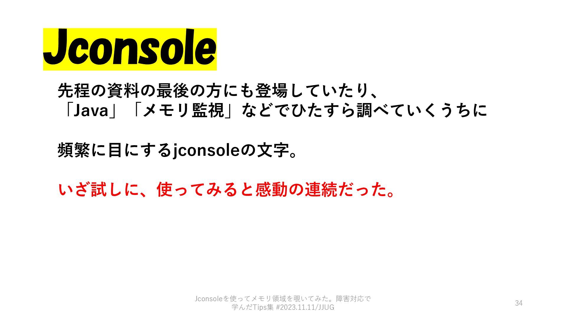 public int instanceCounter = 0;//インスタンス変数 public ExampleClass() { staticCounter++; instanceCounter++; } } public class TestClass { public static void main(String[] args) { ExampleClass obj1 = new ExampleClass(); ExampleClass obj2 = new ExampleClass(); } } System.out.println(obj2.staticCounter); System.out.println(obj2.instanceCounter); 実行結果 Staticカウント:2 インスタンスカウント:1 初学の頃 Jconsoleを使ってメモリ領域を覗いてみた。障害対応で 学んだTips集 #2023.11.11/JJUG 9