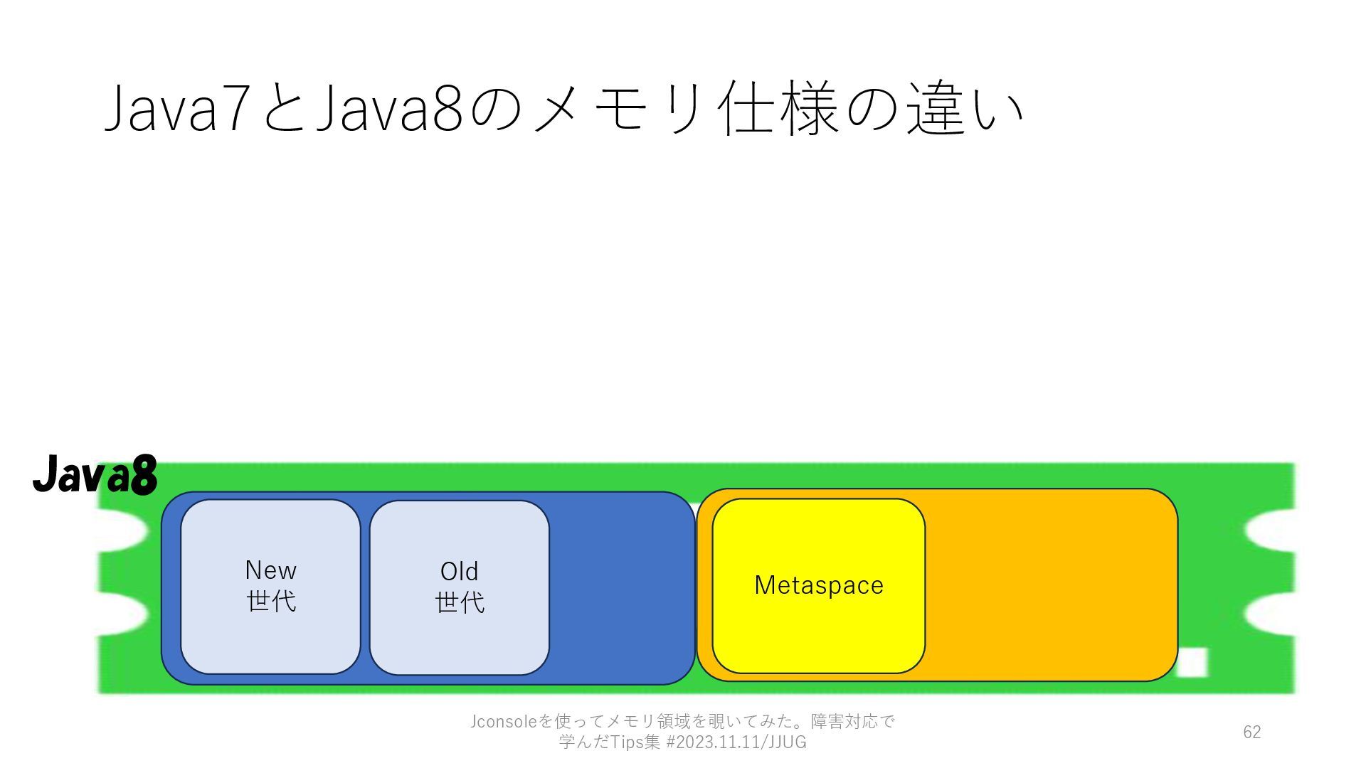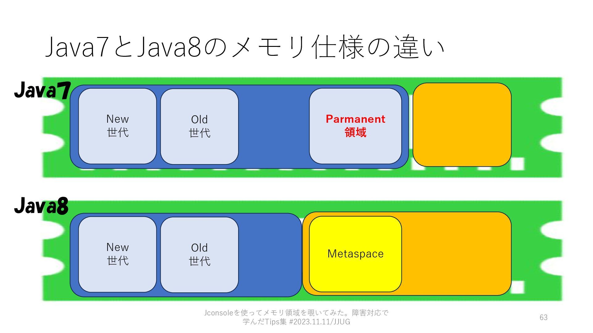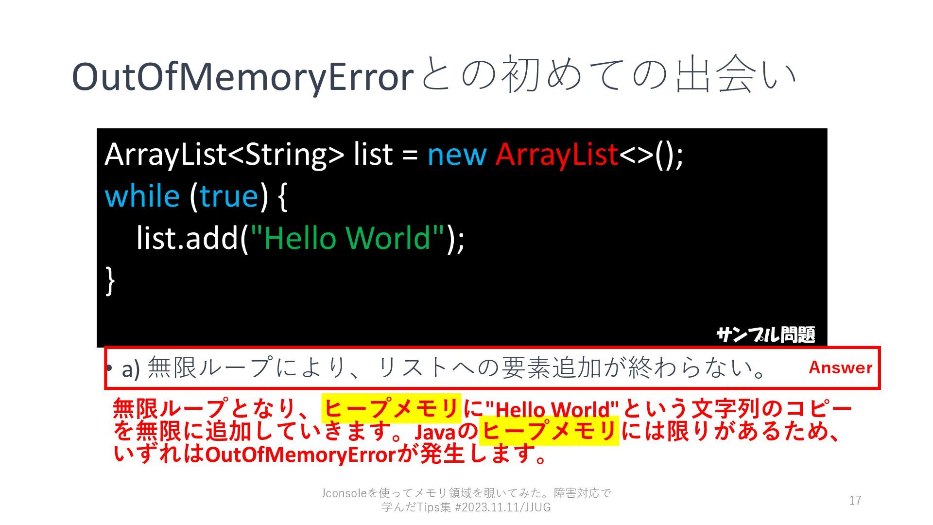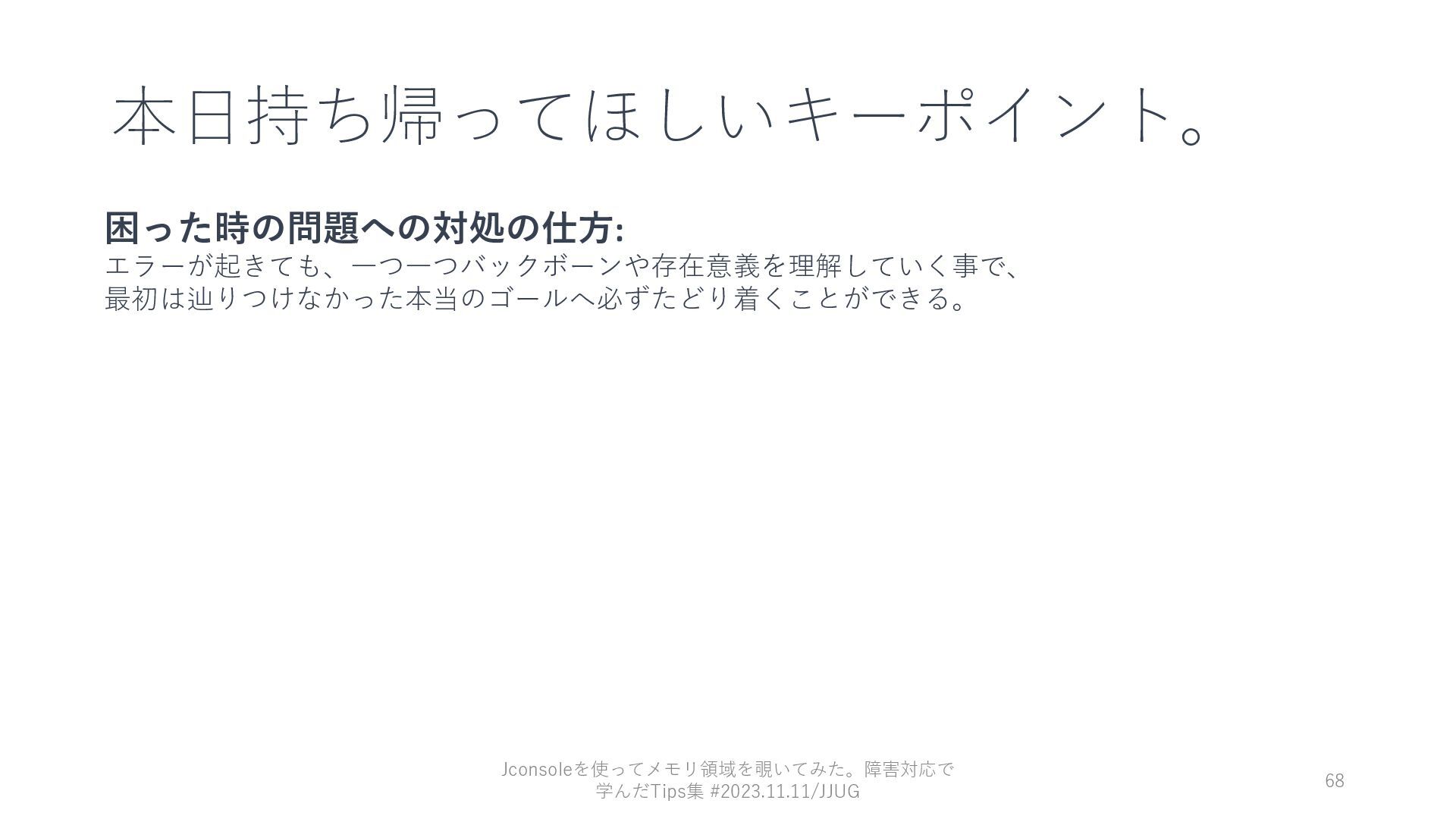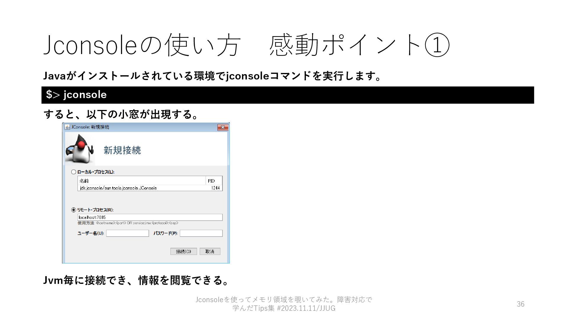public int instanceCounter = 0;//インスタンス変数 public ExampleClass() { staticCounter++; instanceCounter++; } } public class TestClass { public static void main(String[] args) { ExampleClass obj1 = new ExampleClass(); ExampleClass obj2 = new ExampleClass(); } } System.out.println(obj2.staticCounter); System.out.println(obj2.instanceCounter); 実行結果 Staticカウント:2 インスタンスカウント:1 初学の頃 Jconsoleを使ってメモリ領域を覗いてみた。障害対応で 学んだTips集 #2023.11.11/JJUG 9