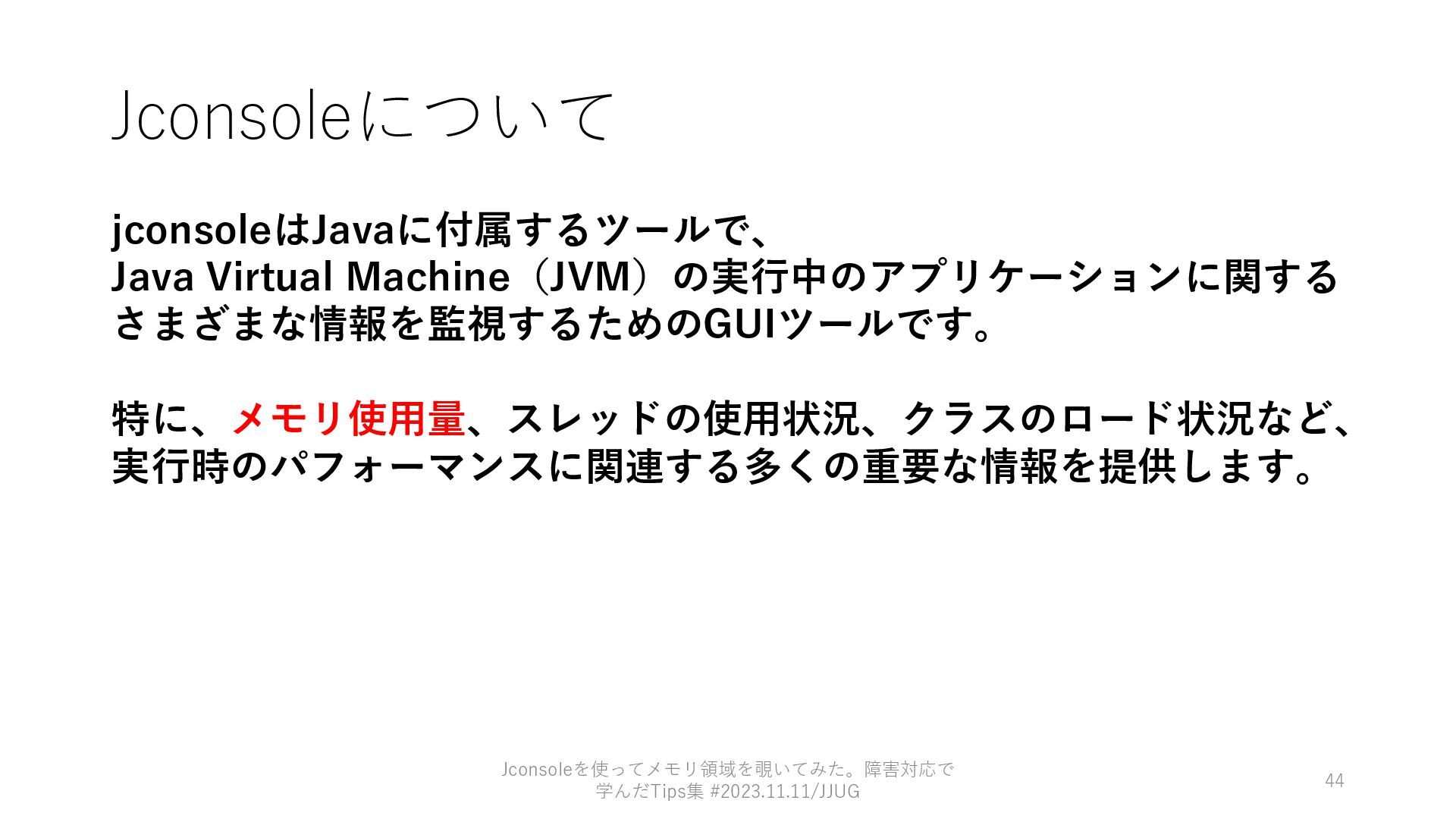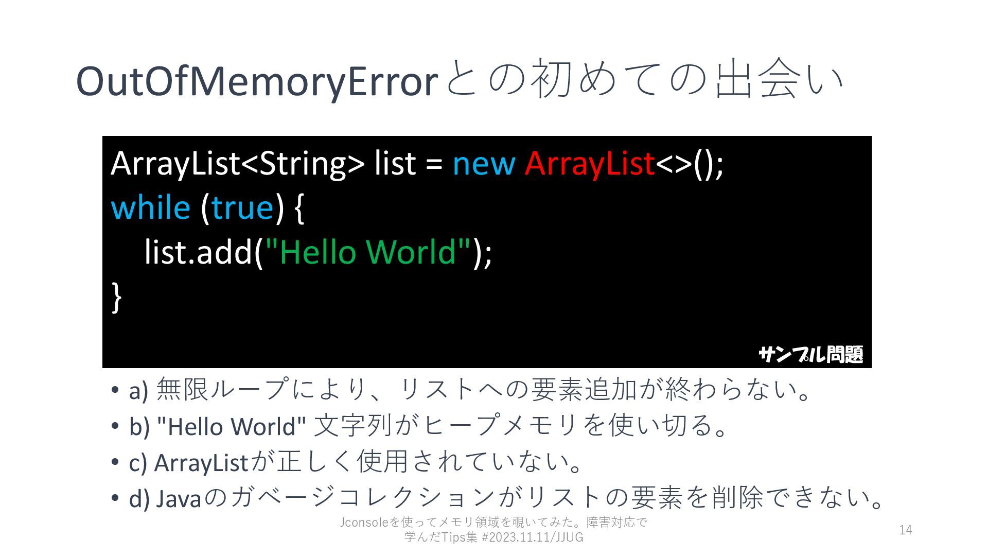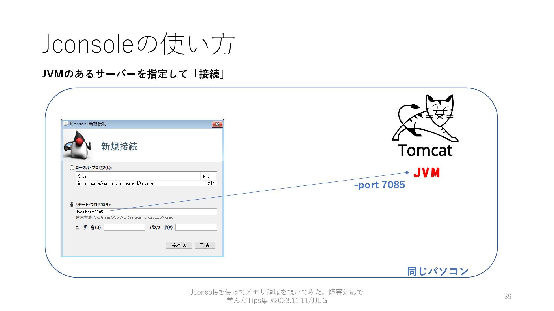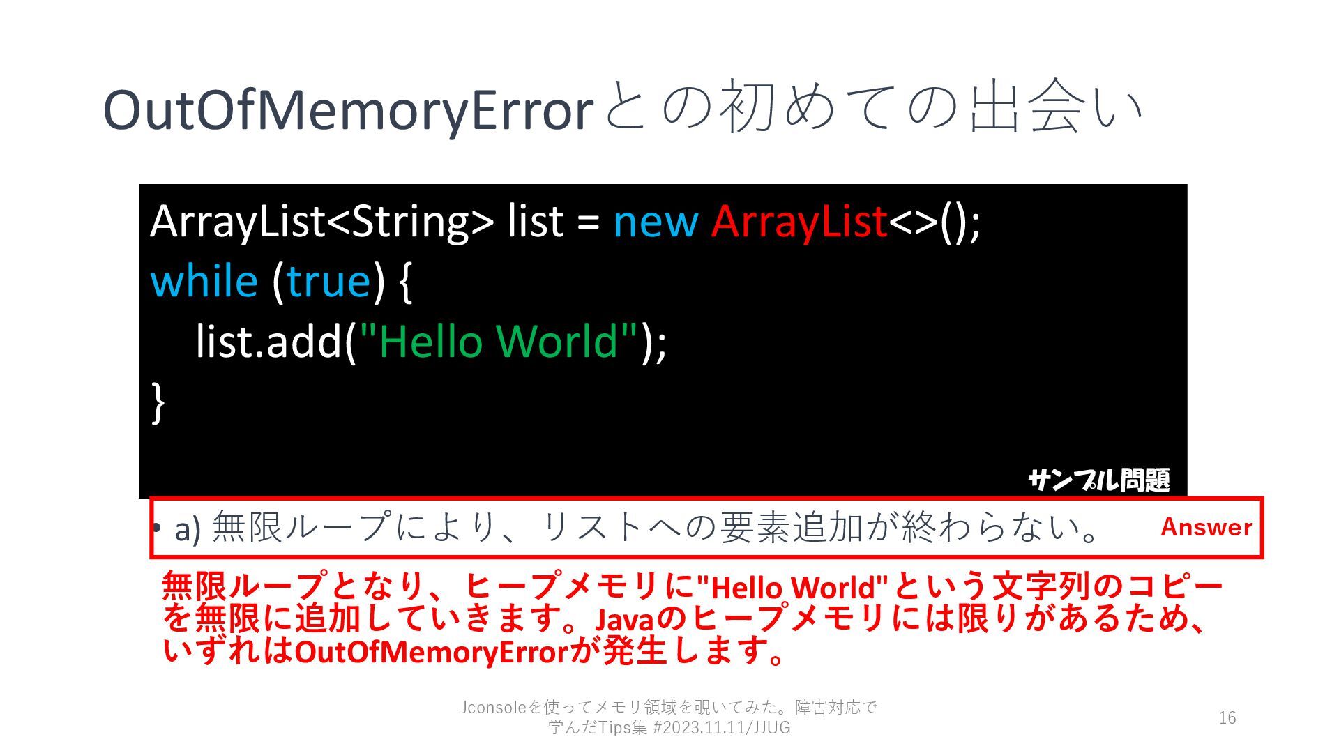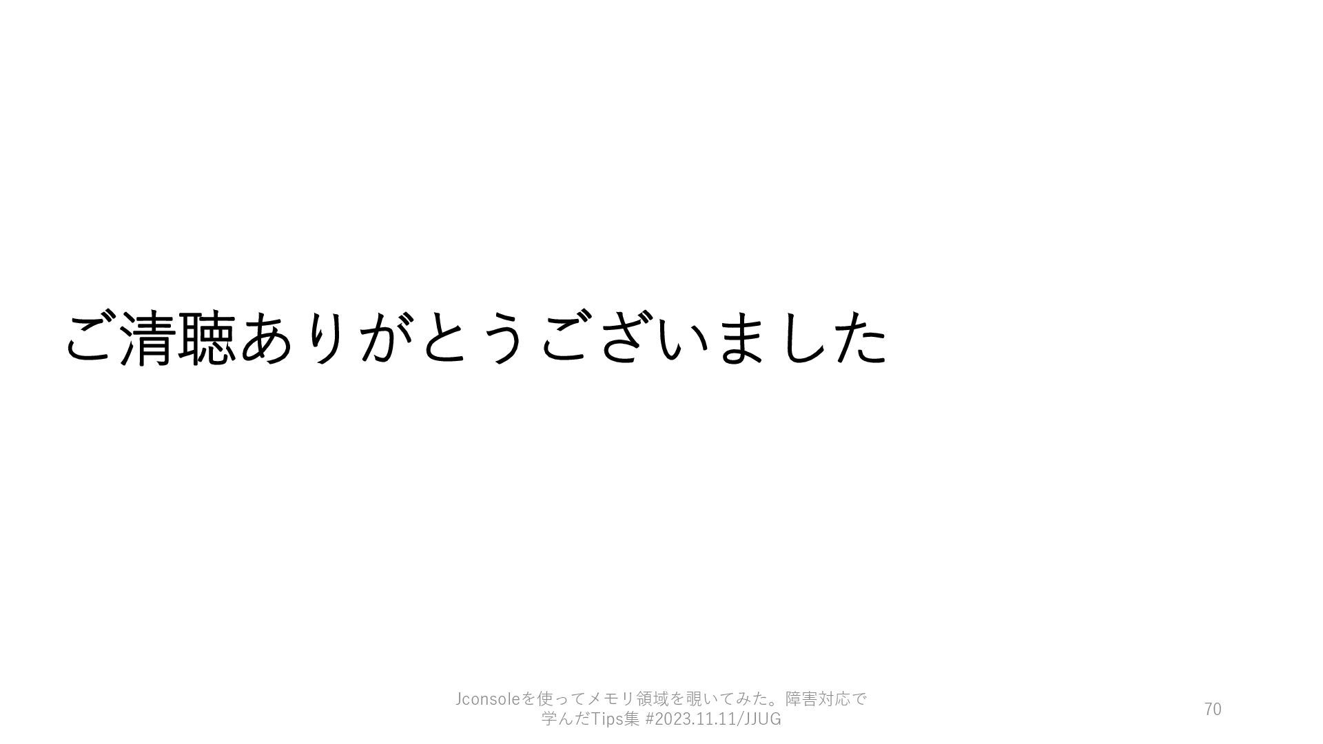 public int instanceCounter = 0;//インスタンス変数 public ExampleClass() { staticCounter++; instanceCounter++; } } public class TestClass { public static void main(String[] args) { ExampleClass obj1 = new ExampleClass(); ExampleClass obj2 = new ExampleClass(); } } System.out.println(obj2.staticCounter); System.out.println(obj2.instanceCounter); 実行結果 Staticカウント:2 インスタンスカウント:1 初学の頃 Jconsoleを使ってメモリ領域を覗いてみた。障害対応で 学んだTips集 #2023.11.11/JJUG 9