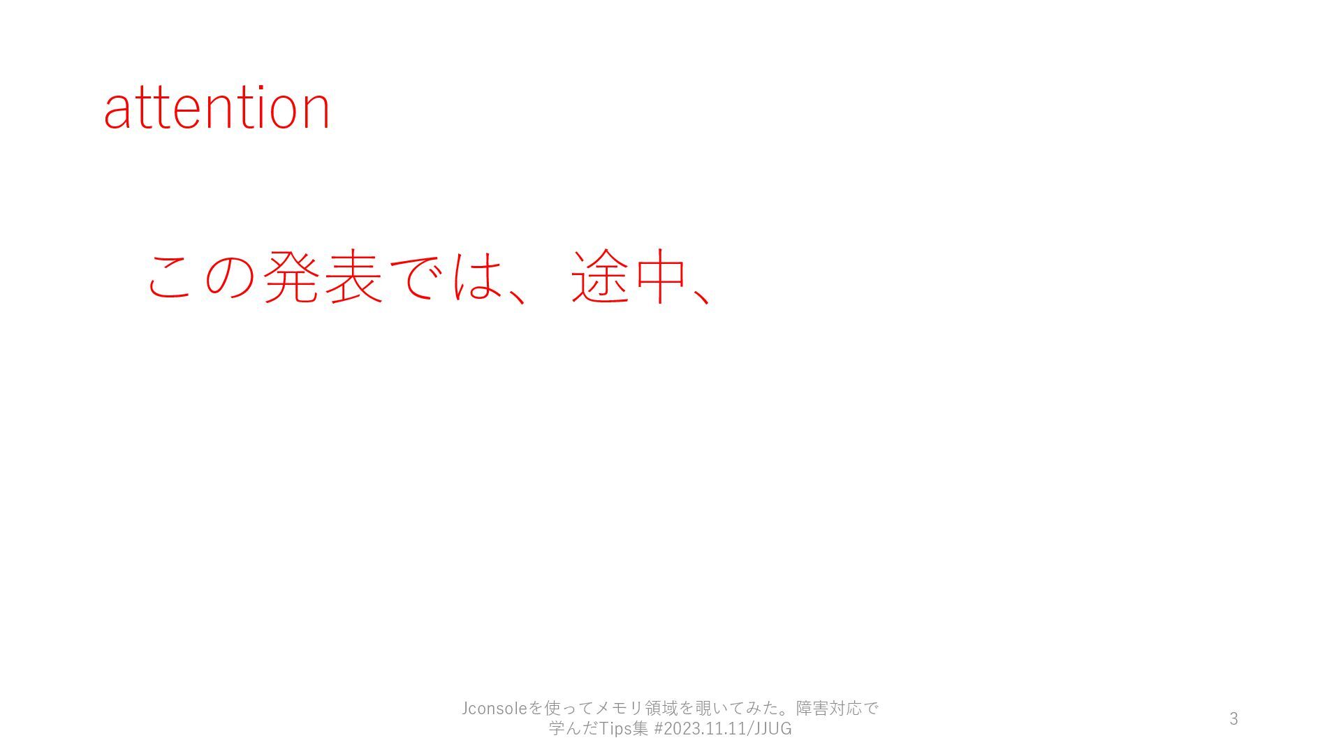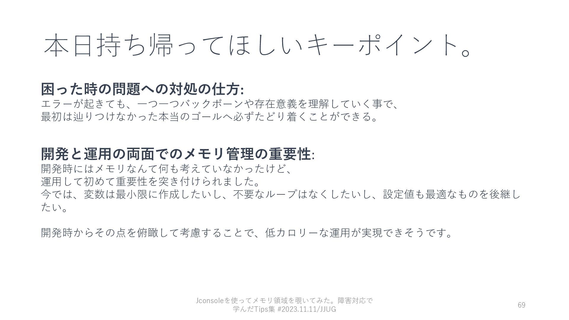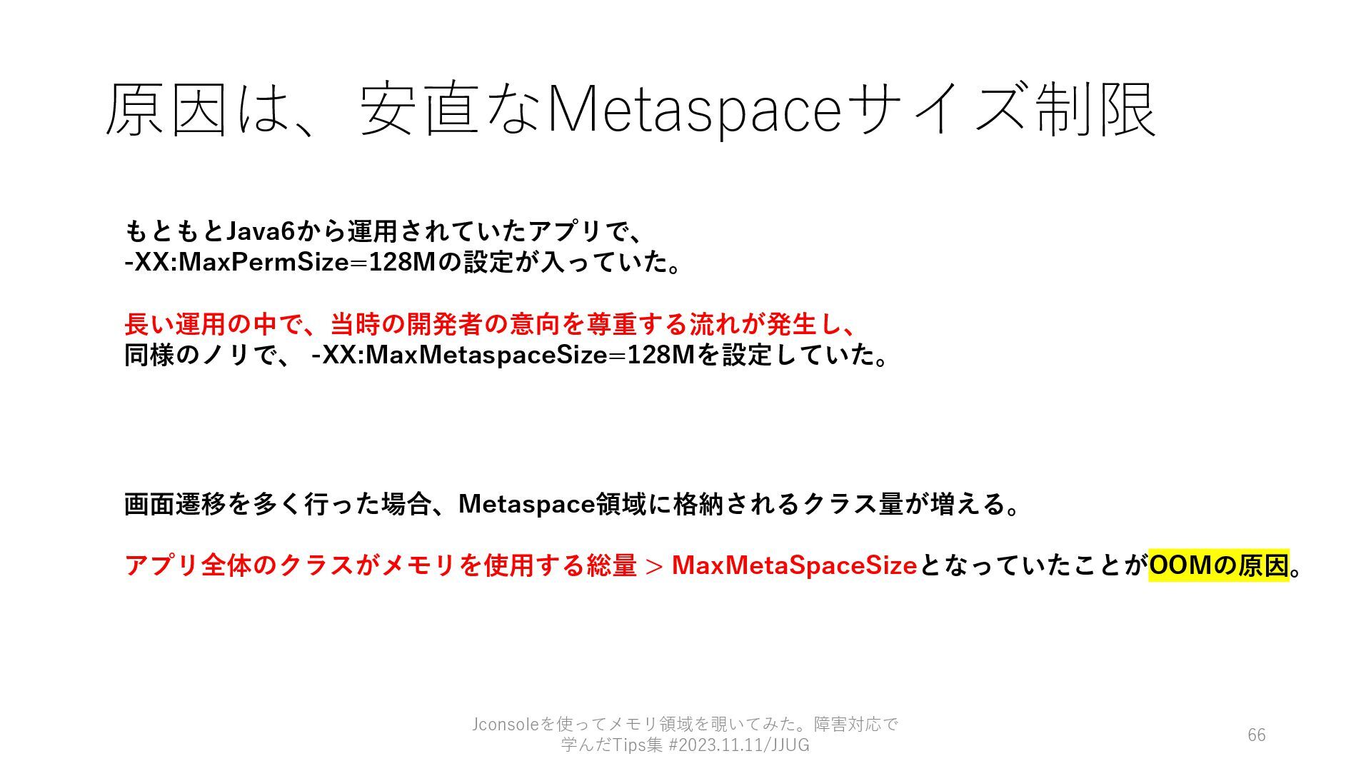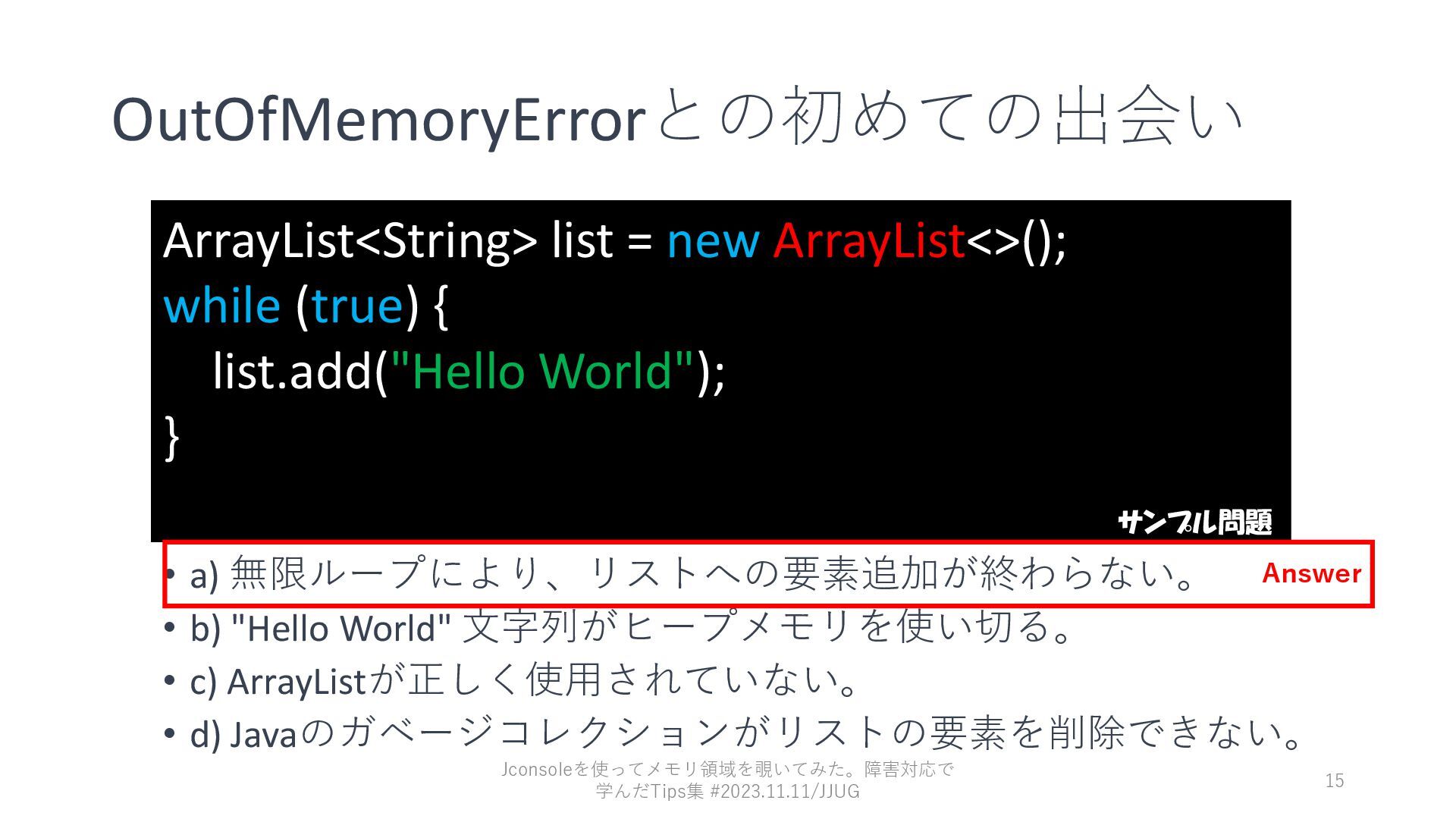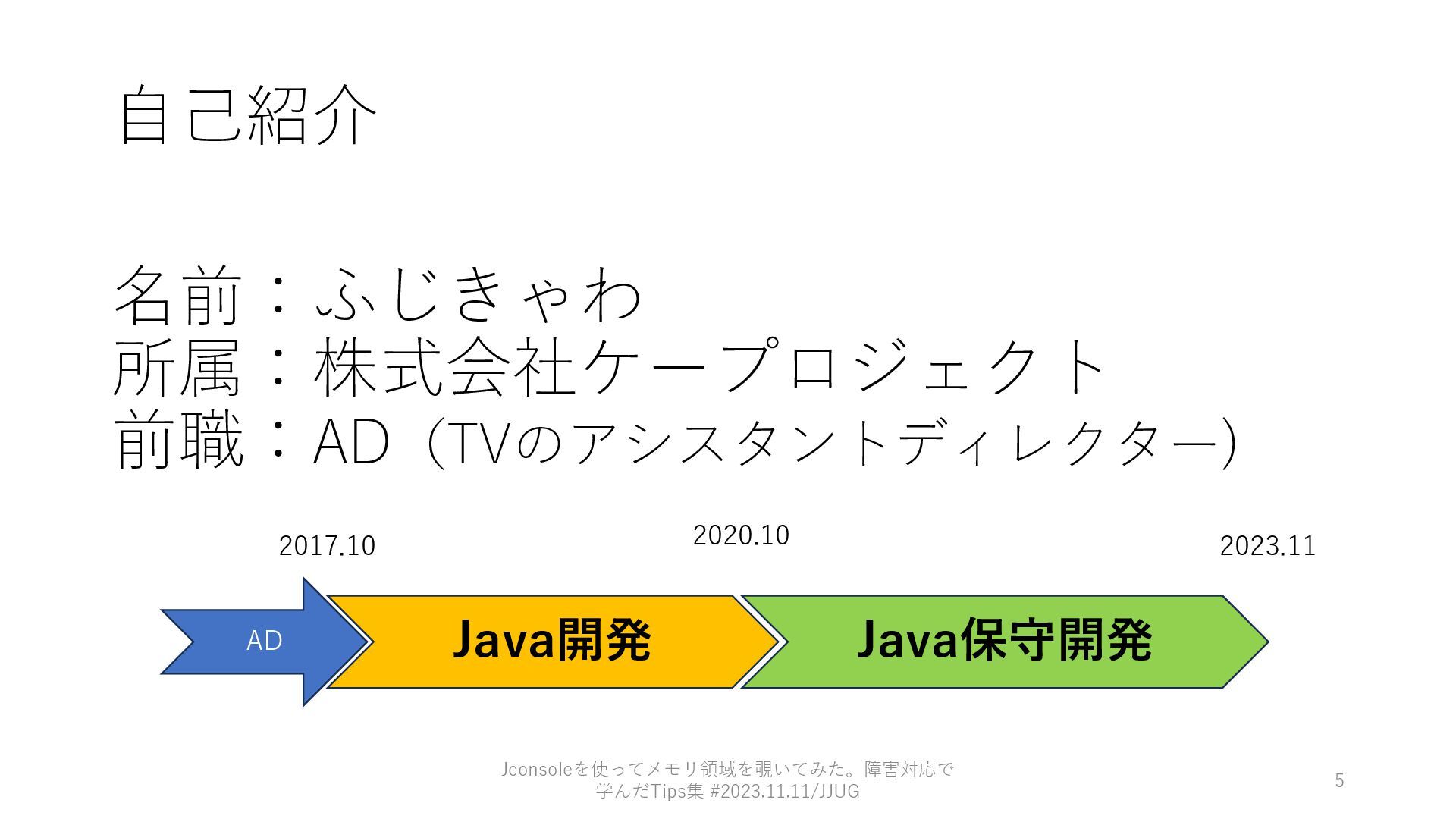 public int instanceCounter = 0;//インスタンス変数 public ExampleClass() { staticCounter++; instanceCounter++; } } public class TestClass { public static void main(String[] args) { ExampleClass obj1 = new ExampleClass(); ExampleClass obj2 = new ExampleClass(); } } System.out.println(obj2.staticCounter); System.out.println(obj2.instanceCounter); 実行結果 Staticカウント:2 インスタンスカウント:1 初学の頃 Jconsoleを使ってメモリ領域を覗いてみた。障害対応で 学んだTips集 #2023.11.11/JJUG 9