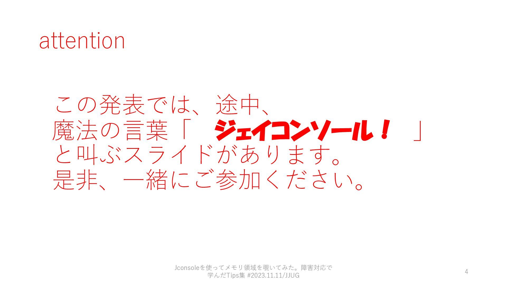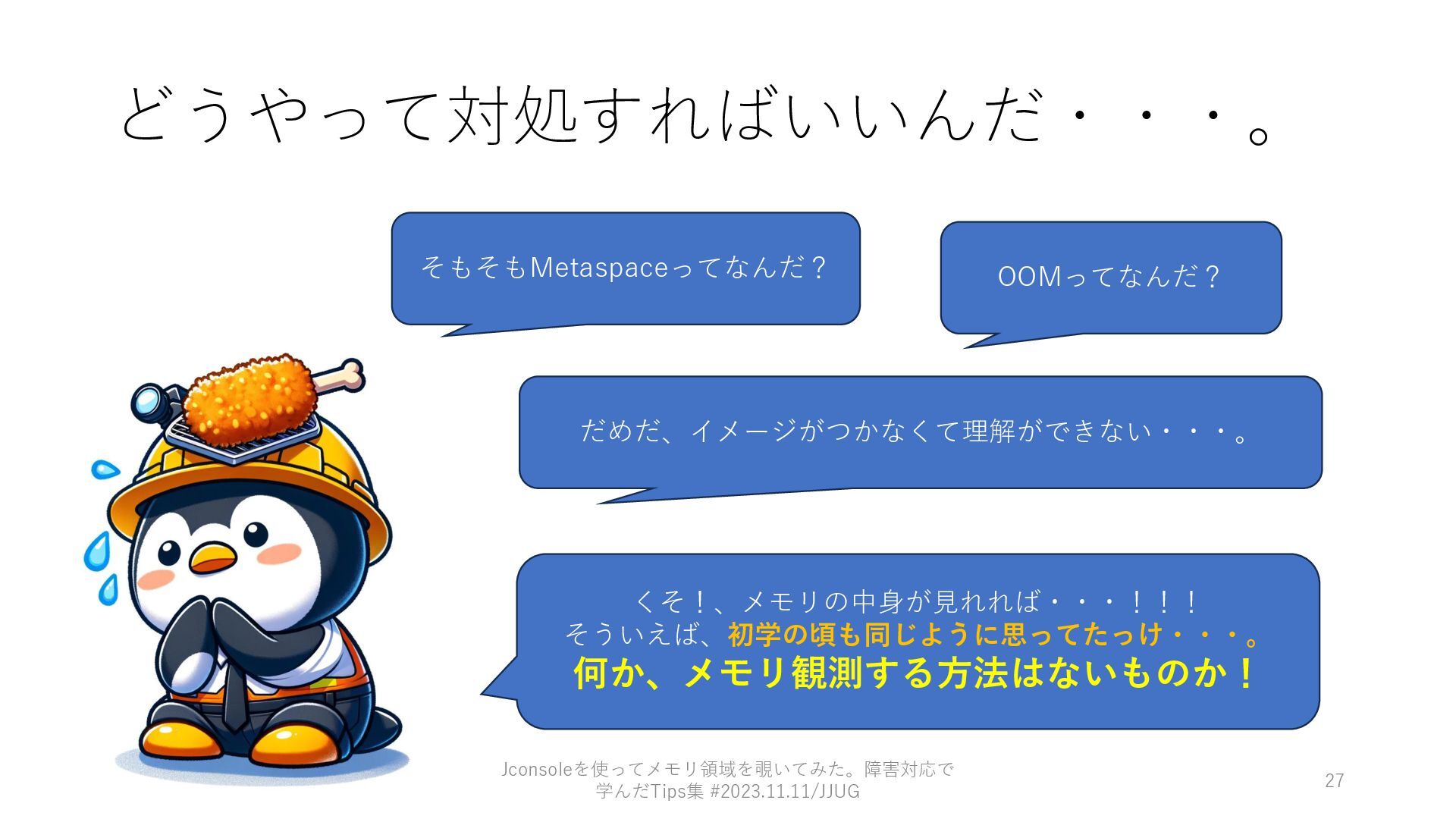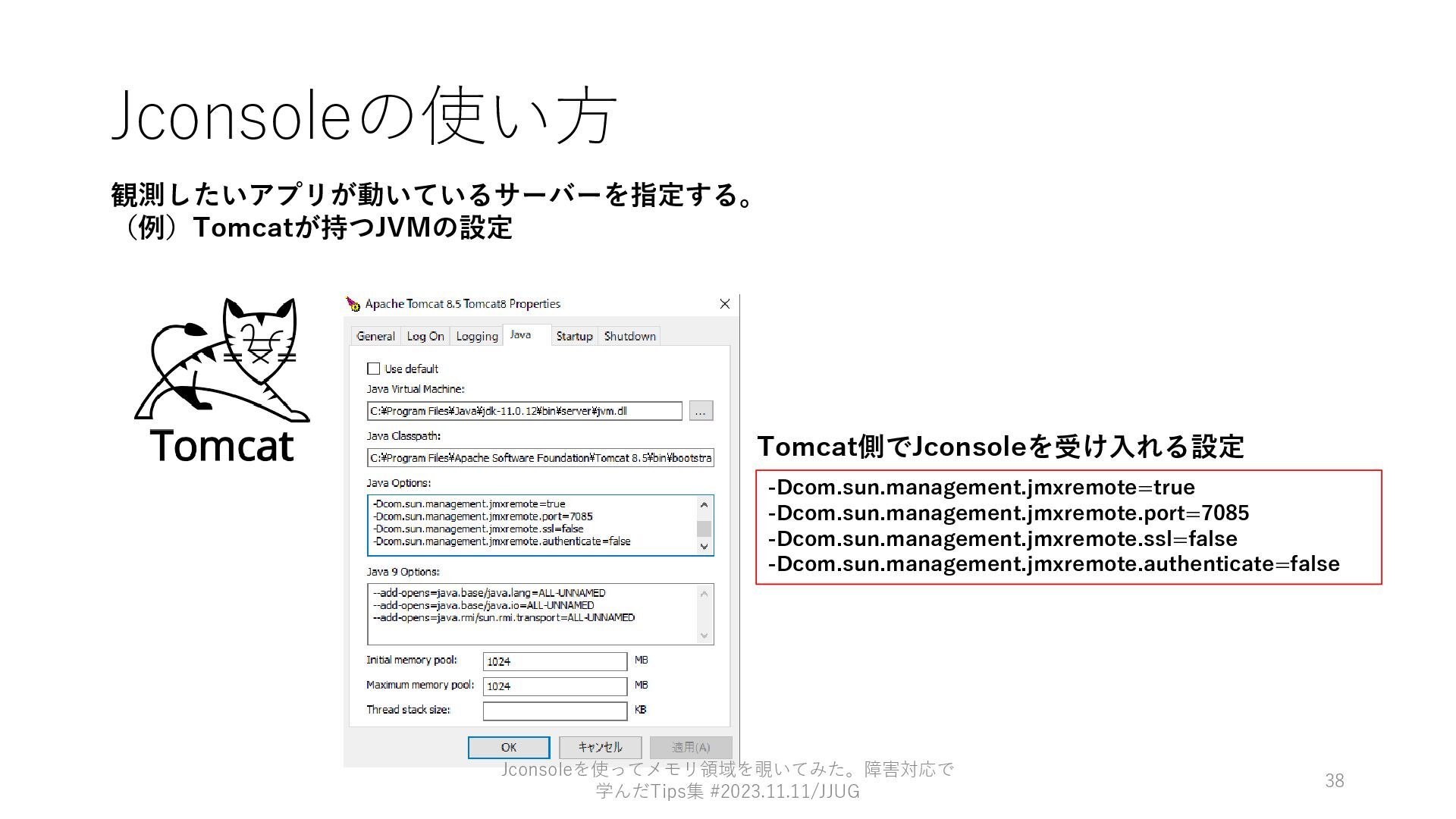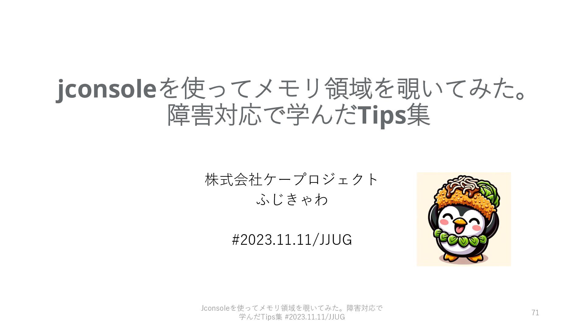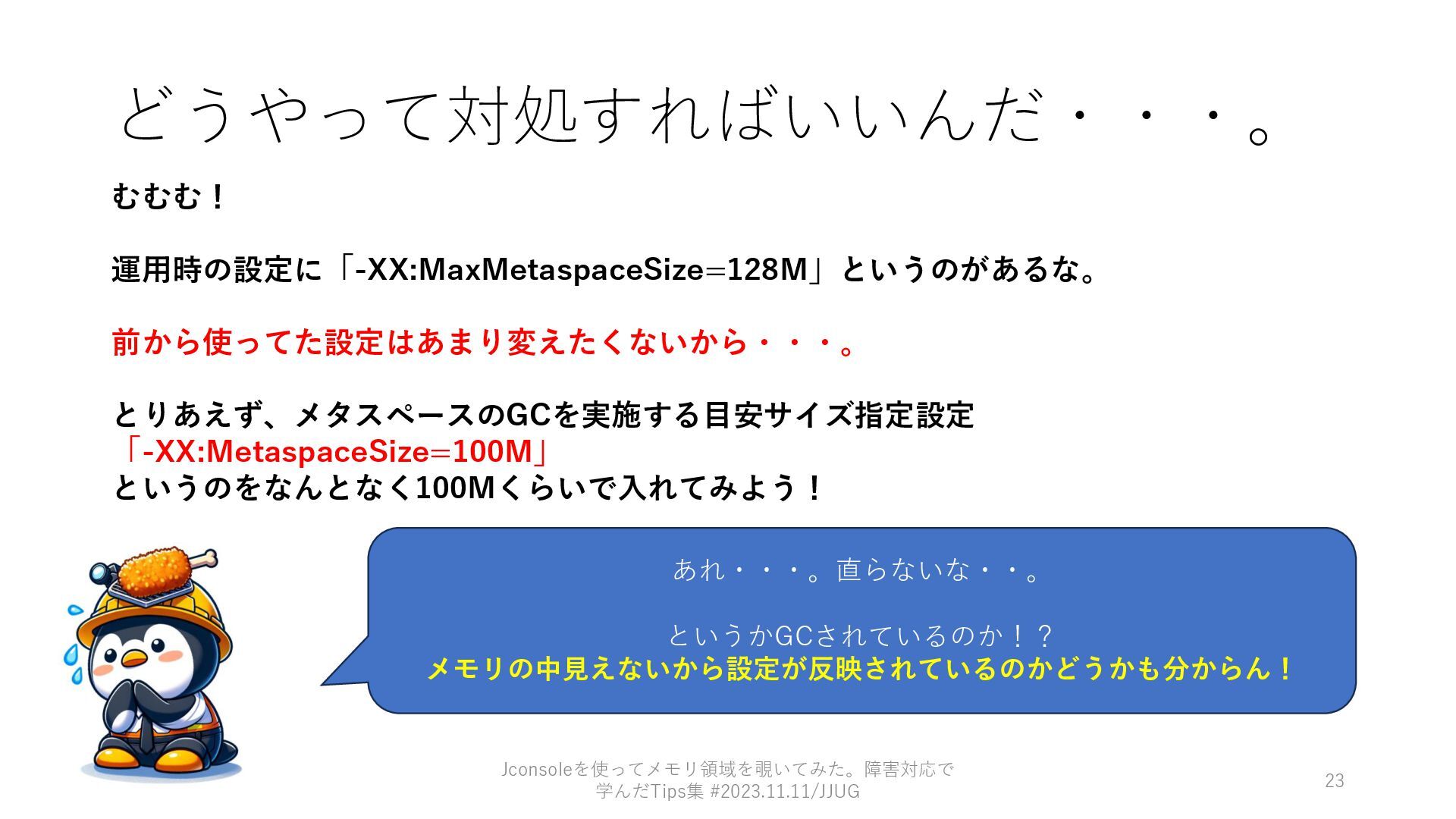 public int instanceCounter = 0;//インスタンス変数 public ExampleClass() { staticCounter++; instanceCounter++; } } public class TestClass { public static void main(String[] args) { ExampleClass obj1 = new ExampleClass(); ExampleClass obj2 = new ExampleClass(); } } System.out.println(obj2.staticCounter); System.out.println(obj2.instanceCounter); 実行結果 Staticカウント:2 インスタンスカウント:1 初学の頃 Jconsoleを使ってメモリ領域を覗いてみた。障害対応で 学んだTips集 #2023.11.11/JJUG 9