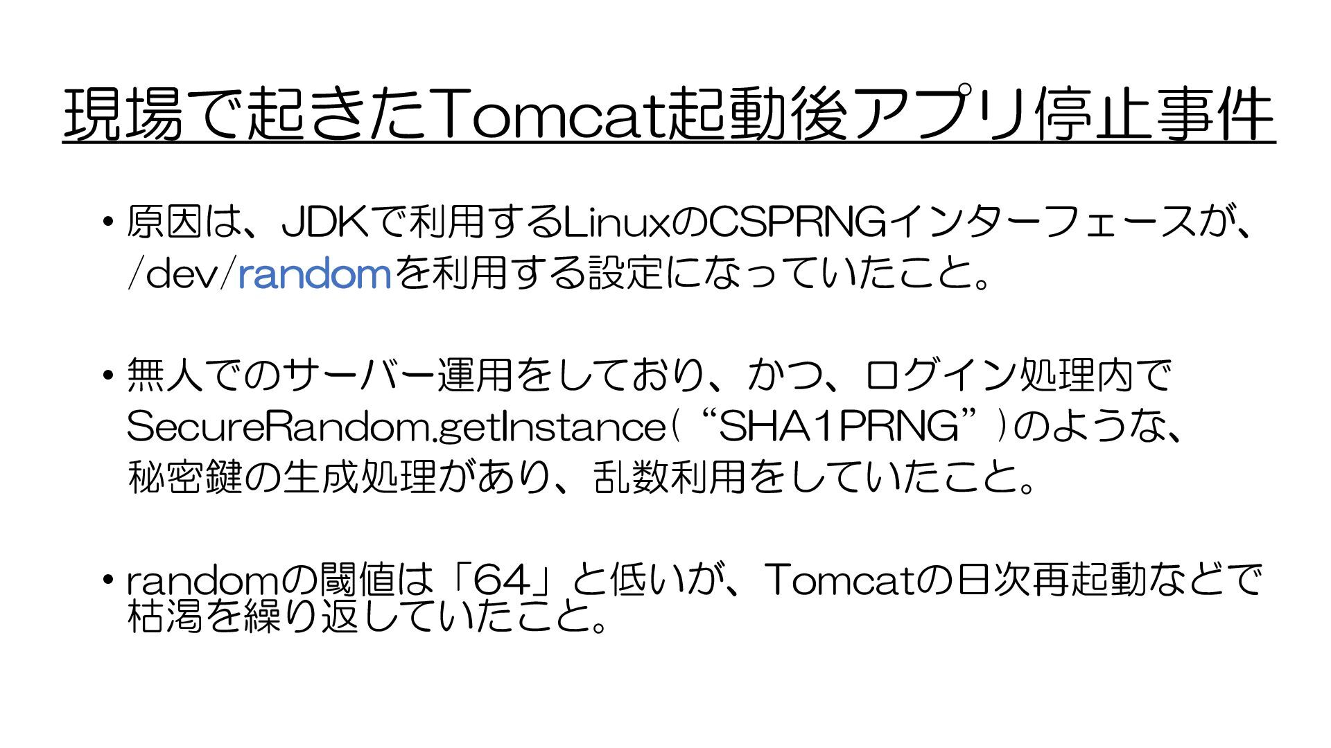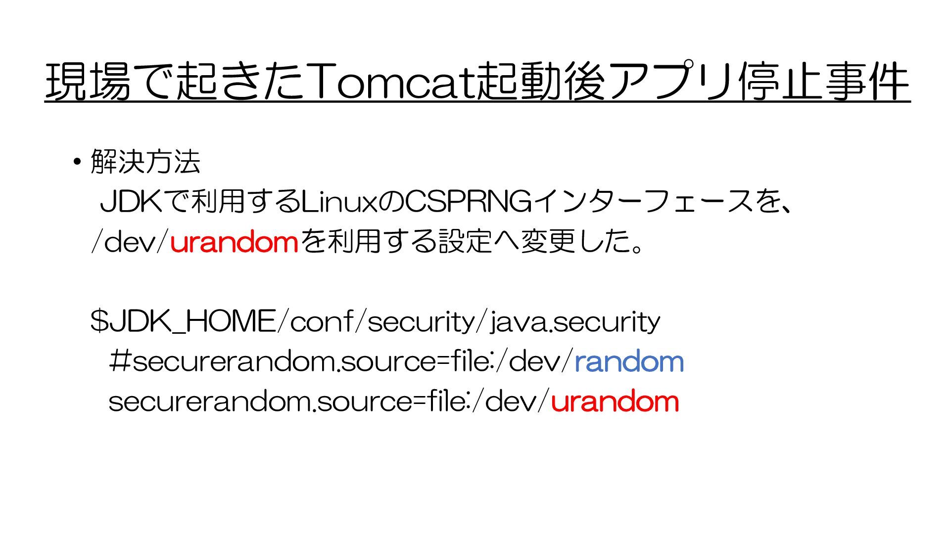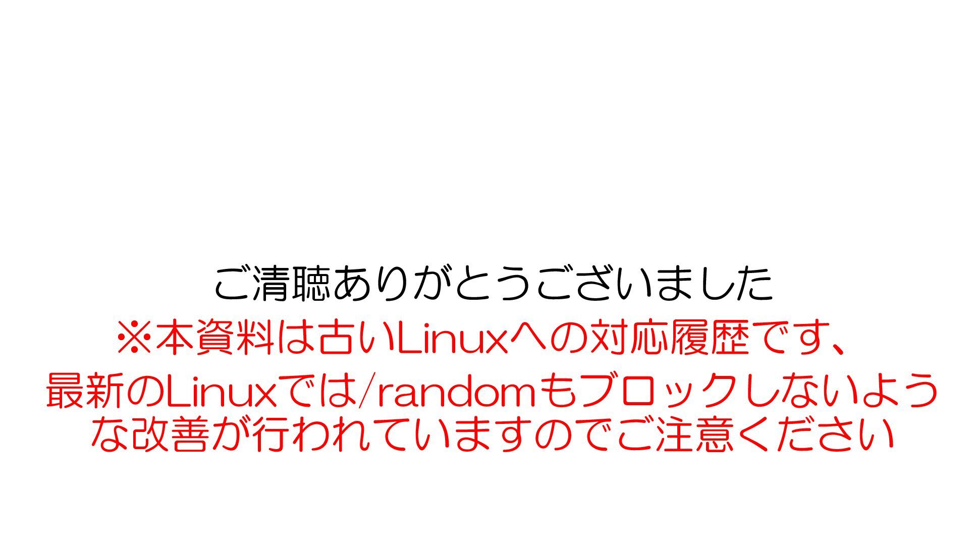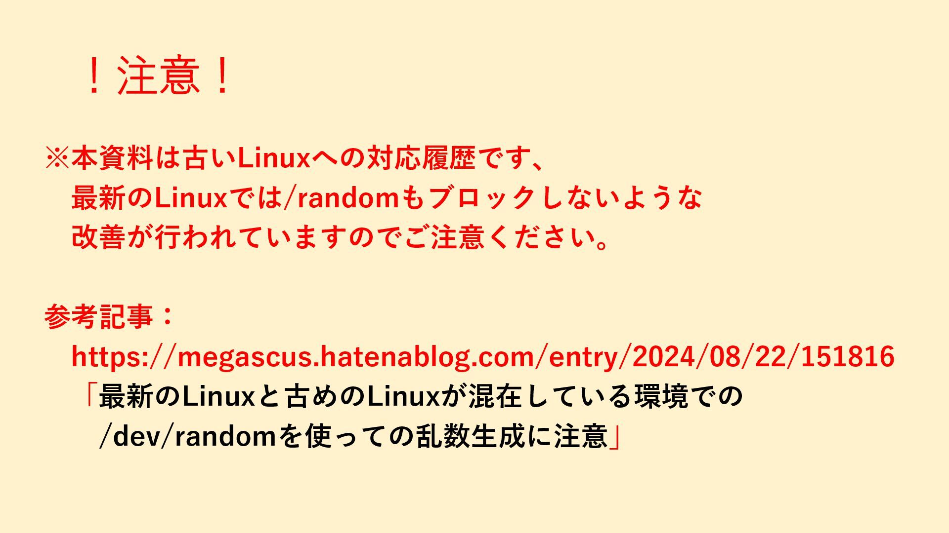 2025/11/15 JJUG Fall 株式会社ケープロジェクト ふじきゃわ発表 ※本資料は古いLinuxへの対応履歴です、最新のLinuxでは/randomもブロックしないような改善が行われていますのでご注意ください。