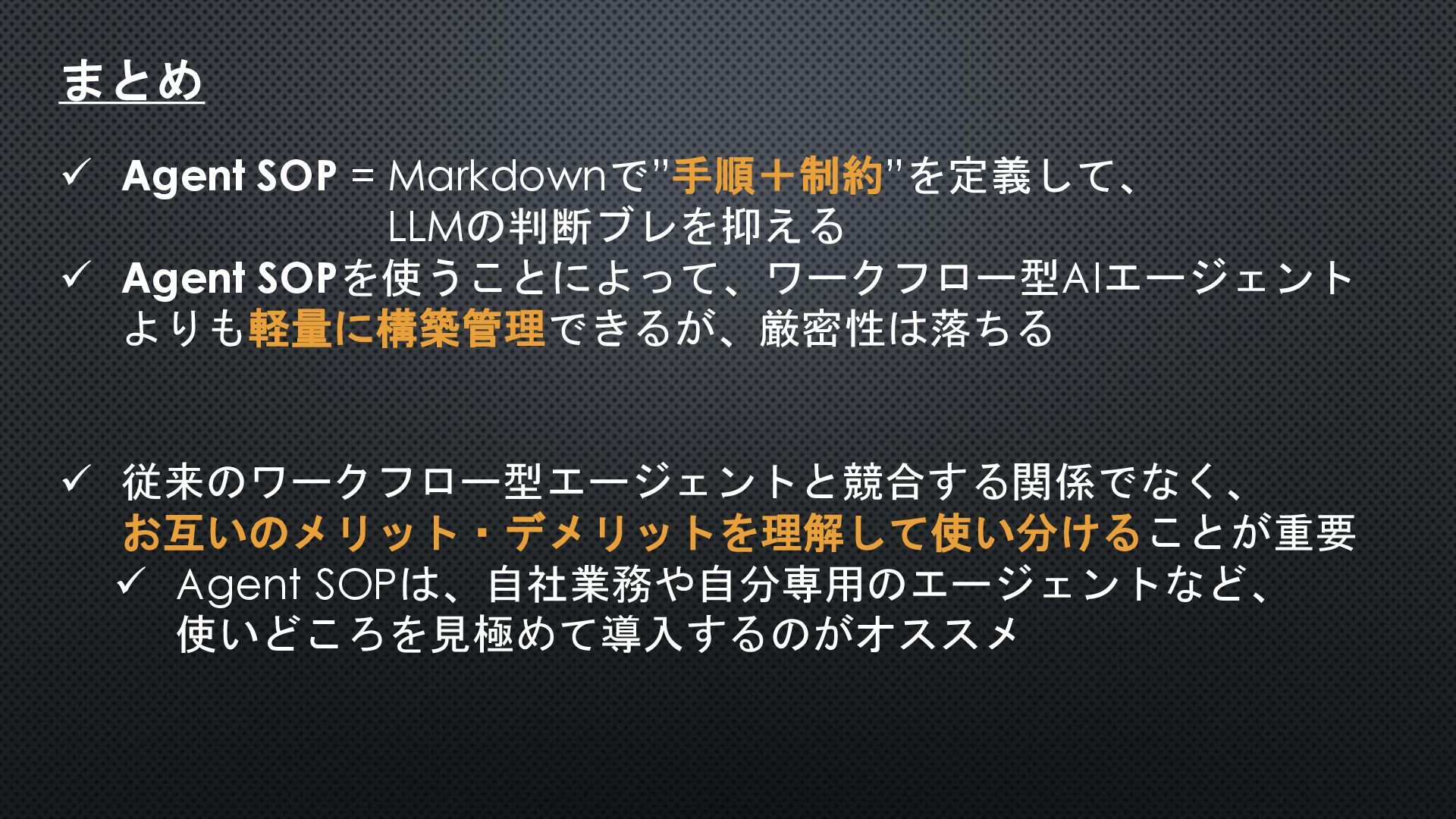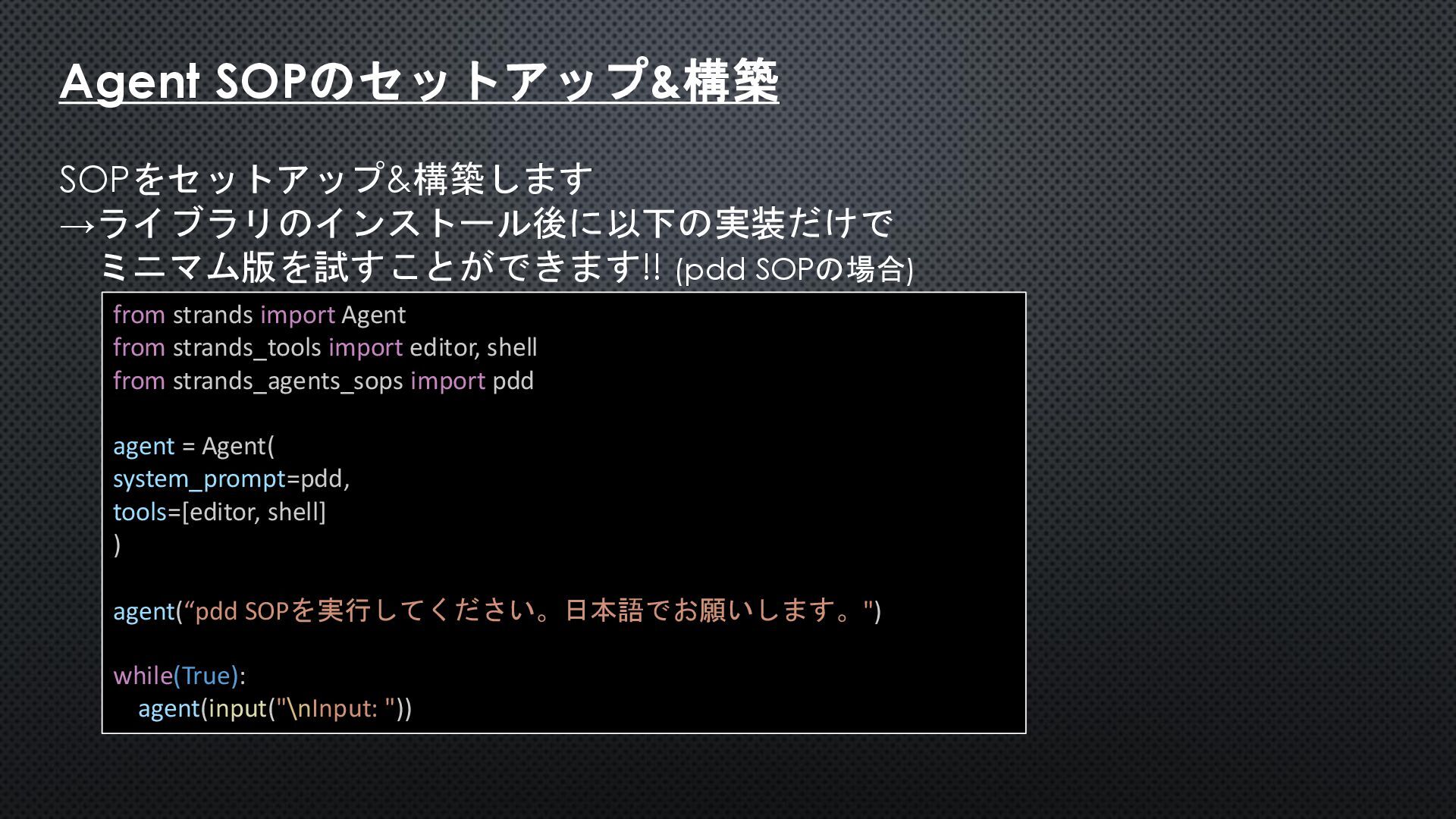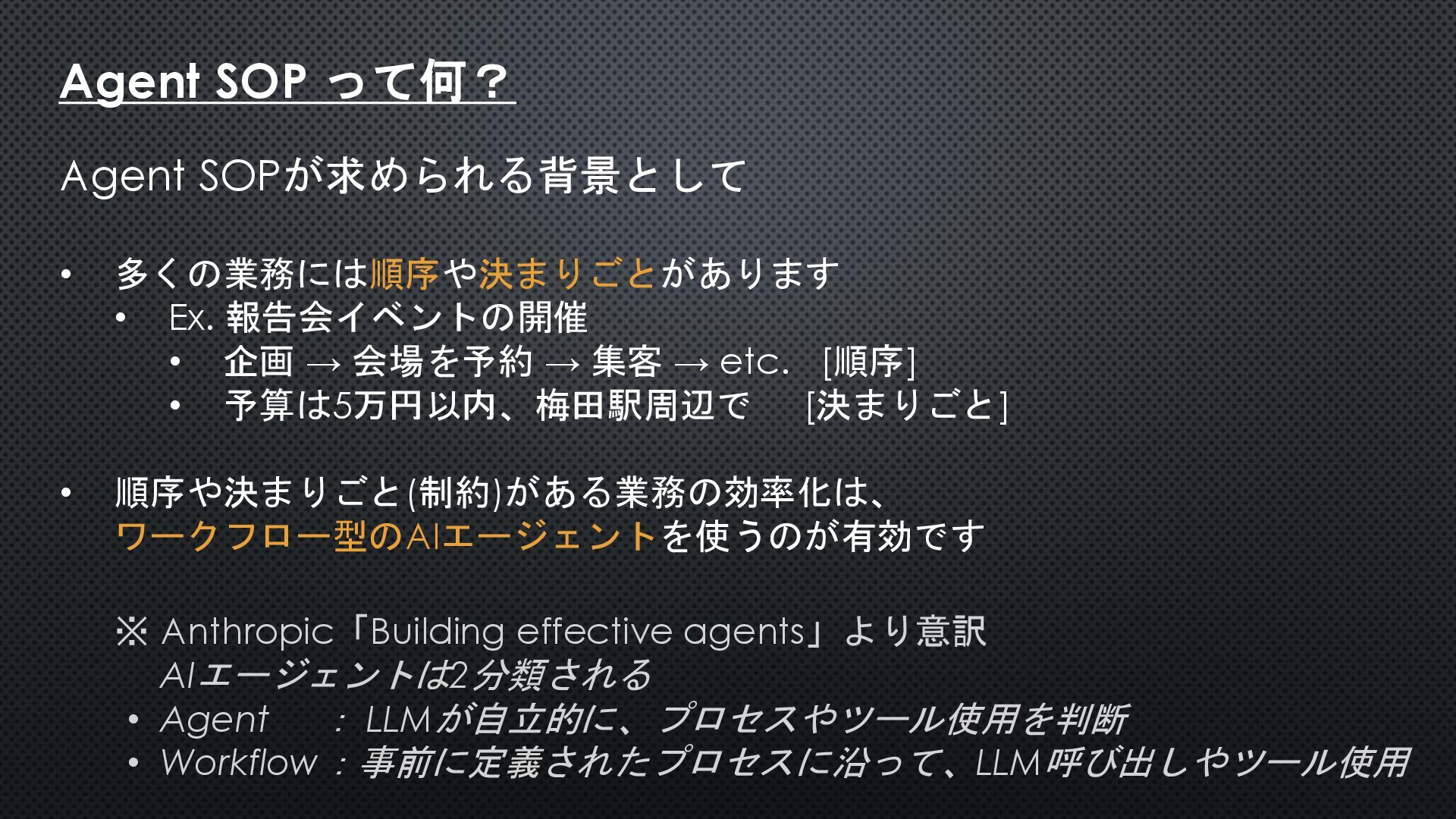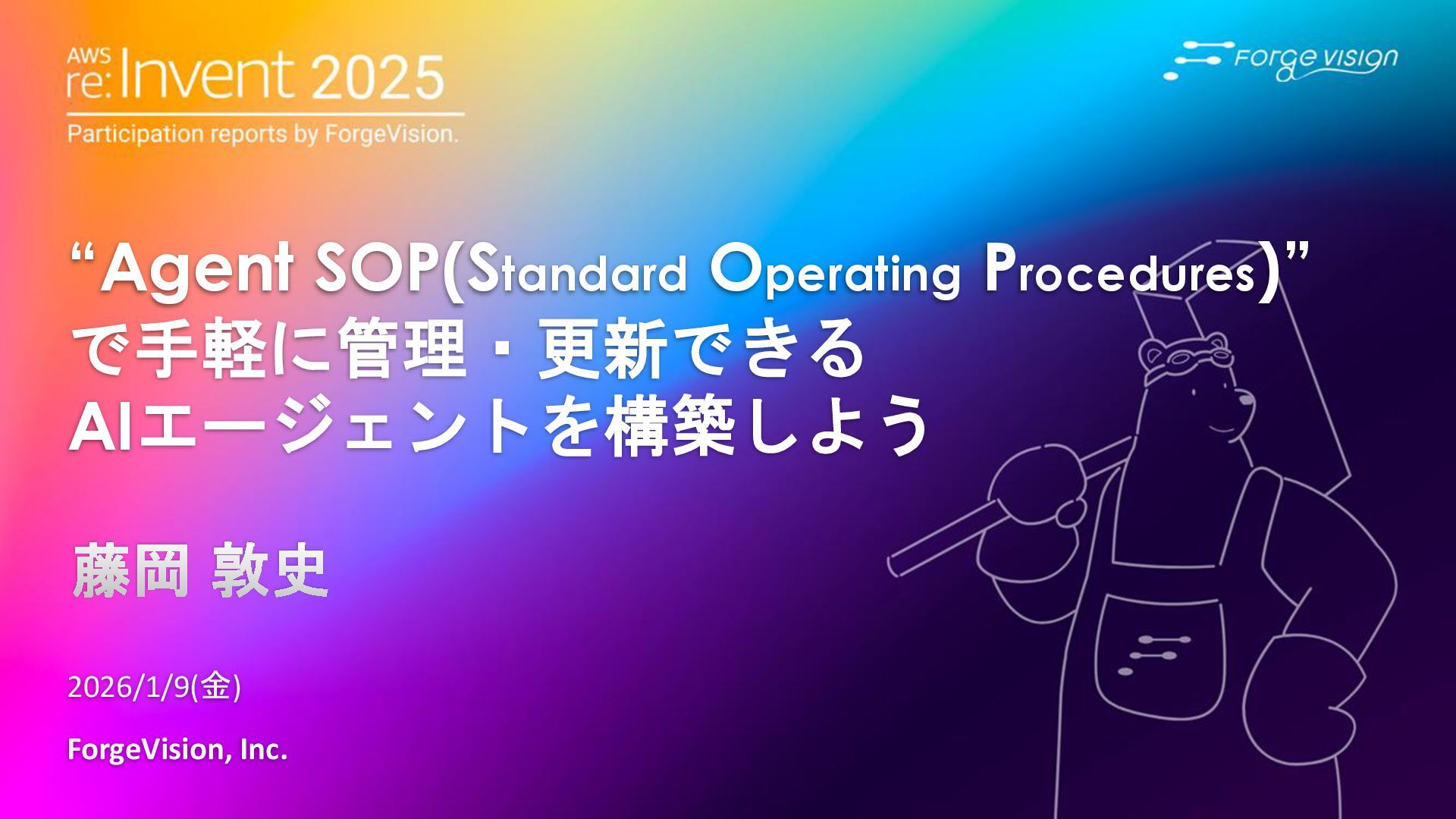 re:Invent2025期間にて発表された“Agent SOP(Standard Operating Procedures)”について、整理・検証しました。SOPの、workflowとagentの中間的な位置付けを理解して、使いどころを見極めて導入すると有効です。