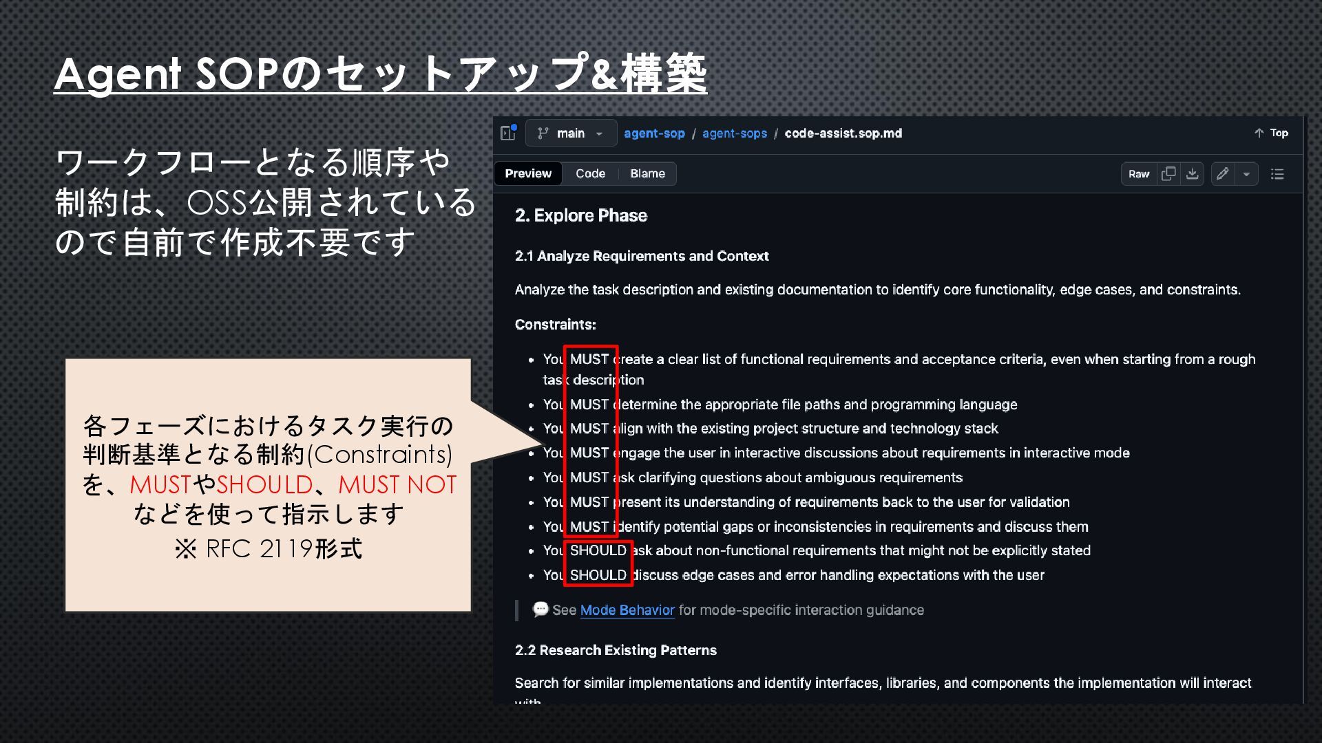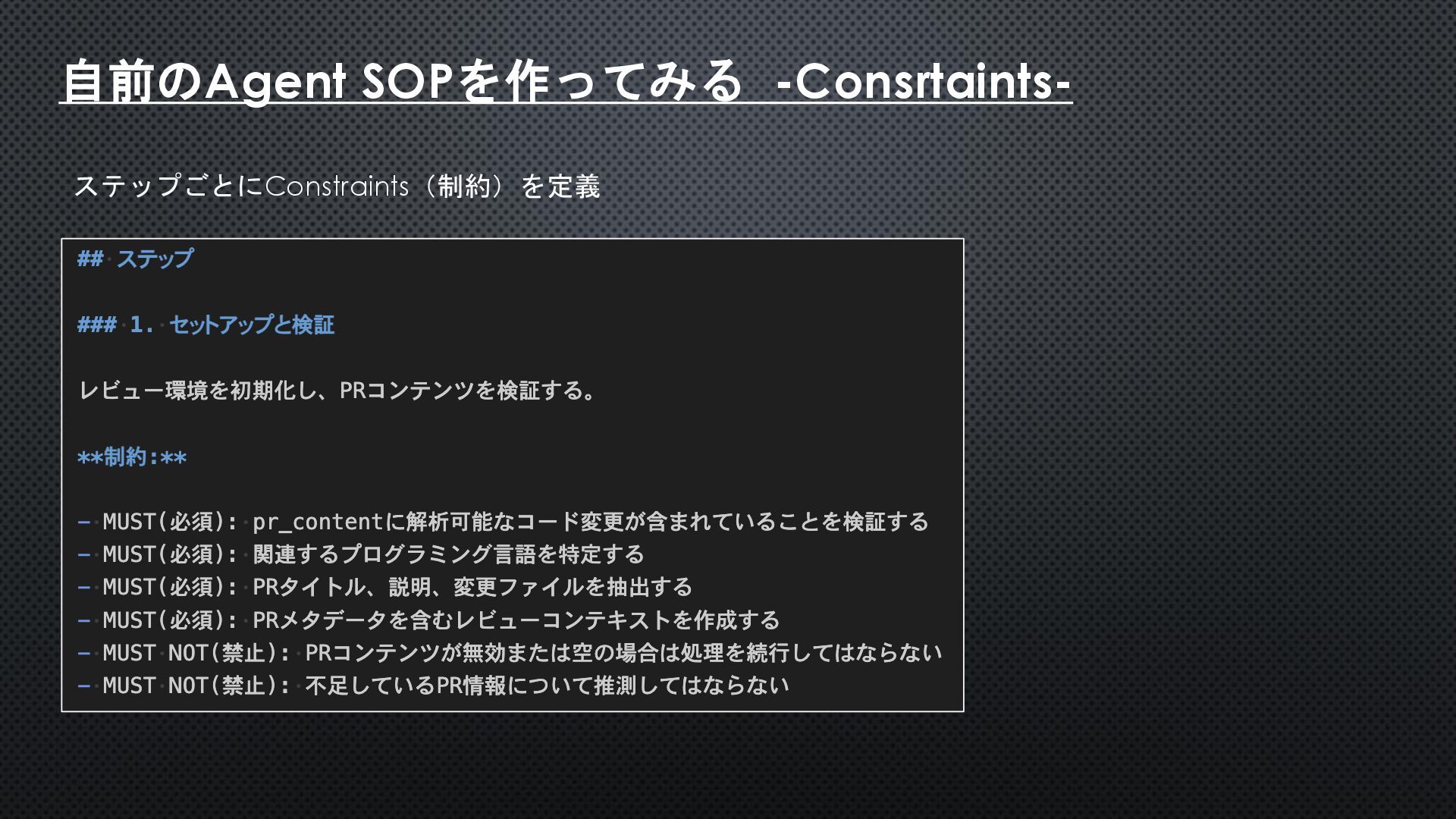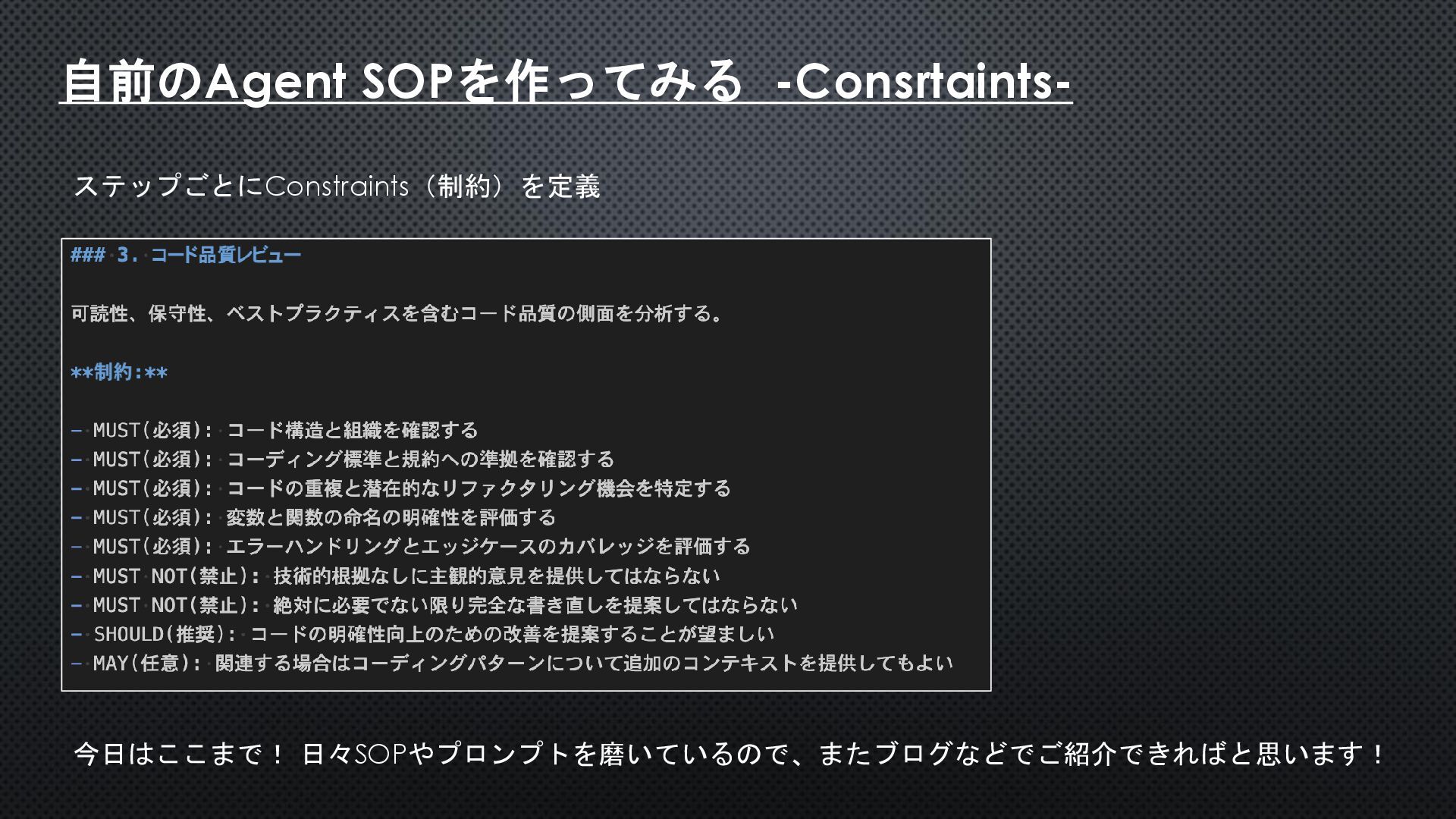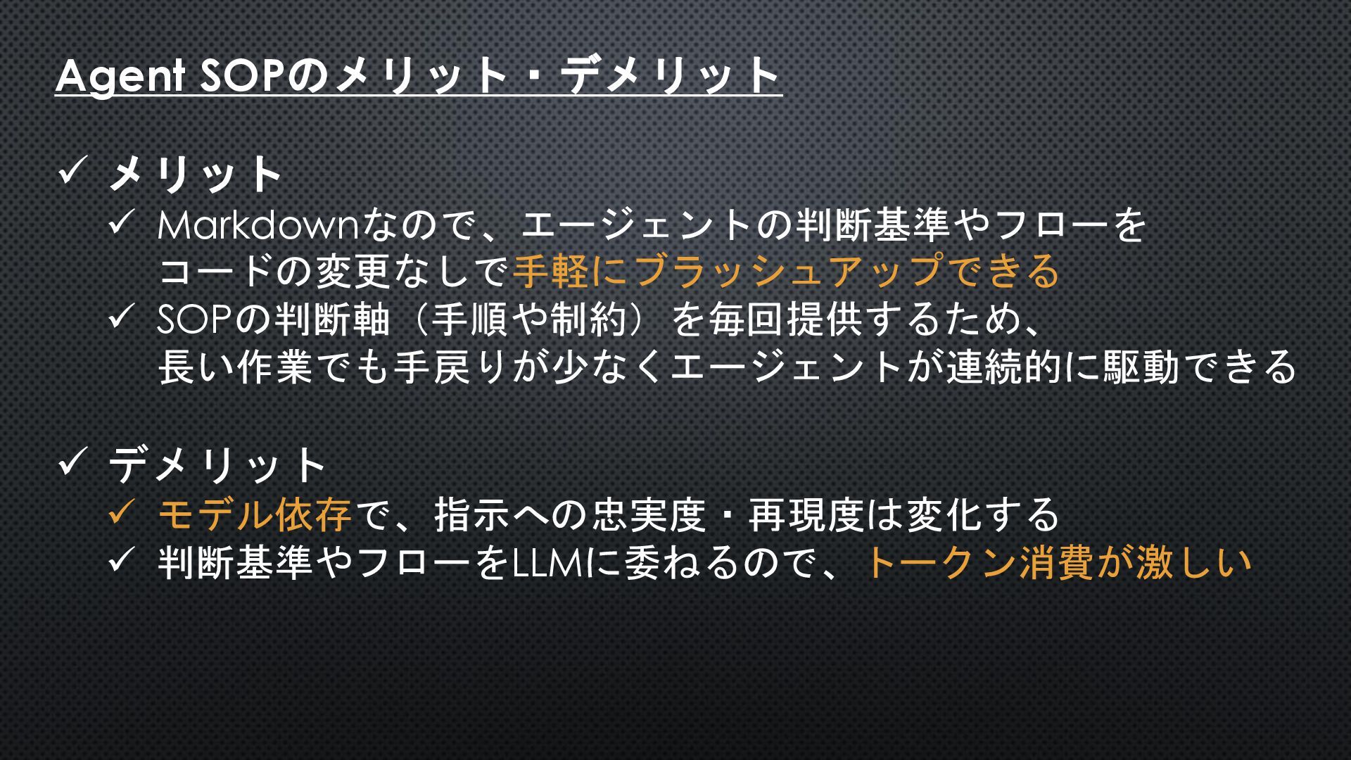 re:Invent2025期間にて発表された“Agent SOP(Standard Operating Procedures)”について、整理・検証しました。SOPの、workflowとagentの中間的な位置付けを理解して、使いどころを見極めて導入すると有効です。