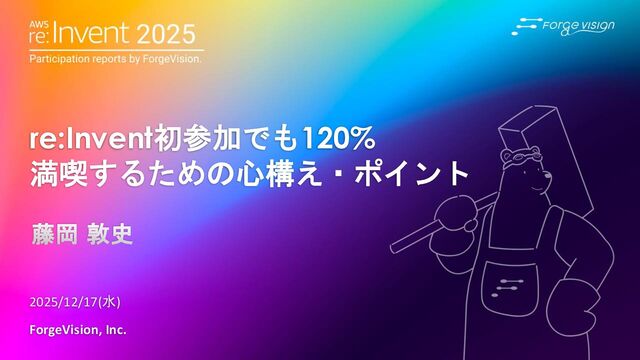 re:Invent初参加でも120% 満喫するための心構え・ポイント 2025/12/17(水) ForgeVision, Inc. 藤岡 敦史