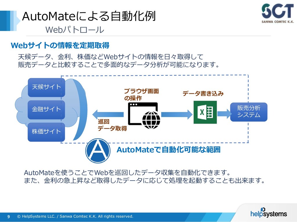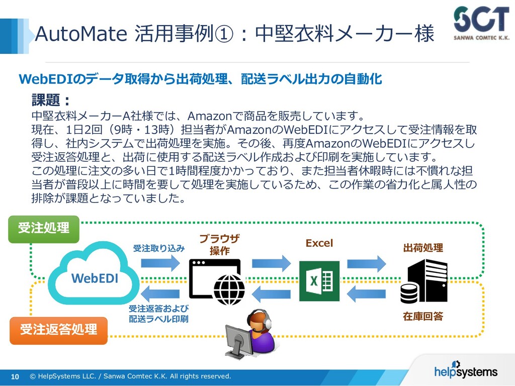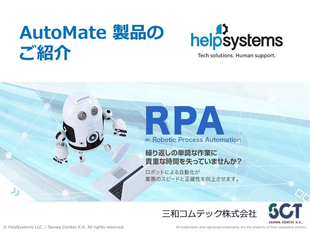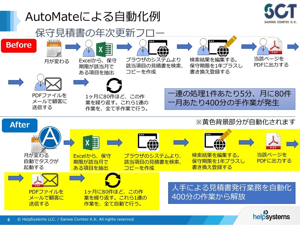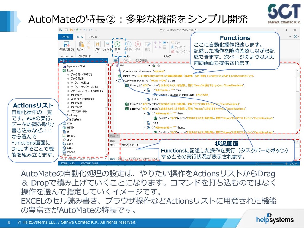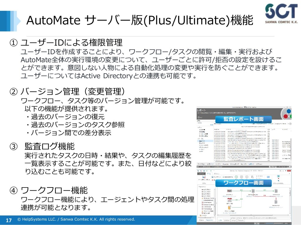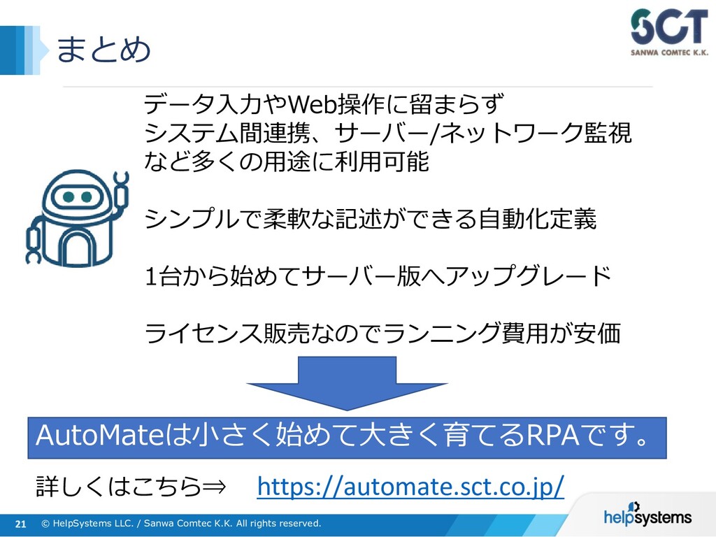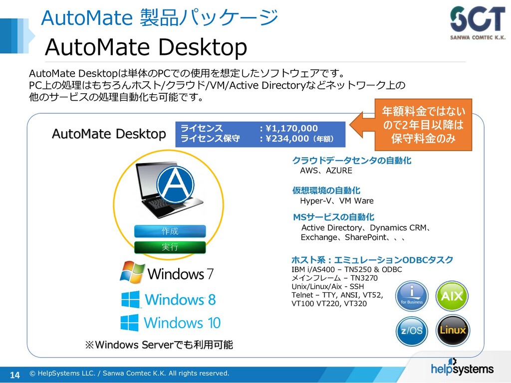 AutoMate Plus エントリーサーバー AutoMate Plusでは、複数存在する実行環境(ボット)による処理やタスクを集中管理することができます。 また、クライアント版機能に加えて、ワークフローやエージェント間の業務連携ができるようになります。 管理 実行 AutoMate Plus ライセンス :¥4,875,000(管理サーバー×1 / スタジオ×2 / ボット×5/拡張機能) ライセンス保守 :¥975,000 (年額) 管理サーバー×1 スタジオ(タスク作成)×2 ※6ボット以降、別料金 ※SQL Serverはエクスプレス版がバンドルされています Server Licenseに含まれている「管理」「作成」「実行」の機能は、 下記のように別々のH/Wに分けて入れる形と、1つのWindows Server内に まとめて入れる形の双方が可能です ※その他、別途有償オプション機能あり ライセンス :@¥780,000 ライセンス保守:@¥156,000(年額) 作成 ボット(実行環境) ×5 ライセンス :@¥585,000 ライセンス保守:@¥117,000(年額) ※3スタジオ以降、 別料金