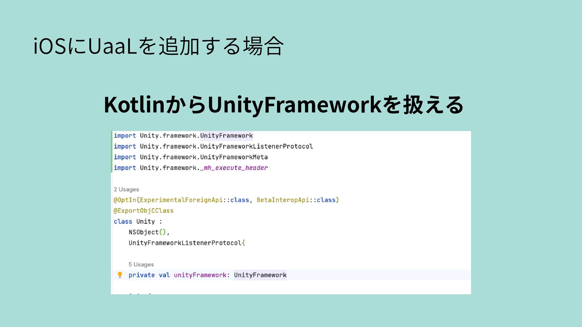 iOSにUaaLを追加する場合 KotlinからUnityFrameworkを扱える