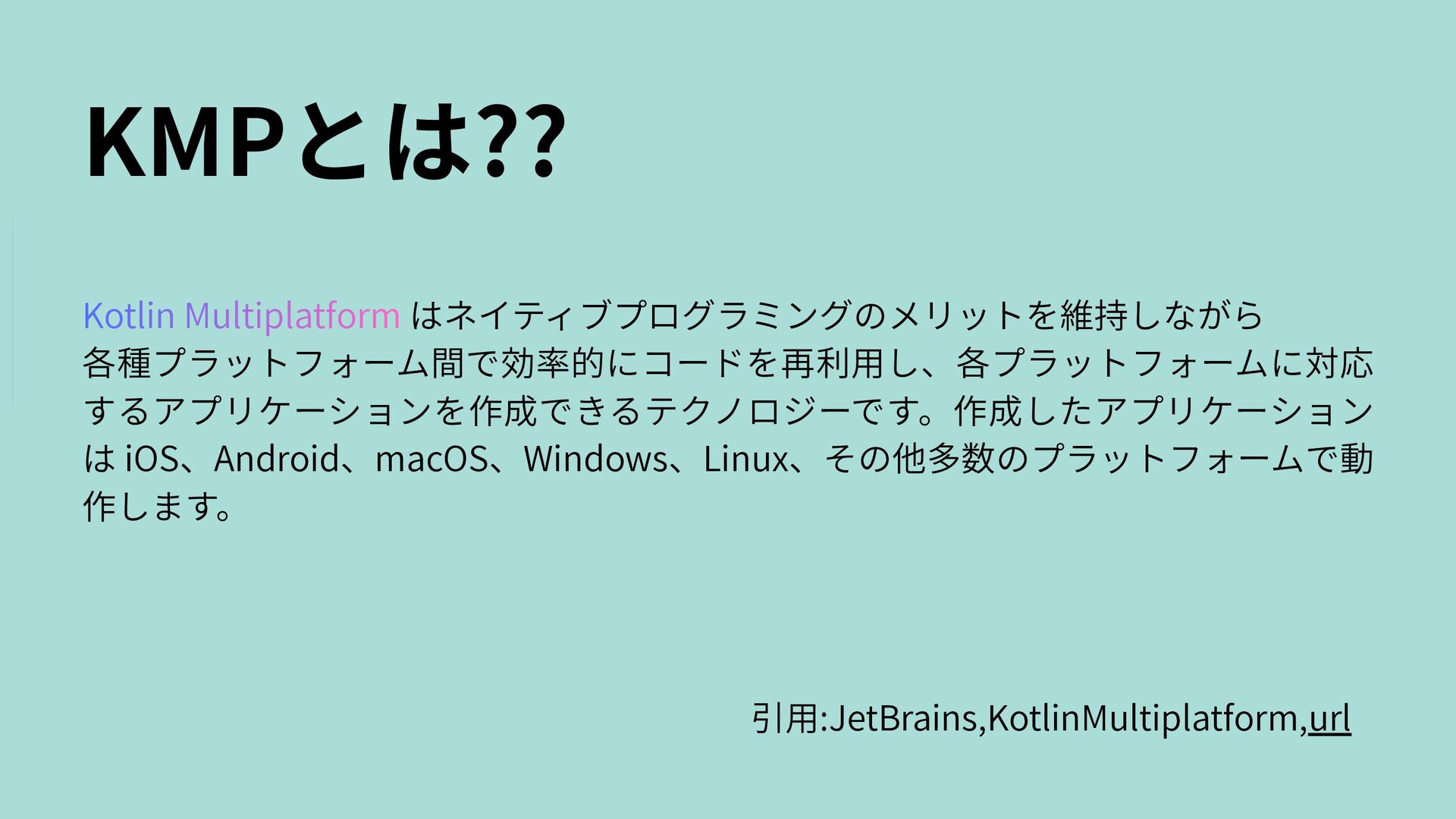 KMPとは?? はネイティブプログラミングのメリットを維持しながら 各種プラットフォーム間で効率的にコードを再利用し、各プラットフォームに対応 するアプリケーションを作成できるテクノロジーです。作成したアプリケーション は iOS、Android、macOS、Windows、Linux、その他多数のプラットフォームで動 作します。 Kotlin Multiplatform 引用:JetBrains,KotlinMultiplatform,url