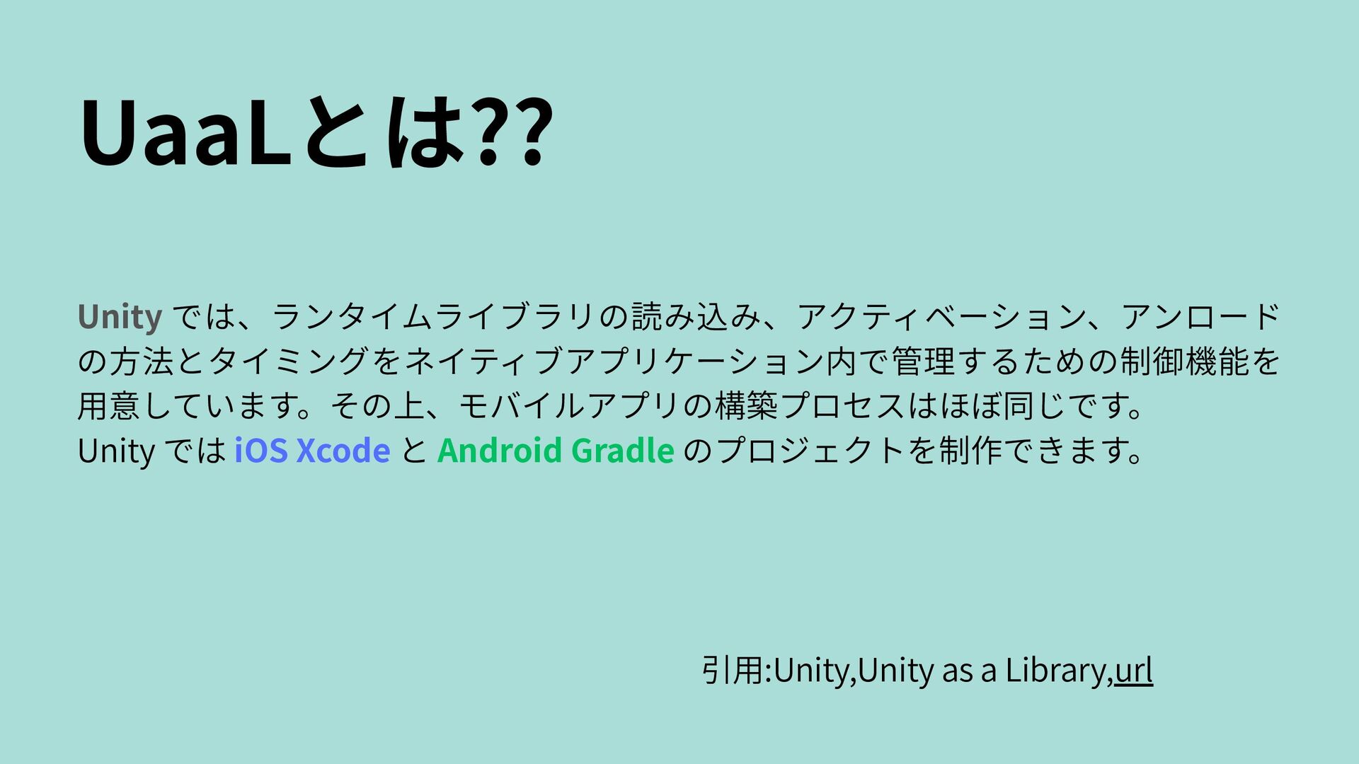 UaaLとは?? Unity では、ランタイムライブラリの読み込み、アクティベーション、アンロード の方法とタイミングをネイティブアプリケーション内で管理するための制御機能を 用意しています。その上、モバイルアプリの構築プロセスはほぼ同じです。 Unity では iOS Xcode と