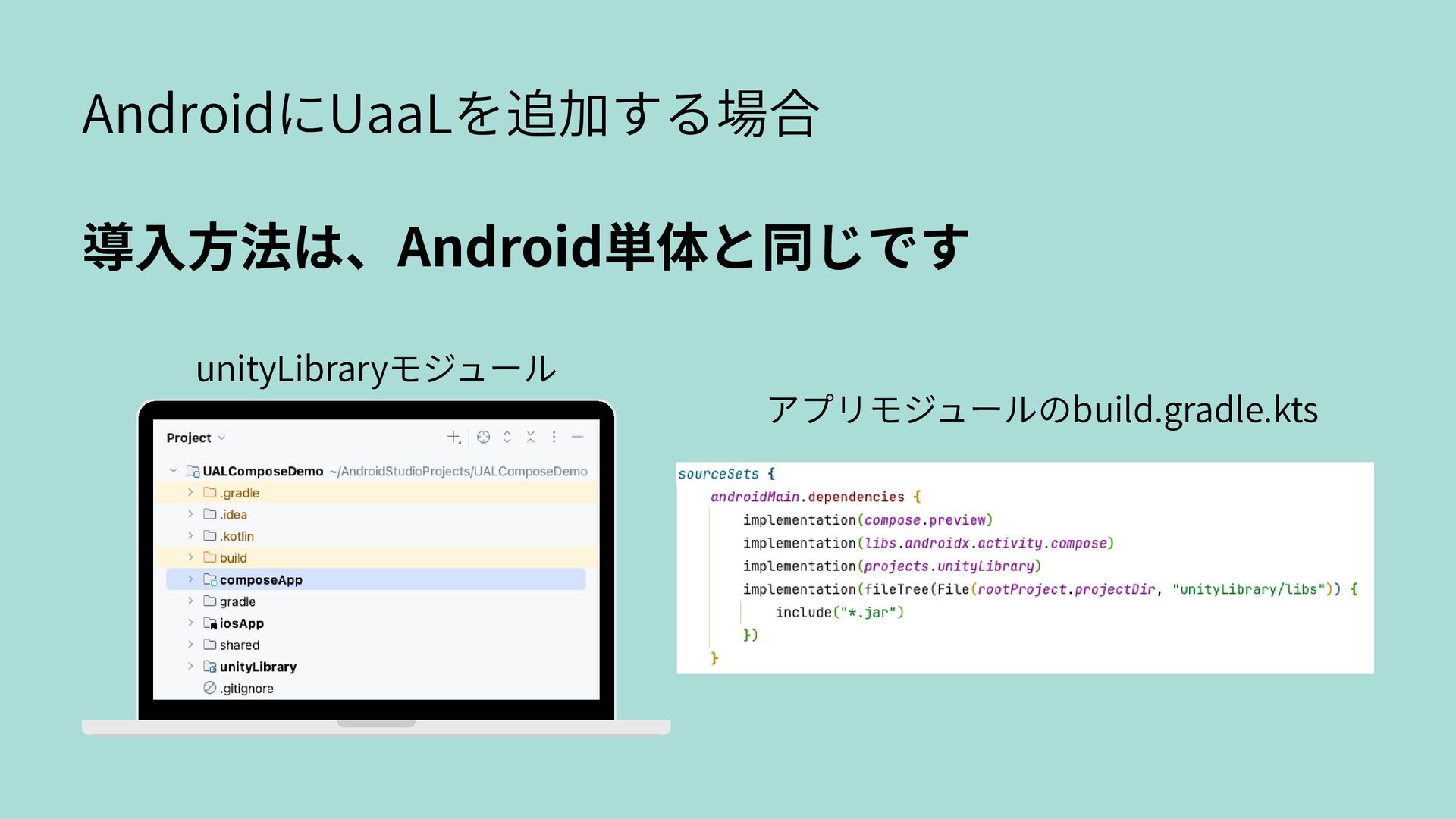 AndroidにUaaLを追加する場合 導入方法は、Android単体と同じです アプリモジュールのbuild.gradle.kts unityLibraryモジュール