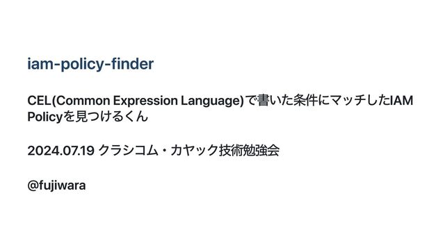 - https://github.com/fujiwara/iam-policy-finder - https://cel.dev - https://gist.github.com/fujiwara/19d20efbd19e9f226aaa5d33c2c00cc7