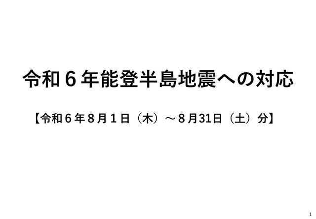 (+40) 142人 (+12) (うち災害関連死) 110人 (+40) 40人 (+12) 負傷者 1,211人 (+2) 516人 増減なし 行方不明者 3人 増減なし 3人 増減なし 住家被害※2 83,521棟 (+3,173) 10,342棟 (+92) 避難所 34箇所 (-14) 13箇所 (-4) 避難者 398人 (-256) 121人 (-81) ※1 輪島市の数値は石川県の内数。避難所数、避難者数は1.5次避難所及び2次避難所を除く ※2 全壊・半壊・一部破損 2 (2)復旧・復興状況等(石川県発表 8月21日14時 時点 ) 石川県 増減(7月18日比) 輪島市 増減(7月18日比) 応急仮設住宅 着工戸数 6,745戸 (+18) 2,897戸 増減なし 応急仮設住宅 完成戸数 5,644戸 (+343) 2,526戸 (+135) 公費解体 申請棟数 26,003棟 (+2,594) 7,742棟 (+739) 公費解体 完了棟数 2,594棟 (+1,128) 443棟 (+201) 申請棟数に対する解体完了率※3 10% (+4%) 6% (+3%) 罹災証明書 発行件数 非公表 - 10,288件※4 (+54) 【国等の体制】 ・ 国 :令和6年能登半島地震復旧・復興支援本部設置(2月1日)、第8回会議(6月28日) ・ 輪島市:復興まちづくり計画検討委員会を初開催(5月9日)、第2回会合(7月12日) ※3 環境省「令和6年能登半島地震を踏まえた公費解体の取組と課題について」 ※4 輪島市災害対策本部会議資料 8月13日時点 ※ グレーは終了又は(一時)中断事項