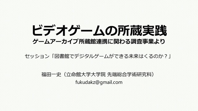 永久保存︓摂⽒約7〜10度、30〜40% • ⼀部の素材では劣化が進んでおり、修復の必要性がある場合も • フロッピーディスクやケーブルに⽤いられるゴム素材などに劣化例多し • 収集資料の選択基準として物理的特徴やアクセスや利⽤の簡便さがあげられる • Robson, Diane, scott Nicholson, and Darlene Mcpeek. 2014. “The State of the Game: ALA Games and Gaming Round Table.” In Games in Library: Essays on Using Play to Connect and Instruct. McFarland Publishing. • アーケードゲームは物理的なサイズが⼤きい場合が多く、図書館のオペレーションには 向いていない側⾯もある • ただし耐久性が⾼く、破損部品の流通も進んでおり、オペレーションに向いている側⾯も。