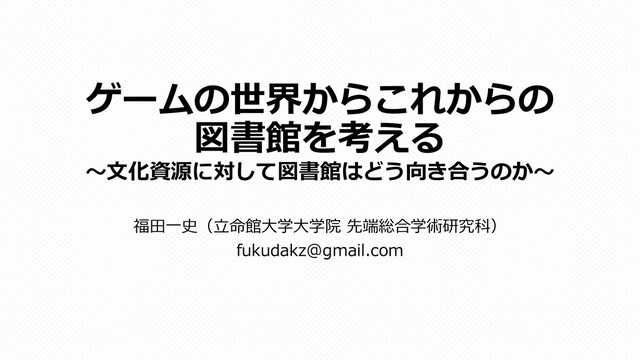 GroupとSeattle Interactive Media Museumが提案するビデオゲーム記述のた めのメタデータスキーマ • Jett, Jacob, Simone Sacchi, Jin Ha Lee, and Rachel Ivy Clarke. 2016. “A Conceptual Model for Video Games and Interactive Media.” Journal of the Association for Information Science and Technology 67 (3): 505–17. https://doi.org/10.1002/asi.23409. • Lee, Jin Ha, Rachel Ivy Clarke, and Andrew Perti. 2015. “Empirical Evaluation of Metadata for Video Games and Interactive Media.” Journal of the Association for Information Science and Technology 66 (12): 2609–25. https://doi.org/10.1002/asi.23357. 25