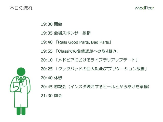 MedPeerの良いところ? 開催実績 ü 2013年3⽉ 伊東 ü 2013年9⽉ 箱根 ü 2014年2⽉ 伊東 ü 2014年6⽉ 千葉 ü 2015年3⽉ 伊東 ü 2016年1⽉ 熱海 ü 2016年8⽉ 湯河原 ü 2017年3⽉ 湯河原 ü 2017年7⽉ 千葉 ü 2017年11⽉ 群⾺ ü 2018年7⽉ 伊⾖⼤島 通算11回! 平⽇(⽔⽊⾦)で 技術研鑚しにいきます
