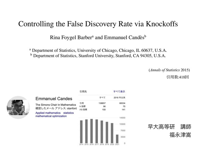 for all j. We will ensure that these knockoff ˜ X> ˜ X = ⌃, X> ˜ X = ⌃ diag{s}, egative vector. In words, ˜ X exhibits the same covariance structure a orrelations between distinct original and knockoff variables are the s and ⌃ diag{s} are equal on off-diagonal entries): X> j ˜ Xk = X> j Xk for all j 6= k. j to its knockoff ˜ Xj , we see that X> j ˜ Xj = ⌃jj sj = 1 sj, ensure that our method has good statistical power to detect signals, we as large as possible so that a variable Xj is not too similar to its knock X is to choose s 2 Rp + satisfying diag{s} 2⌃, and construct the n ⇥ ˜ X = X(I ⌃ 1 diag{s}) + ˜ UC; matrix that is orthogonal2 to the span of the features X, and C>C = w ࣍ͷͭͷ݅Λຬͨ͢Α͏ʹɹɹΛߏங 9Λ֬มͱΈ͍ͯΔ