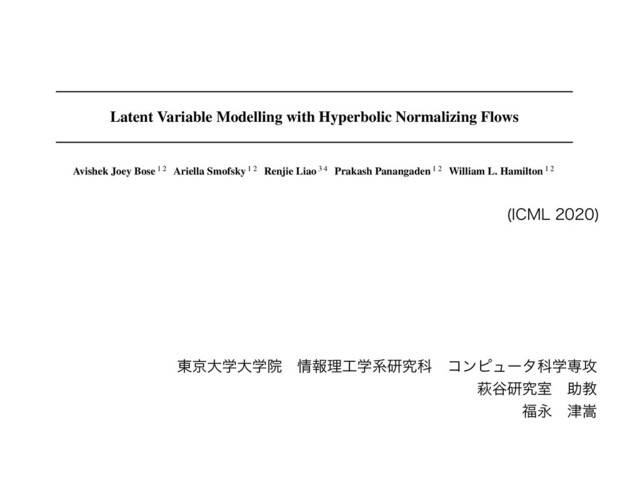 w ͜ͷลͷܭࢉΛղੳతʹͰ͖Δͱݴ͏͜ͱ͕ॏཁͳϙΠϯτ PT is the parallel transport on hyperbolic space, then hPT⌫!µ(v), PT⌫!µ(v0)iL = hv, v0iL. The explicit formula for the parallel transport on the Lorentz model (Figure 2(b)) is given by: PT⌫!µ(v) = v + hµ ↵⌫, viL ↵ + 1 (⌫ + µ), (3) where ↵ = h⌫, µiL. The inverse parallel transport PT 1 ⌫!µ simply carries the vector in TµHn back to T⌫Hn along the geodesic. That is, v = PT 1 ⌫!µ (u) = PTµ!⌫(u). (4) Exponential map and inverse exponential map Finally, we will describe a function that maps a vector in a tangent space to its surface. According to the basic theory of differential geometry, ev- ery u 2 TµHn determines a unique maximal geodesic µ : [0, 1] ! Hn with µ(0) = µ and ˙µ(0) = u. Ex- ponential map expµ : TµHn ! Hn is a map defined by expµ (u) = µ(1), and we can use this map to project a vector v in TµHn onto Hn in a way that the distance from µ to destination of the map coincides with kvkL, the metric bolic space, we need to be able to map the point back to t tangent space, on which the distribution is initially define We, therefore, need to be able to compute the inverse of t exponential map, which is also called logarithm map, well. Solving eq. (13) for u, we can obtain the inverse exponenti map as u = exp 1 µ (z) = arccosh(↵) p ↵2 1 (z ↵µ), ( where ↵ = hµ, ziL. See Appendix A.1 for further detai 3. Pseudo-Hyperbolic Gaussian 3.1. Construction Finally, we are ready to provide the construction of o wrapped gaussian distribution G(µ, ⌃) on Hyperbolic spa with µ 2 Hn and positive definite ⌃. In the language of the differential geometry, our strateg can be re-described as follows: 1. Sample a vector ˜ v from the Gaussian distributio N(0, ⌃) defined over Rn. 2. Interpret ˜ v as an element of Tµ0 Hn ⇢ Rn+1 by rewr ing ˜ v as v = [0, ˜ v]. model (Figure 2(b)) is given by: PT⌫!µ(v) = v + hµ ↵⌫, viL ↵ + 1 (⌫ + where ↵ = h⌫, µiL. The inverse paralle PT 1 ⌫!µ simply carries the vector in TµHn bac along the geodesic. That is, v = PT 1 ⌫!µ (u) = PTµ!⌫(u). Exponential map and inverse exponential ma Finally, we will describe a function that maps a tangent space to its surface. According to the basic theory of differential ge ery u 2 TµHn determines a unique maxima µ : [0, 1] ! Hn with µ(0) = µ and ˙µ(0) ponential map expµ : TµHn ! Hn is a map expµ (u) = µ(1), and we can use this map t vector v in TµHn onto Hn in a way that the dis µ to destination of the map coincides with kvkL H1 (red) and its tangent space TµH1 (blue). (b) Parallel transport carries ng k · kL . (c) Exponential map projects the u 2 Tµ (blue) to z 2 Hn (red). measured on the surface of Hn coincides with kukL. nt space of µ0 Hn con- p hv, viL = port n, the par- ap PT⌫!µ in T⌫Hn el manner words, if pace, then he Lorentz µ), (3) norm of v. For hyperbolic space, this map (Figure 2(c)) is given by z = expµ (u) = cosh (kuk L )µ+sinh (kuk L ) u kuk L . (5) As we can confirm with straightforward computation, this exponential map is norm preserving in the sense that d`(µ, expµ (u)) = arccosh hµ, expµ (u)iL = kukL. Now, in order to evaluate the density of a point on hyper- bolic space, we need to be able to map the point back to the tangent space, on which the distribution is initially defined. We, therefore, need to be able to compute the inverse of the exponential map, which is also called logarithm map, as well. Solving eq. (13) for u, we can obtain the inverse exponential map as u = exp 1 µ (z) = arccosh(↵) p (z ↵µ), (6) ng the geodesic. That is, v = PT 1 ⌫!µ (u) = PTµ!⌫(u). (4) ponential map and inverse exponential map nally, we will describe a function that maps a vector in a gent space to its surface. cording to the basic theory of differential geometry, ev- y u 2 TµHn determines a unique maximal geodesic : [0, 1] ! Hn with µ(0) = µ and ˙µ(0) = u. Ex- nential map expµ : TµHn ! Hn is a map defined by pµ (u) = µ(1), and we can use this map to project a ctor v in TµHn onto Hn in a way that the distance from o destination of the map coincides with kvkL, the metric 3. Pseudo-Hyperbolic G 3.1. Construction Finally, we are ready to pro wrapped gaussian distribution with µ 2 Hn and positive de In the language of the differ can be re-described as follow 1. Sample a vector ˜ v fro N(0, ⌃) defined over R 2. Interpret ˜ v as an elemen ing ˜ v as v = [0, ˜ v]. v = PT 1 ⌫!µ (u) = PTµ!⌫(u). (4) ntial map and inverse exponential map we will describe a function that maps a vector in a space to its surface. ng to the basic theory of differential geometry, ev- 2 TµHn determines a unique maximal geodesic 1] ! Hn with µ(0) = µ and ˙µ(0) = u. Ex- al map expµ : TµHn ! Hn is a map defined by ) = µ(1), and we can use this map to project a v in TµHn onto Hn in a way that the distance from tination of the map coincides with kvkL, the metric 3.1. Construction Finally, we are ready to provide t wrapped gaussian distribution G(µ, with µ 2 Hn and positive definite ⌃ In the language of the differential can be re-described as follows: 1. Sample a vector ˜ v from the N(0, ⌃) defined over Rn. 2. Interpret ˜ v as an element of Tµ ing ˜ v as v = [0, ˜ v]. where ↵ = h⌫, µiL. The inverse parallel transport PT 1 ⌫!µ simply carries the vector in TµHn back to T⌫Hn along the geodesic. That is, v = PT 1 ⌫!µ (u) = PTµ!⌫(u). (4) Exponential map and inverse exponential map Finally, we will describe a function that maps a vector in a tangent space to its surface. According to the basic theory of differential geometry, ev- ery u 2 TµHn determines a unique maximal geodesic µ : [0, 1] ! Hn with µ(0) = µ and ˙µ(0) = u. Ex- ponential map expµ : TµHn ! Hn is a map defined by expµ (u) = µ(1), and we can use this map to project a vector v in TµHn onto Hn in a way that the distance from µ to destination of the map coincid