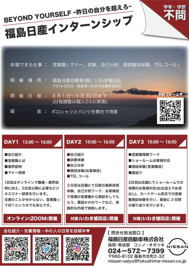 ΦϯϥΠϯ ;00. ։࠵ ର໘ ͍Θ͖২ాళ ։࠵ ର໘ ͍Θ͖২ాళ ։࠵ ɿ ɿ ɿ ɿ Ӧۀ৬ Ϛφʔɺࢼɺࣗݾੳɺஊٖࣅମݧɺ5&- ίʔϧ ౡ࢈ࣗಈं ג ͍Θ͖২ాళ ˟ɹౡݝ͍Θ͖ࢢࠤߙொఒా ݄ ʙ ݄ ·Ͱ ఔௐݸਓ͝ͱʹ࣮ࢪ ϙϩγϟπͱύϯπΛฐࣾͰ༻ҙ ʙ ʙ ʙ ˙ࣗݾհ ˙Ӧۀ৬ͱ ˙ۀքઆ໌ ˙Ϛφʔݚम ΦϯϥΠϯͰ৬छɾۀքઆ ໌ʹՃ͑ɺҎ߱ʹඞཁͳϏδ ωεϚφʔݚमΛߦ͍·͢ɻ ࢈ͷ͜ͱ͕͔Βͳ͍ɺӦۀ৬ͬ ͯԿʁͱ͍͏ํͰ҆৺Ͱ͢ɻ ˙ࣗݾհ ˙ࢼମݧ ˙ࣗݾੳ ˙ஊମݧ ͓٬༷ ˙5&- ίʔϧ ̎ళฮʹͯ࢈ͷ࠷৽ٕज़ ମݧɺࣗݾੳϫʔΫɺ͓٬༷ ͰݱͷӦۀ৬͔ΒஊΛͯ͠ Β͏ɺి͔͚ͷϫʔΫͳͲɺ࣮ ફతͳ༰Ͱ࣮ࢪ͠·͢ɻ ˙Ӧۀ৬ཧղϫʔΫ ˙γϣʔϧʔϜ͓٬༷ରԠ ˙ஊମݧ Ӧۀ৬ ˙ৼฦΓ ళฮʹͯγϣʔϧʔϜͰͷ ࣮ࡍͷ͓٬༷ରԠ ͓ग़ܴ͓͑ ग़͠ ɺΧʔυήʔϜܗࣜͰͷӦۀ ৬ஊମݧΛߦ͍ɺ࠷ޙʹ ؒ ͷৼΓฦΓΛߦ͍·͢ɻ ʲ߹ͤ୲૭ޱʳ ࠾༻ ɾ ҭ෦ɹίϯϊɾΦΦπΩ ʔʔ ˟ ౡࢢொ OJTTBOTBJZP!GVLVTIJNBOJTTBODPKQ ձࣾհɾઌഐใɾதͷਓͷৗΛߘத˝