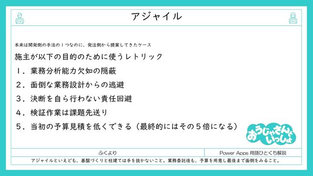 Cat & ". Dog says " & Dog & ".") // この式をラベルに記述すると、Cat says Nyan. Dog says Nyan. と表示されます。 2:重複した記述を簡素化できます。 With( LookUp(Departments, Title=Gallery2.Selected.Department), // レコードの検索は一回で、ラベルに見つかった時の表示、見つからなかった時の表示を記述。 If(IsBlank(Manager), “Unknown”, // レコードがない場合 Manager)) // レコードがある場合 次は、レコードにrecordという名前を付け、”Greg”が見つからなかった時はレコード追加、見つかった時はタイトルをEditに修正するボタンの記述。 With( LookUp(Employees, ‘First Name’ = “Greg”) As record, // “Greg” のレコードを探す If(IsBlank(record.’First Name’), Patch(Employees, // “Greg” がいない場合は、新規作成 Default(Employees), {Title: “New”, ‘First Name’: “Greg”}), Patch(Employees, // “Greg” がいる場合は、タイトルをEditに修正 record, {Title: "Edit"}))) ふくより With( レコード, 数式 ) Power Apps 用語ひとくち解説 2に書かれているコードは初心者向きではありませんので、わからない場合は無視してください。
