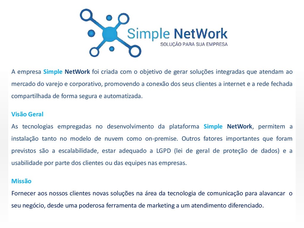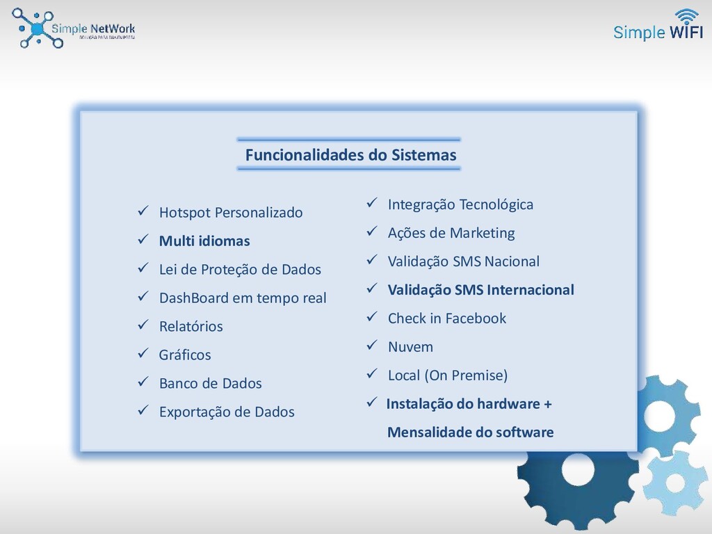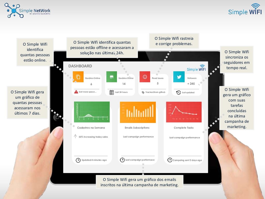 com a antena de tecnologia ubiquit, para a gestão de acessos seguros e gratuitos a Internet com uma interface amigável, rápida e navegação segura. Essa solução está aderente a Lei de proteção de dados (LGPD) e garante rastreabilidade total de quem, quando, onde, por quanto tempo e qual dispositivo utilizou o Wi-Fi gratuito. Possui rápida implementação por estar na nuvem e o estabelecimento pode acompanhar em tempo real a utilização da sua rede. Os dados são recolhidos no formulário de cadastro para concessão de acesso ao Wi-Fi customizado com a identidade visual do estabelecimento. Essas informações ficam armazenadas em um banco de dados e poderão ser exportados e utilizados para ações de marketing. O Simple Wifi é a solução ideal para prospecção e fidelização, aumentando o network e relacionamento com o público através das informações geradas dentro do banco de dados, o que possibilitará criar estratégias de marketing assertivas, ágeis e inovadoras, acompanhadas em tempo real atingindo resultados com alto grau de efetividade.