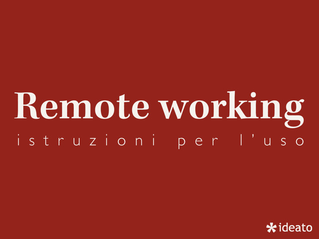 github, automattic, trevis-ci, 37 signal tutte aziende che hanno puntato sul remote working. Non tanto come forma di "telelavoro" ma come strumento abilitante a lavorare con i migliori sviluppatori sparsi per il mondo senza obbligarli a (costosi) traslochi. In questo talk vedremo come si può abilitare la propria azienda a questa filosofia senza, per questo, perdere in produttività o qualità del lavoro.