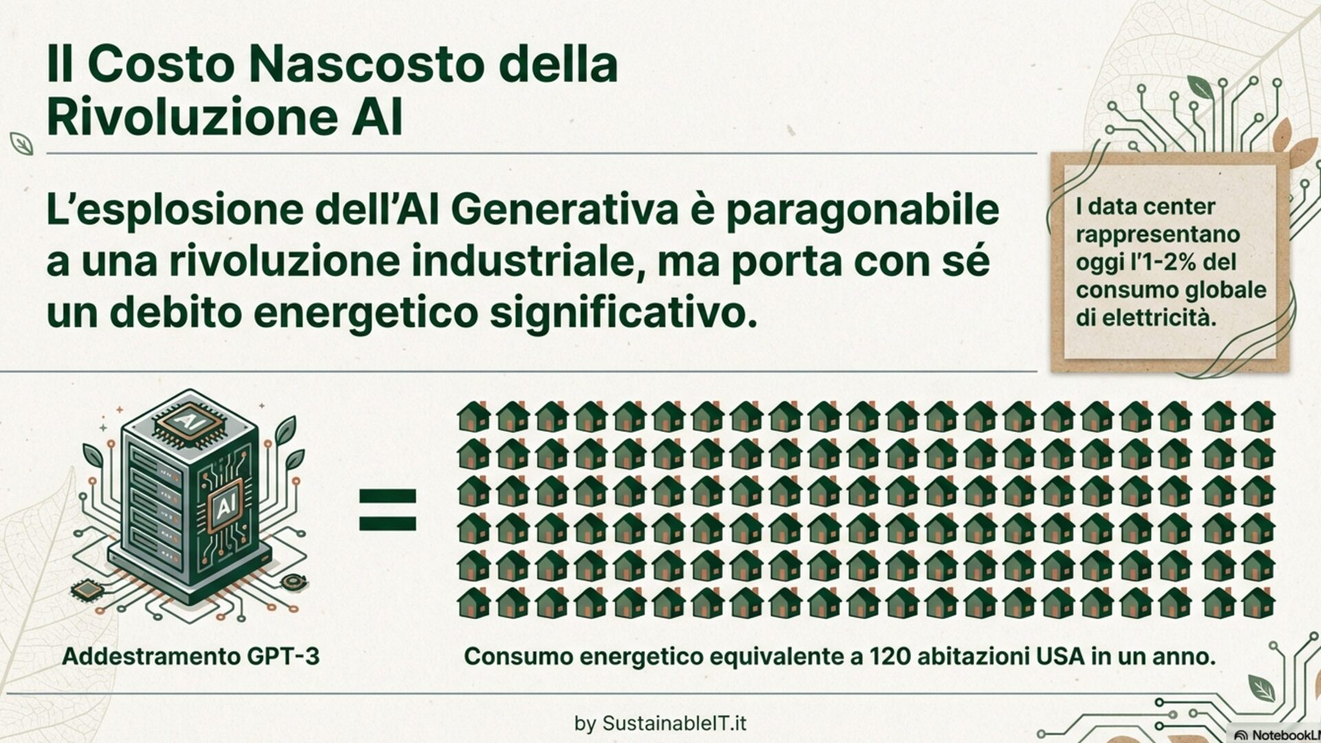 L'esplosione dell'intelligenza artificiale (AI), in particolare dei modelli generativi come GPT, ha portato a una trasformazione tecnologica paragonabile a quella della rivoluzione industriale. Tuttavia, questa crescita comporta un costo ambientale nascosto ma significativo: il consumo energetico e le emissioni di carbonio. I data center rappresentano oggi circa l'1-2% del consumo globale di elettricità e, se l'addestramento di un modello come GPT-3 richiede energia equivalente al consumo annuale di 120 abitazioni statunitensi, oggi si parla di un aumento di quasi 2000 volte.