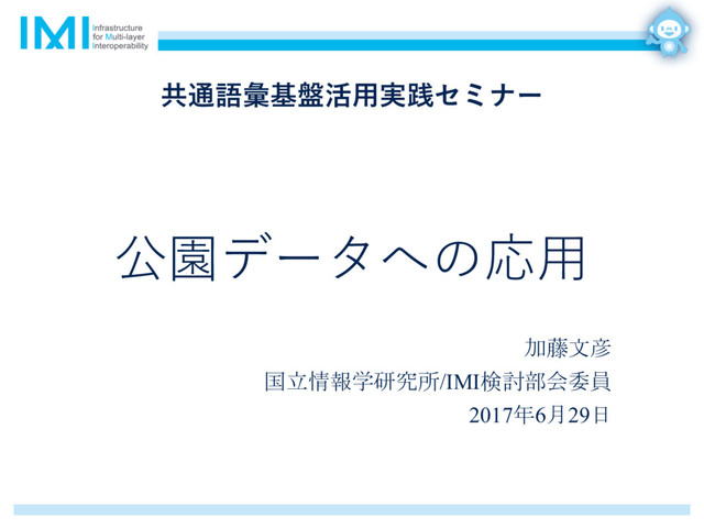 共通語彙基盤活⽤実践セミナー 公園データへの応⽤ 加藤文彦 国立情報学研究所/IMI検討部会委員 2017年6月29日