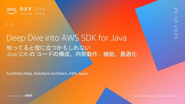 rights reserved. In Partnership with Deep Dive into AWS SDK for Java 知ってると役に立つかもしれない Java SDK の コードの構成、内部動作、機能、最適化 Fumihiko Hata, Solutions Architect, AWS Japan C - 2 2 0 . 1 0 . 2 0 2 0