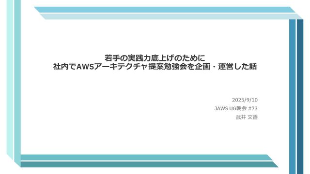お客様mtgの疑似体験で、お客様とのコミュニケーションにおける大切なポイントを学んだ - ヒアリングは「ただ情報収集のために質問を投げるのではなく、お客様にとってのメリットや、こちらの見解を 示しながら、意思決定を手伝う場」ということを学んだ 3. 提案書のインフラパートを作成し、インフラ担当の具体的な役割を理解 - 構成図、コスト見積り検討 → 理想的な設計とコスト制約とのトレードオフを考える視点を身に着けた - WBS、必要人員検討 → 要件定義から設計、構築、テスト、サービスインまでのプロセス中、インフラ担当が 「何をするのか」がタスクの粒度で分かるようになった