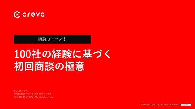 所在地 Crevo株式会社 東京都港区六本⽊4丁⽬8-5 和幸ビル502 050-1748-1535 25名(パートタイムも含む) 2012年6⽉5⽇ 100,000千円 ⽔⼝ 仁志 電話番号 従業員数 設⽴⽇ 資本⾦ 代表取締役 六本⽊にオフィスを構える創業13年⽬の企業 動画制作・動画コンサルティング事業のほか、 累計13億の資⾦調達も 動画制作・動画コンサルティング事業 SNSショート動画運⽤代⾏事業 伊藤忠テクノロジーベンチャーズ SMBCベンチャーキャピタル サイバーエージェント・キャピタル 他 事業内容 主な株主