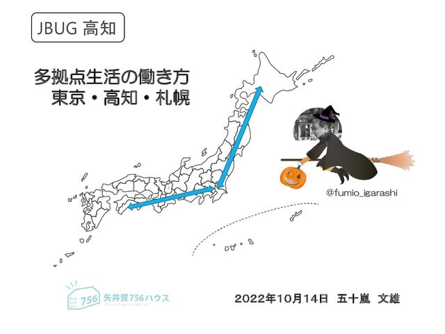 多拠点生活で重要なこと みんなの理解を得る ・多拠点生活者であることをオープンにして、理解を得る。 この人は多拠点生活なので、“オンラインの人“と思ってもらう 東京の人がわざわざ来てくれると感謝される リアル会議の日程の工夫 ・リアル会議は、場所ごとに集中させ、拠点間の移動を減らす ・ 高知を月中に設定 ・ その他拠点を月前半、月後半へ 移動コストを安くする ・ ホテルではなく、拠点は自前(空き家を購入) ・ 一泊ホテル付往復航空券を利用 期間中1泊だけホテルをつけるだけで25000円~35000円になる 仲間づくり ・知らない土地で暮らすためには、仲間づくりが重要 ・ご近所付き合い ・仕事以外で話ができる仲間をつくる 地域を楽しむ