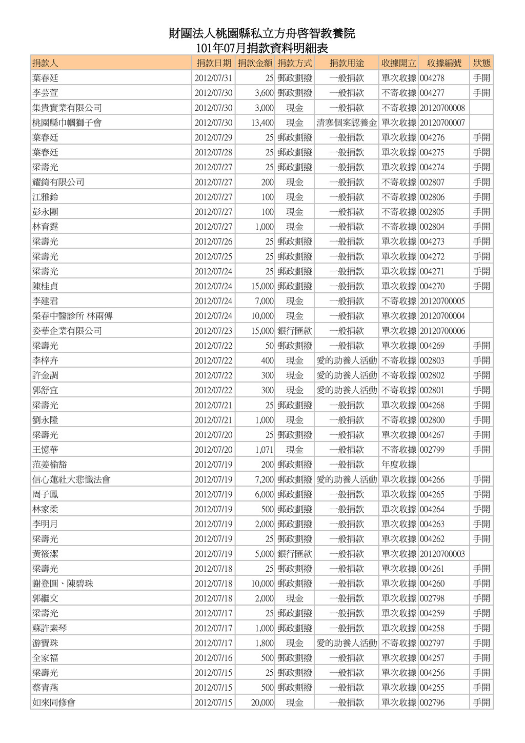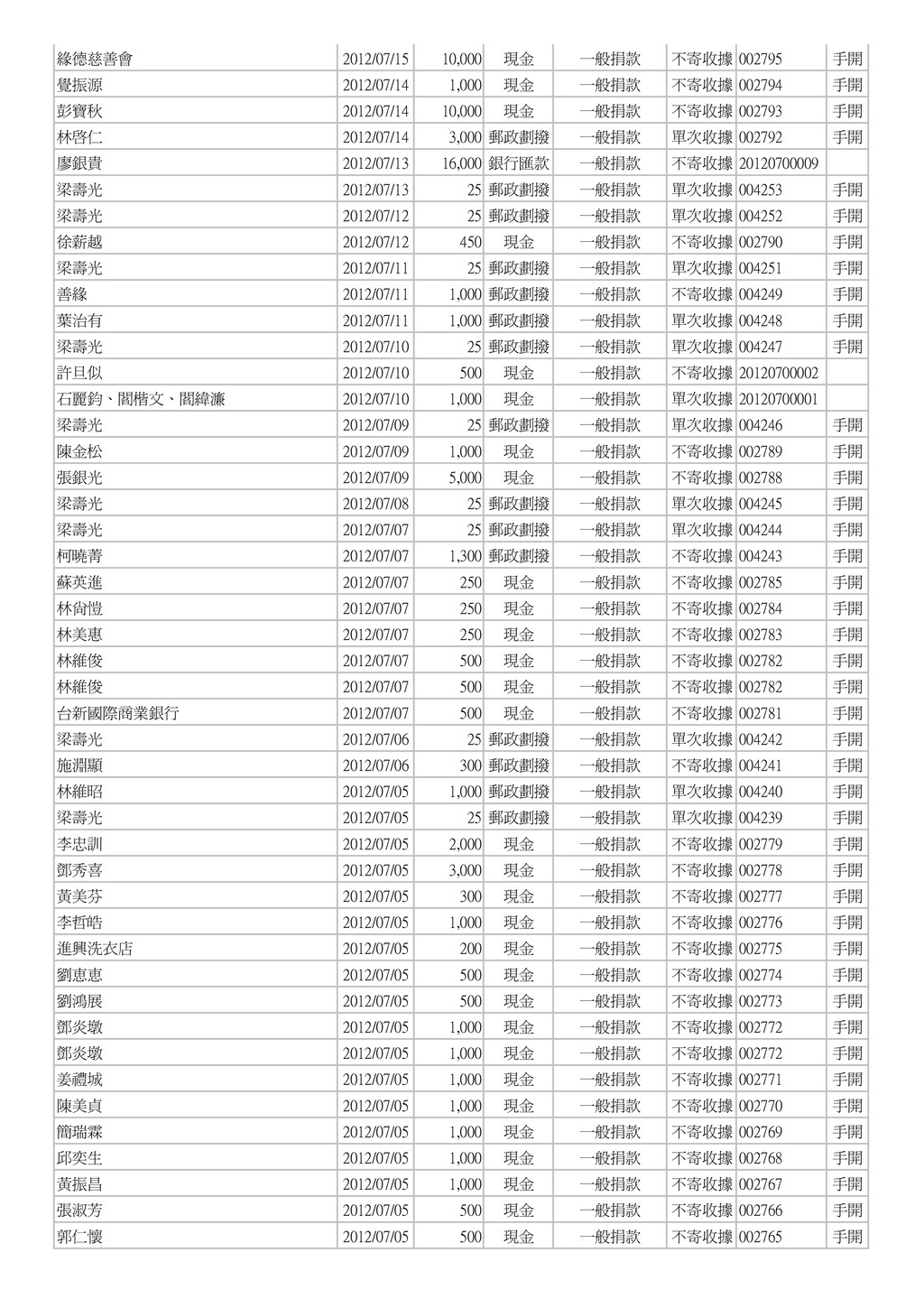 1,000 現金 一般捐款 不寄收據 002794 手開 彭寶秋 2012/07/14 10,000 現金 一般捐款 不寄收據 002793 手開 林啓仁 2012/07/14 3,000 郵政劃撥 一般捐款 單次收據 002792 手開 廖銀貴 2012/07/13 16,000 銀行匯款 一般捐款 不寄收據 20120700009 梁壽光 2012/07/13 25 郵政劃撥 一般捐款 單次收據 004253 手開 梁壽光 2012/07/12 25 郵政劃撥 一般捐款 單次收據 004252 手開 徐薪越 2012/07/12 450 現金 一般捐款 不寄收據 002790 手開 梁壽光 2012/07/11 25 郵政劃撥 一般捐款 單次收據 004251 手開 善緣 2012/07/11 1,000 郵政劃撥 一般捐款 不寄收據 004249 手開 葉治有 2012/07/11 1,000 郵政劃撥 一般捐款 單次收據 004248 手開 梁壽光 2012/07/10 25 郵政劃撥 一般捐款 單次收據 004247 手開 許旦似 2012/07/10 500 現金 一般捐款 不寄收據 20120700002 石麗鈞、閻楷文、閻緯濂 2012/07/10 1,000 現金 一般捐款 單次收據 20120700001 梁壽光 2012/07/09 25 郵政劃撥 一般捐款 單次收據 004246 手開 陳金松 2012/07/09 1,000 現金 一般捐款 不寄收據 002789 手開 張銀光 2012/07/09 5,000 現金 一般捐款 不寄收據 002788 手開 梁壽光 2012/07/08 25 郵政劃撥 一般捐款 單次收據 004245 手開 梁壽光 2012/07/07 25 郵政劃撥 一般捐款 單次收據 004244 手開 柯曉菁 2012/07/07 1,300 郵政劃撥 一般捐款 不寄收據 004243 手開 蘇英進 2012/07/07 250 現金 一般捐款 不寄收據 002785 手開 林尚愷 2012/07/07 250 現金 一般捐款 不寄收據 002784 手開 林美惠 2012/07/07 250 現金 一般捐款 不寄收據 002783 手開 林維俊 2012/07/07 500 現金 一般捐款 不寄收據 002782 手開 林維俊 2012/07/07 500 現金 一般捐款 不寄收據 002782 手開 台新國際商業銀行 2012/07/07 500 現金 一般捐款 不寄收據 002781 手開 梁壽光 2012/07/06 25 郵政劃撥 一般捐款 單次收據 004242 手開 施淵顯 2012/07/06 300 郵政劃撥 一般捐款 不寄收據 004241 手開 林維昭 2012/07/05 1,000 郵政劃撥 一般捐款 單次收據 004240 手開 梁壽光 2012/07/05 25 郵政劃撥 一般捐款 單次收據 004239 手開 李忠訓 2012/07/05 2,000 現金 一般捐款 不寄收據 002779 手開 鄧秀喜 2012/07/05 3,000 現金 一般捐款 不寄收據 002778 手開 黃美芬 2012/07/05 300 現金 一般捐款 不寄收據 002777 手開 李哲皓 2012/07/05 1,000 現金 一般捐款 不寄收據 002776 手開 進興洗衣店 2012/07/05 200 現金 一般捐款 不寄收據 002775 手開 劉恵恵 2012/07/05 500 現金 一般捐款 不寄收據 002774 手開 劉鴻展 2012/07/05 500 現金 一般捐款 不寄收據 002773 手開 鄧炎墩 2012/07/05 1,000 現金 一般捐款 不寄收據 002772 手開 鄧炎墩 2012/07/05 1,000 現金 一般捐款 不寄收據 002772 手開 姜禮城 2012/07/05 1,000 現金 一般捐款 不寄收據 002771 手開 陳美貞 2012/07/05 1,000 現金 一般捐款 不寄收據 002770 手開 簡瑞霖 2012/07/05 1,000 現金 一般捐款 不寄收據 002769 手開 邱奕生 2012/07/05 1,000 現金 一般捐款 不寄收據 002768 手開 黃振昌 2012/07/05 1,000 現金 一般捐款 不寄收據 002767 手開 張淑芳 2012/07/05 500 現金 一般捐款 不寄收據 002766 手開 郭仁懷 2012/07/05 500 現金 一般捐款 不寄收據 002765 手開