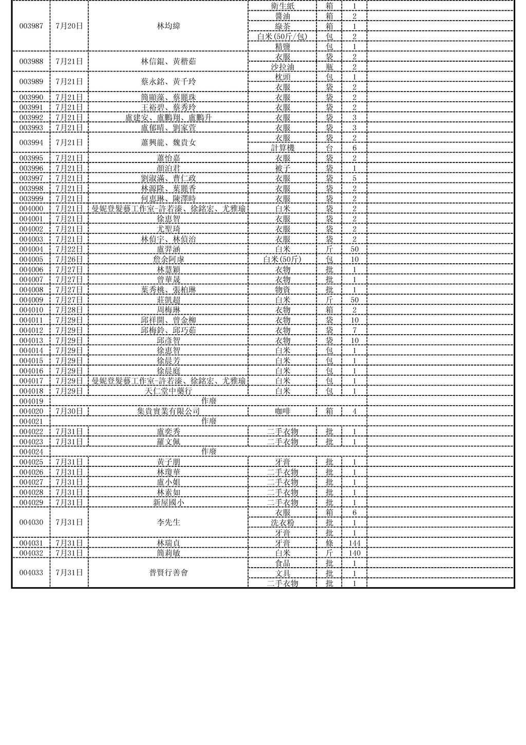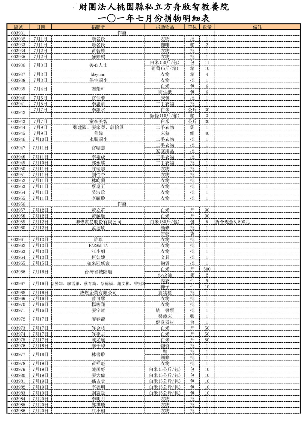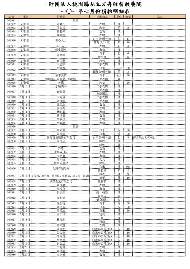 隱名氏 衣物 批 1 003933 7月1日 隱名氏 咖啡 箱 2 003934 7月2日 黃若嬋 衣物 批 1 003935 7月2日 蘇婷娟 衣物 批 1 白米(50斤/包) 包 11 葡萄(5斤/箱) 箱 10 003937 7月3日 Meyuan 衣物 箱 4 003938 7月3日 保生國小 衣物 批 1 白米 包 6 衛生紙 包 6 003940 7月5日 官佳蓉 床包 批 1 003941 7月5日 李忠訓 二手衣物 批 1 7月7日 李銀水 白米 公斤 30 麵條(10斤/箱) 箱 3 003943 7月7日 童李美智 白米 公斤 30 003944 7月9日 張建國、張家榮、郭怡眞 二手衣物 袋 1 003945 7月9日 善緣 床墊 組 40 003946 7月10日 永順國小 二手衣物 批 1 二手衣物 批 1 家庭用品 批 1 003948 7月11日 李裕成 二手衣物 批 1 003949 7月10日 郭永勝 二手衣物 批 1 003950 7月11日 許瑞志 衣物 批 1 003951 7月11日 劉怡杏 衣物 批 1 003952 7月11日 林昀蓁 衣物 批 1 003953 7月11日 蔡崑五 衣物 批 1 003954 7月11日 吳淑珍 衣物 批 1 003955 7月11日 李毓聆 衣物 批 1 003956 003957 7月12日 黃立群 白米 斤 90 003958 7月12日 黃越顯 白米 斤 90 003959 7月12日 聯傳貿易股份有限公司 白米(50斤/包) 包 5 折合現金5,500元 003960 7月12日 范達欣 麵條 批 1 餅乾 袋 1 003961 7月13日 許珍 衣物 批 1 003962 7月13日 FARAMITA 衣物 批 1 003963 7月13日 江小姐 衣物 批 1 003964 7月13日 何如婕 文具 批 1 003965 7月15日 如來同修會 物資 批 1 白米 斤 500 沙拉油 箱 2 內衣 件 9 褲子 件 10 003968 7月16日 成煜企業有限公司 置物櫃 批 1 003969 7月16日 曾可馨 衣物 批 1 003970 7月16日 楊竣翔 衣物 批 1 003971 7月16日 張宇銍 統一發票 批 1 醫療床 張 1 健身器材 台 1 003973 7月17日 許金枝 白米 斤 50 003974 7月17日 許宇志 白米 斤 50 003975 7月17日 陳采瑜 白米 斤 50 003976 7月18日 廖千瑋 物資 批 1 鞋 批 1 麵條 批 1 003978 7月19日 黃祥魁 衣物 批 1 003979 7月19日 陳函妤 白米(5公斤/包) 包 10 003980 7月19日 張大偉 白米(5公斤/包) 包 10 003981 7月19日 孫吉貴 白米(5公斤/包) 包 10 003982 7月19日 李德明 白米(5公斤/包) 包 10 003983 7月19日 劉宸誌 白米(5公斤/包) 包 10 003984 7月20日 李明月 衣物 批 1 003985 7月20日 鄭祺騰 衣物 批 1 003986 7月20日 江小姐 衣物 批 1 廖春龍 7月17日 003972 003977 7月18日 林書聆 003966 003967 7月16日 蔡晏翎、廖雪雁、蔡育綸、蔡德福、趙文彬、曾冠雄 7月4日 謝榮軒 作廢 台灣省城隍廟 7月16日 作廢 官咖慧 7月11日 財團法人桃園縣私立方舟啟智教養院 ㄧ◦一年七月份捐物明細表 003942 003939 003936 7月3日 善心人士 003947