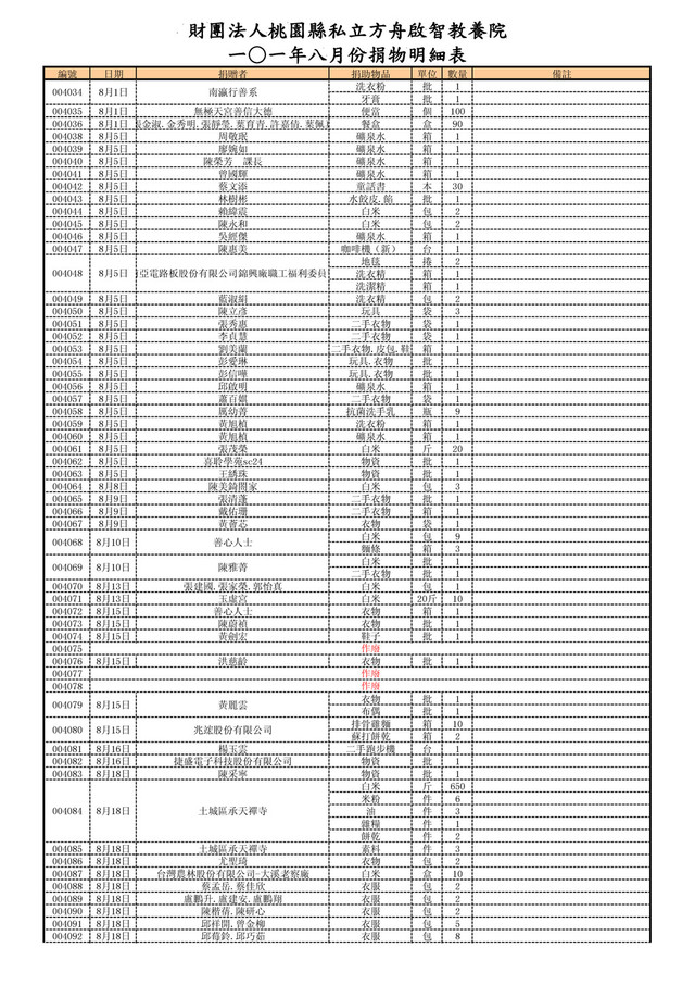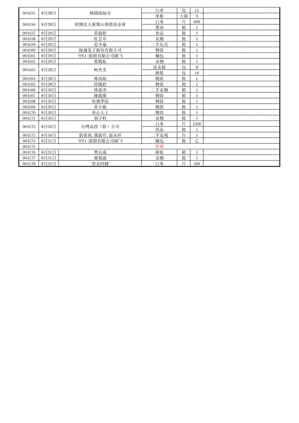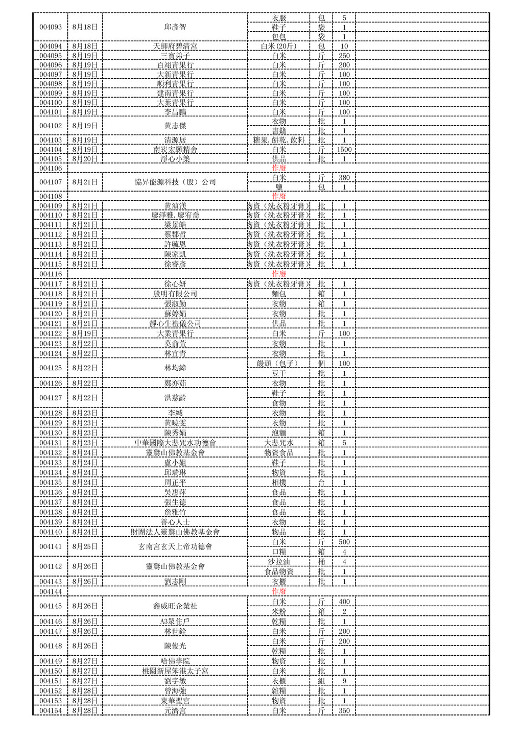 8月18日 天師府碧清宮 白米(20斤) 包 10 004095 8月19日 三寶弟子 白米 斤 250 004096 8月19日 百翊青果行 白米 斤 200 004097 8月19日 大新青果行 白米 斤 100 004098 8月19日 順利青果行 白米 斤 100 004099 8月19日 建南青果行 白米 斤 100 004100 8月19日 大葉青果行 白米 斤 100 004101 8月19日 李昌鵬 白米 斤 100 衣物 批 1 書籍 批 1 004103 8月19日 清源居 糖果.餅乾.飲料 批 1 004104 8月19日 南崁宏願精舍 白米 斤 1500 004105 8月20日 淨心小築 供品 批 1 004106 白米 斤 380 鹽 包 1 004108 004109 8月21日 黃湞渼 物資(洗衣粉牙膏) 批 1 004110 8月21日 廖淨雅.廖宥喬 物資(洗衣粉牙膏) 批 1 004111 8月21日 梁景皓 物資(洗衣粉牙膏) 批 1 004112 8月21日 蔡郡哲 物資(洗衣粉牙膏) 批 1 004113 8月21日 許毓恩 物資(洗衣粉牙膏) 批 1 004114 8月21日 陳家凱 物資(洗衣粉牙膏) 批 1 004115 8月21日 徐睿彥 物資(洗衣粉牙膏) 批 1 004116 004117 8月21日 徐心妍 物資(洗衣粉牙膏) 批 1 004118 8月21日 殷明有限公司 麵包 箱 1 004119 8月21日 張淑勤 衣物 箱 1 004120 8月21日 蘇婷娟 衣物 批 1 004121 8月21日 靜心生禮儀公司 供品 批 1 004122 8月19日 大業青果行 白米 斤 100 004123 8月22日 莫俞萱 衣物 批 1 004124 8月22日 林宜青 衣物 批 1 饅頭(包子) 個 100 豆干 批 1 004126 8月22日 鄭亦茹 衣物 批 1 鞋子 批 1 食物 批 1 004128 8月23日 李緘 衣物 批 1 004129 8月23日 黃曉雯 衣物 批 1 004130 8月23日 陳秀娟 泡麵 箱 1 004131 8月23日 中華國際大悲咒水功德會 大悲咒水 箱 5 004132 8月24日 靈鷲山佛教基金會 物資食品 批 1 004133 8月24日 盧小姐 鞋子 批 1 004134 8月24日 邱瑞琳 物資 批 1 004135 8月24日 周正平 相機 台 1 004136 8月24日 吳惠萍 食品 批 1 004137 8月24日 張生德 食品 批 1 004138 8月24日 詹雅竹 食品 批 1 004139 8月24日 善心人士 衣物 批 1 004140 8月24日 財團法人靈鷲山佛教基金會 物品 批 1 白米 斤 500 口糧 箱 4 沙拉油 桶 4 食品物資 批 1 004143 8月26日 劉志剛 衣櫃 批 1 004144 白米 斤 400 米粉 箱 2 004146 8月26日 A3眾住戶 乾糧 批 1 004147 8月26日 林世銓 白米 斤 200 白米 斤 200 乾糧 批 1 004149 8月27日 哈佛學院 物資 批 1 004150 8月27日 桃園新屋笨港太子宮 白米 批 1 004151 8月27日 劉字敏 衣櫃 組 9 004152 8月28日 曾海強 雜糧 批 1 004153 8月28日 東華聖宮 物資 批 1 004154 8月28日 元濟宮 白米 斤 350 004127 8月22日 洪慈齡 004093 8月18日 邱彥智 004102 8月19日 黃志傑 作廢 004107 8月21日 協昇能源科技(股)公司 作廢 作廢 004125 8月22日 林均緯 004141 8月25日 玄南宮玄天上帝功德會 004142 8月26日 靈鷲山佛教基金會 作廢 004145 8月26日 鑫威旺企業社 004148 8月26日 陳俊光