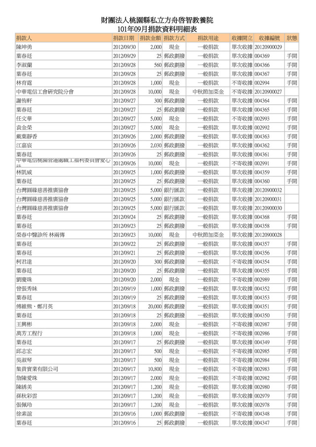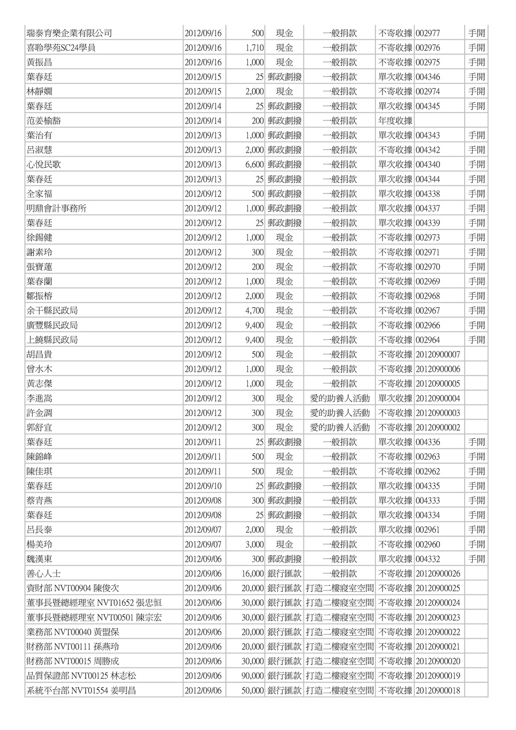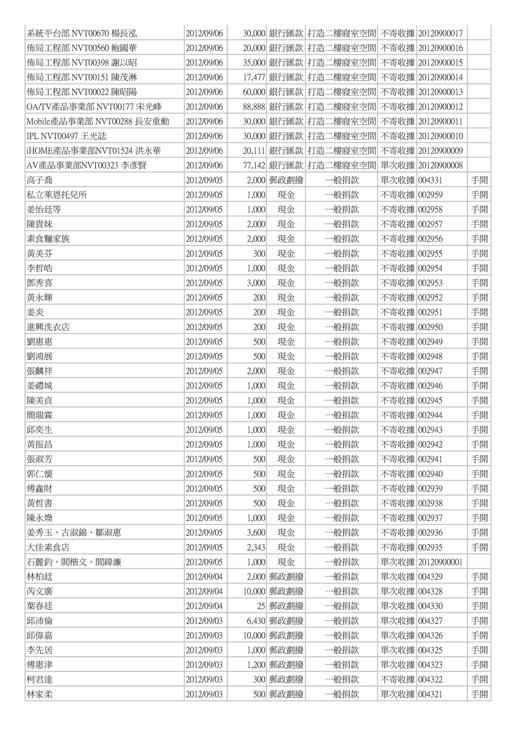 NVT00560 鲍國華 2012/09/06 20,000 銀行匯款 打造二樓寢室空間 不寄收據 20120900016 佈局工程部 NVT00398 謝以昭 2012/09/06 35,000 銀行匯款 打造二樓寢室空間 不寄收據 20120900015 佈局工程部 NVT00151 陳茂淋 2012/09/06 17,477 銀行匯款 打造二樓寢室空間 不寄收據 20120900014 佈局工程部 NVT00022 陳昭陽 2012/09/06 60,000 銀行匯款 打造二樓寢室空間 不寄收據 20120900013 OA/TV產品事業部 NVT00177 宋光峰 2012/09/06 88,888 銀行匯款 打造二樓寢室空間 不寄收據 20120900012 Mobile產品事業部 NVT00288 長安重勳 2012/09/06 30,000 銀行匯款 打造二樓寢室空間 不寄收據 20120900011 IPL NVT00497 王光誌 2012/09/06 30,000 銀行匯款 打造二樓寢室空間 不寄收據 20120900010 iHOME產品事業部NVT01524 洪永華 2012/09/06 20,111 銀行匯款 打造二樓寢室空間 不寄收據 20120900009 AV產品事業部NVT00323 李彥賢 2012/09/06 77,142 銀行匯款 打造二樓寢室空間 單次收據 20120900008 高子喬 2012/09/05 2,000 郵政劃撥 一般捐款 單次收據 004331 手開 私立萊恩托兒所 2012/09/05 1,000 現金 一般捐款 不寄收據 002959 手開 姜怡廷等 2012/09/05 1,000 現金 一般捐款 不寄收據 002958 手開 陳貴妹 2012/09/05 2,000 現金 一般捐款 不寄收據 002957 手開 素食麵家族 2012/09/05 2,000 現金 一般捐款 不寄收據 002956 手開 黃美芬 2012/09/05 300 現金 一般捐款 不寄收據 002955 手開 李哲皓 2012/09/05 1,000 現金 一般捐款 不寄收據 002954 手開 鄧秀喜 2012/09/05 3,000 現金 一般捐款 不寄收據 002953 手開 黃永輝 2012/09/05 200 現金 一般捐款 不寄收據 002952 手開 姜炎 2012/09/05 200 現金 一般捐款 不寄收據 002951 手開 進興洗衣店 2012/09/05 200 現金 一般捐款 不寄收據 002950 手開 劉惠惠 2012/09/05 500 現金 一般捐款 不寄收據 002949 手開 劉鴻展 2012/09/05 500 現金 一般捐款 不寄收據 002948 手開 張麟祥 2012/09/05 2,000 現金 一般捐款 不寄收據 002947 手開 姜禮城 2012/09/05 1,000 現金 一般捐款 不寄收據 002946 手開 陳美貞 2012/09/05 1,000 現金 一般捐款 不寄收據 002945 手開 簡瑞霖 2012/09/05 1,000 現金 一般捐款 不寄收據 002944 手開 邱奕生 2012/09/05 1,000 現金 一般捐款 不寄收據 002943 手開 黃振昌 2012/09/05 1,000 現金 一般捐款 不寄收據 002942 手開 張淑芳 2012/09/05 500 現金 一般捐款 不寄收據 002941 手開 郭仁懷 2012/09/05 500 現金 一般捐款 不寄收據 002940 手開 傅鑫財 2012/09/05 500 現金 一般捐款 不寄收據 002939 手開 黃哲書 2012/09/05 500 現金 一般捐款 不寄收據 002938 手開 陳永煥 2012/09/05 1,000 現金 一般捐款 不寄收據 002937 手開 姜秀玉、古淑錦、鄒淑惠 2012/09/05 3,600 現金 一般捐款 不寄收據 002936 手開 大佳素食店 2012/09/05 2,343 現金 一般捐款 不寄收據 002935 手開 石麗鈞、閻楷文、閻緯濂 2012/09/05 1,000 現金 一般捐款 單次收據 20120900001 林柏廷 2012/09/04 2,000 郵政劃撥 一般捐款 單次收據 004329 手開 芮文廣 2012/09/04 10,000 郵政劃撥 一般捐款 單次收據 004328 手開 葉春廷 2012/09/04 25 郵政劃撥 一般捐款 單次收據 004330 手開 邱沛倫 2012/09/03 6,430 郵政劃撥 一般捐款 單次收據 004327 手開 邱偉嘉 2012/09/03 10,000 郵政劃撥 一般捐款 單次收據 004326 手開 李先居 2012/09/03 1,000 郵政劃撥 一般捐款 單次收據 004325 手開 傅惠津 2012/09/03 1,200 郵政劃撥 一般捐款 單次收據 004323 手開 柯君達 2012/09/03 300 郵政劃撥 一般捐款 不寄收據 004322 手開 林家柔 2012/09/03 500 郵政劃撥 一般捐款 單次收據 004321 手開