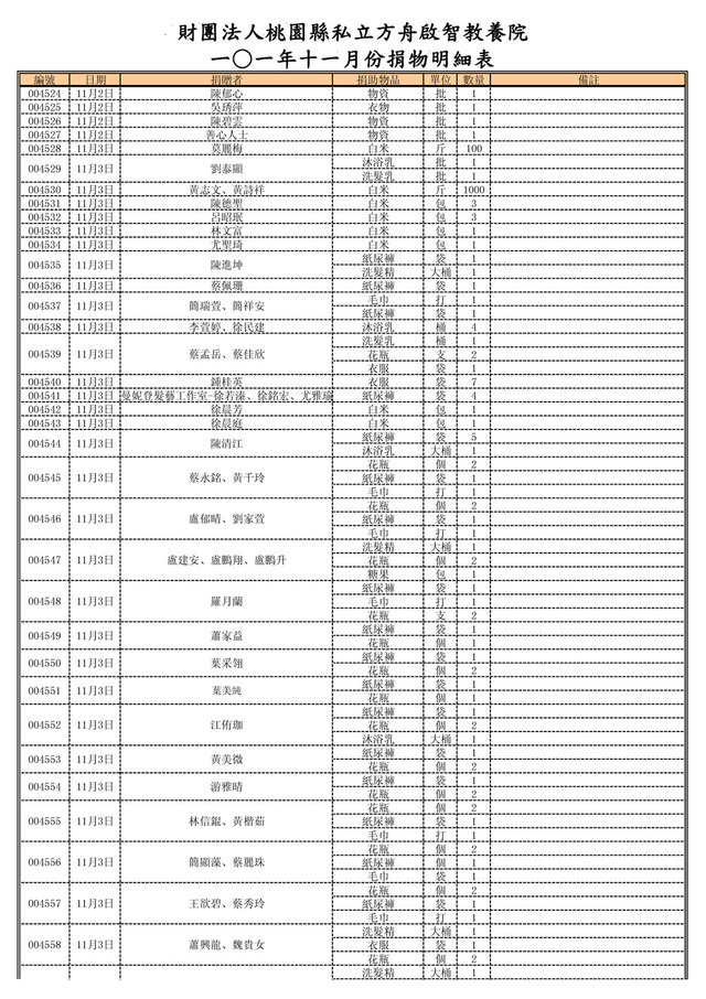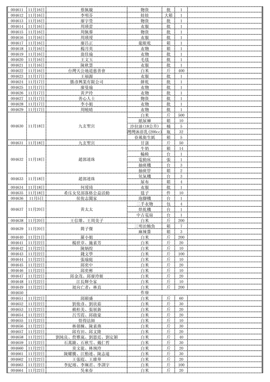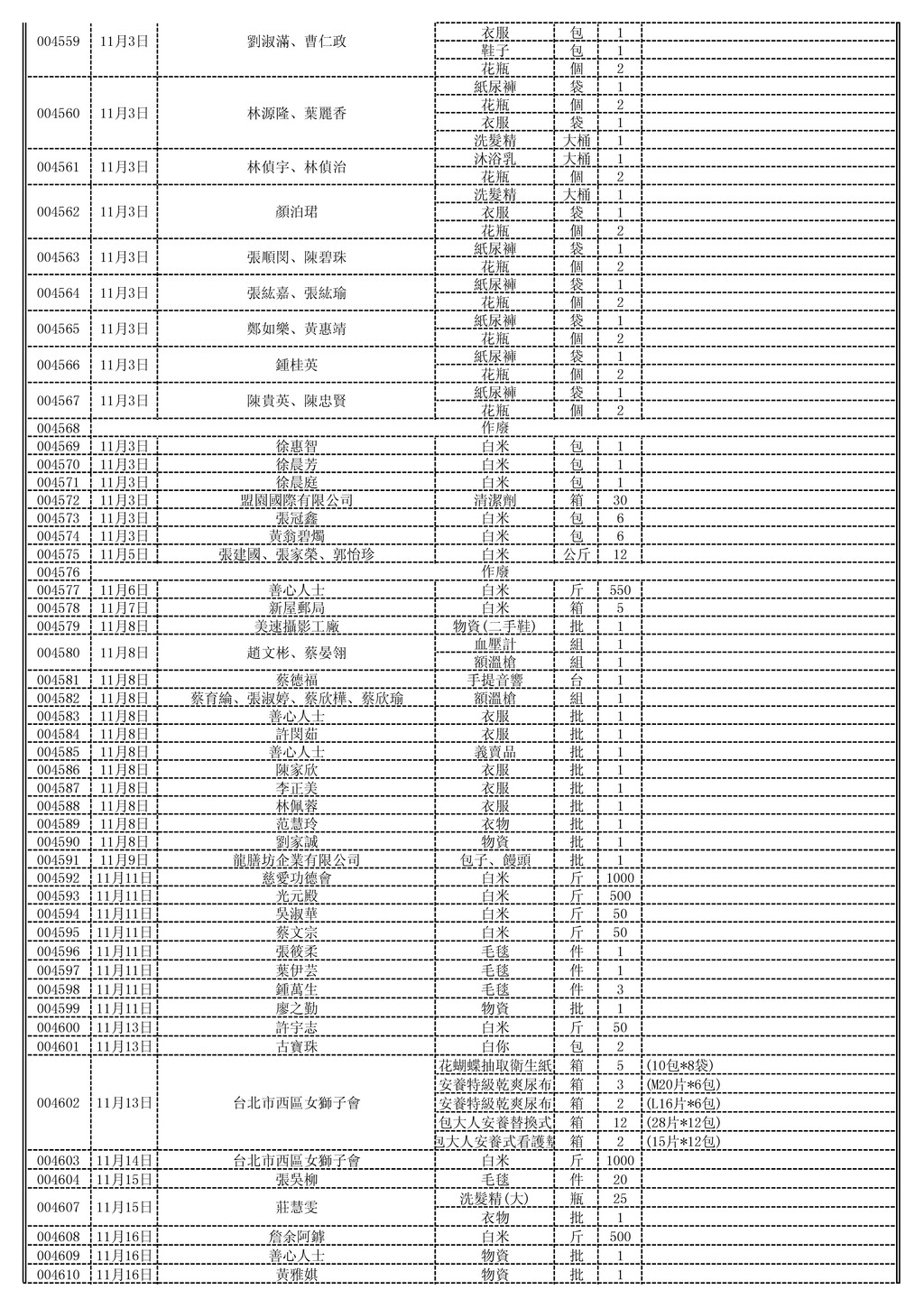 袋 1 花瓶 個 2 衣服 袋 1 洗髮精 大桶 1 沐浴乳 大桶 1 花瓶 個 2 洗髮精 大桶 1 衣服 袋 1 花瓶 個 2 紙尿褲 袋 1 花瓶 個 2 紙尿褲 袋 1 花瓶 個 2 紙尿褲 袋 1 花瓶 個 2 紙尿褲 袋 1 花瓶 個 2 紙尿褲 袋 1 花瓶 個 2 004568 004569 11月3日 徐惠智 白米 包 1 004570 11月3日 徐晨芳 白米 包 1 004571 11月3日 徐晨庭 白米 包 1 004572 11月3日 盟園國際有限公司 清潔劑 箱 30 004573 11月3日 張冠鑫 白米 包 6 004574 11月3日 黃翁碧燭 白米 包 6 004575 11月5日 張建國、張家榮、郭怡珍 白米 公斤 12 004576 004577 11月6日 善心人士 白米 斤 550 004578 11月7日 新屋郵局 白米 箱 5 004579 11月8日 美速攝影工廠 物資(二手鞋) 批 1 血壓計 組 1 額溫槍 組 1 004581 11月8日 蔡德福 手提音響 台 1 004582 11月8日 蔡育綸、張淑婷、蔡欣樺、蔡欣瑜 額溫槍 組 1 004583 11月8日 善心人士 衣服 批 1 004584 11月8日 許閔茹 衣服 批 1 004585 11月8日 善心人士 義賣品 批 1 004586 11月8日 陳家欣 衣服 批 1 004587 11月8日 李正美 衣服 批 1 004588 11月8日 林佩蓉 衣服 批 1 004589 11月8日 范慧玲 衣物 批 1 004590 11月8日 劉家誠 物資 批 1 004591 11月9日 龍膳坊企業有限公司 包子、饅頭 批 1 004592 11月11日 慈愛功德會 白米 斤 1000 004593 11月11日 光元殿 白米 斤 500 004594 11月11日 吳淑華 白米 斤 50 004595 11月11日 蔡文宗 白米 斤 50 004596 11月11日 張筱柔 毛毯 件 1 004597 11月11日 葉伊芸 毛毯 件 1 004598 11月11日 鍾萬生 毛毯 件 3 004599 11月11日 廖之勤 物資 批 1 004600 11月13日 許宇志 白米 斤 50 004601 11月13日 古寶珠 白你 包 2 花蝴蝶抽取衛生紙 箱 5 (10包*8袋) 安養特級乾爽尿布 箱 3 (M20片*6包) 安養特級乾爽尿布 箱 2 (L16片*6包) 包大人安養替換式 箱 12 (28片*12包) 包大人安養式看護墊 箱 2 (15片*12包) 004603 11月14日 台北市西區女獅子會 白米 斤 1000 004604 11月15日 張吳柳 毛毯 件 20 洗髮精(大) 瓶 25 衣物 批 1 004608 11月16日 詹余阿鎼 白米 斤 500 004609 11月16日 善心人士 物資 批 1 004610 11月16日 黃雅娸 物資 批 1 004580 11月8日 趙文彬、蔡晏翎 陳貴英、陳忠賢 11月3日 004567 作廢 作廢 004565 11月3日 鄭如樂、黃惠靖 004566 11月3日 鍾桂英 004563 11月3日 張順閔、陳碧珠 張紘嘉、張紘瑜 11月3日 004564 004561 11月3日 林偵宇、林偵治 004562 11月3日 顏泊珺 劉淑滿、曹仁政 11月3日 004559 004560 11月3日 林源隆、葉麗香 004602 11月13日 台北市西區女獅子會 莊慧雯 11月15日 004607