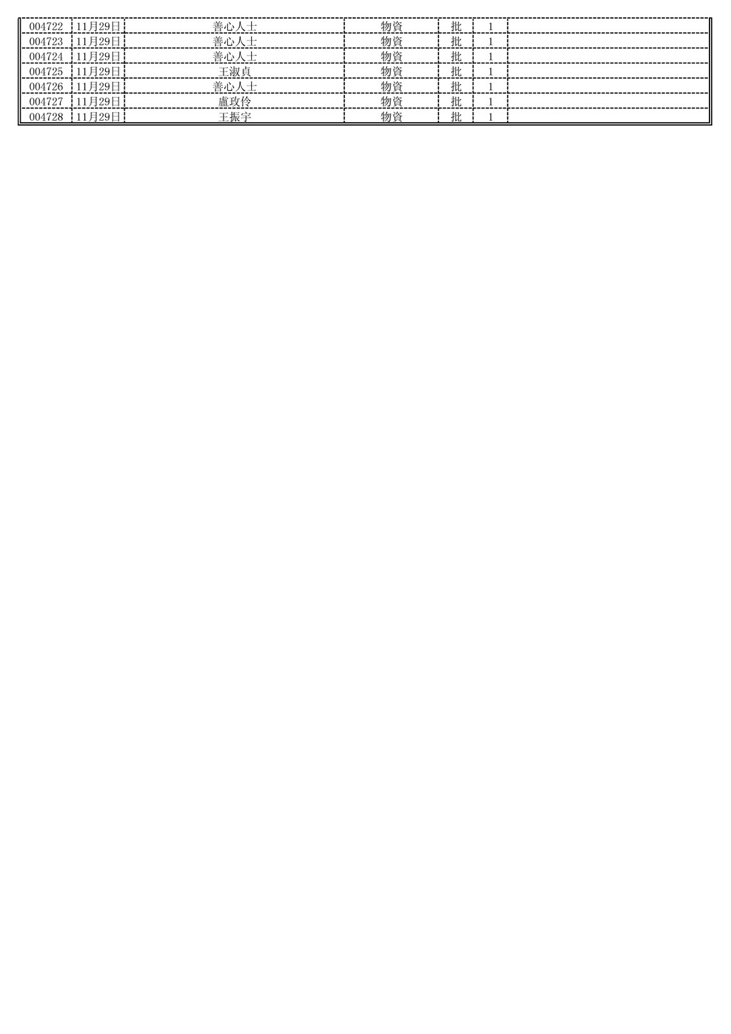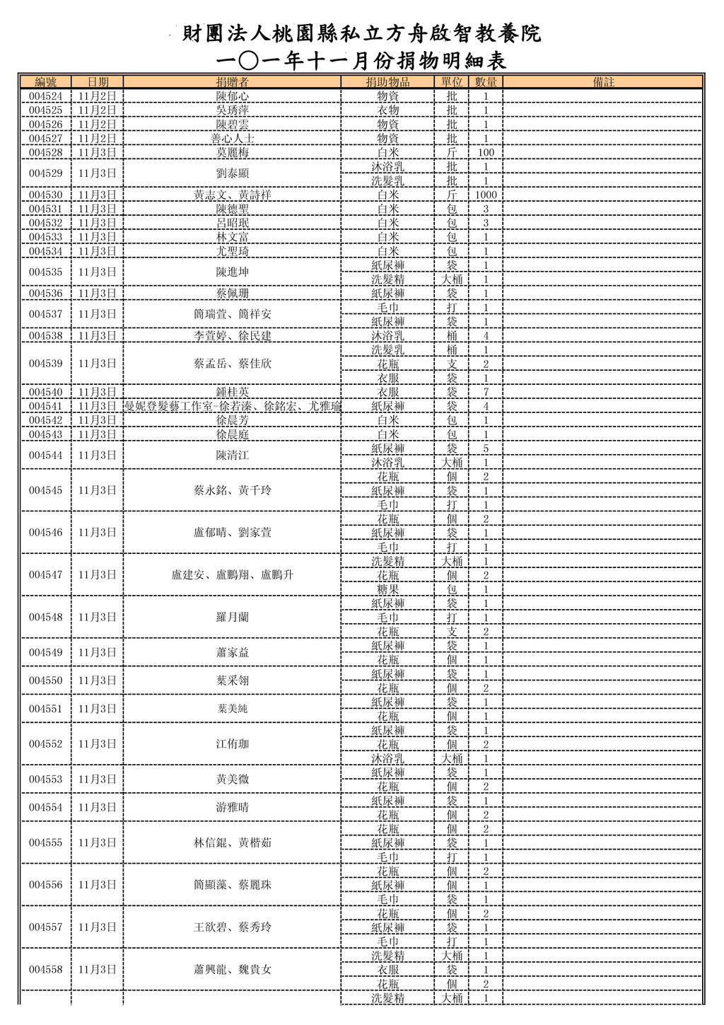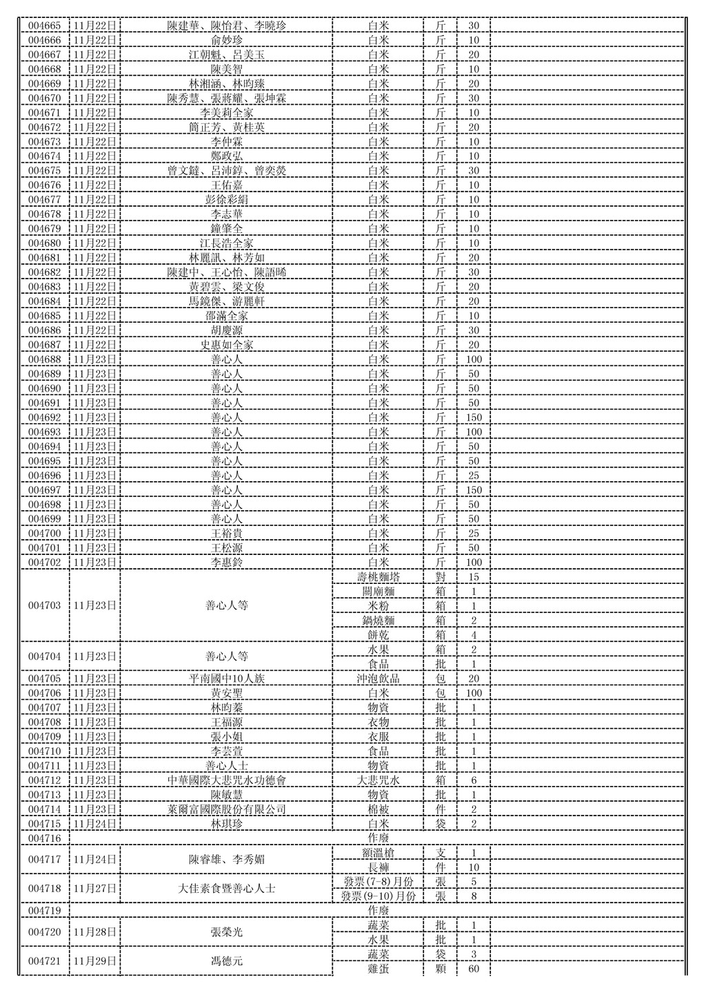 袋 1 花瓶 個 2 衣服 袋 1 洗髮精 大桶 1 沐浴乳 大桶 1 花瓶 個 2 洗髮精 大桶 1 衣服 袋 1 花瓶 個 2 紙尿褲 袋 1 花瓶 個 2 紙尿褲 袋 1 花瓶 個 2 紙尿褲 袋 1 花瓶 個 2 紙尿褲 袋 1 花瓶 個 2 紙尿褲 袋 1 花瓶 個 2 004568 004569 11月3日 徐惠智 白米 包 1 004570 11月3日 徐晨芳 白米 包 1 004571 11月3日 徐晨庭 白米 包 1 004572 11月3日 盟園國際有限公司 清潔劑 箱 30 004573 11月3日 張冠鑫 白米 包 6 004574 11月3日 黃翁碧燭 白米 包 6 004575 11月5日 張建國、張家榮、郭怡珍 白米 公斤 12 004576 004577 11月6日 善心人士 白米 斤 550 004578 11月7日 新屋郵局 白米 箱 5 004579 11月8日 美速攝影工廠 物資(二手鞋) 批 1 血壓計 組 1 額溫槍 組 1 004581 11月8日 蔡德福 手提音響 台 1 004582 11月8日 蔡育綸、張淑婷、蔡欣樺、蔡欣瑜 額溫槍 組 1 004583 11月8日 善心人士 衣服 批 1 004584 11月8日 許閔茹 衣服 批 1 004585 11月8日 善心人士 義賣品 批 1 004586 11月8日 陳家欣 衣服 批 1 004587 11月8日 李正美 衣服 批 1 004588 11月8日 林佩蓉 衣服 批 1 004589 11月8日 范慧玲 衣物 批 1 004590 11月8日 劉家誠 物資 批 1 004591 11月9日 龍膳坊企業有限公司 包子、饅頭 批 1 004592 11月11日 慈愛功德會 白米 斤 1000 004593 11月11日 光元殿 白米 斤 500 004594 11月11日 吳淑華 白米 斤 50 004595 11月11日 蔡文宗 白米 斤 50 004596 11月11日 張筱柔 毛毯 件 1 004597 11月11日 葉伊芸 毛毯 件 1 004598 11月11日 鍾萬生 毛毯 件 3 004599 11月11日 廖之勤 物資 批 1 004600 11月13日 許宇志 白米 斤 50 004601 11月13日 古寶珠 白你 包 2 花蝴蝶抽取衛生紙 箱 5 (10包*8袋) 安養特級乾爽尿布 箱 3 (M20片*6包) 安養特級乾爽尿布 箱 2 (L16片*6包) 包大人安養替換式 箱 12 (28片*12包) 包大人安養式看護墊 箱 2 (15片*12包) 004603 11月14日 台北市西區女獅子會 白米 斤 1000 004604 11月15日 張吳柳 毛毯 件 20 洗髮精(大) 瓶 25 衣物 批 1 004608 11月16日 詹余阿鎼 白米 斤 500 004609 11月16日 善心人士 物資 批 1 004610 11月16日 黃雅娸 物資 批 1 004580 11月8日 趙文彬、蔡晏翎 陳貴英、陳忠賢 11月3日 004567 作廢 作廢 004565 11月3日 鄭如樂、黃惠靖 004566 11月3日 鍾桂英 004563 11月3日 張順閔、陳碧珠 張紘嘉、張紘瑜 11月3日 004564 004561 11月3日 林偵宇、林偵治 004562 11月3日 顏泊珺 劉淑滿、曹仁政 11月3日 004559 004560 11月3日 林源隆、葉麗香 004602 11月13日 台北市西區女獅子會 莊慧雯 11月15日 004607