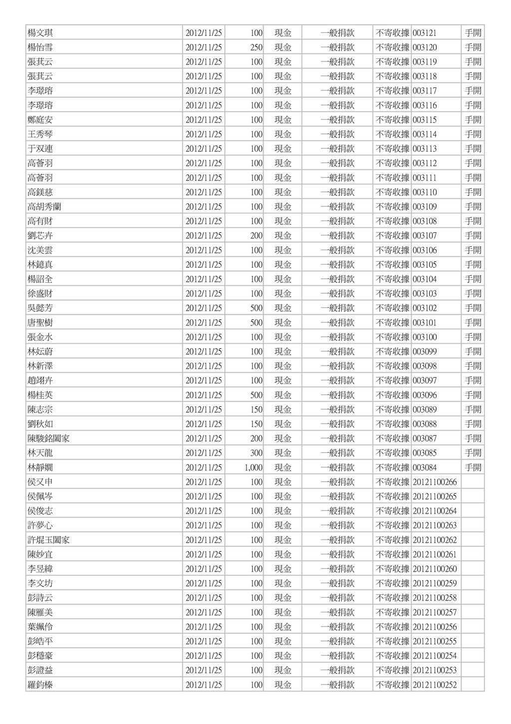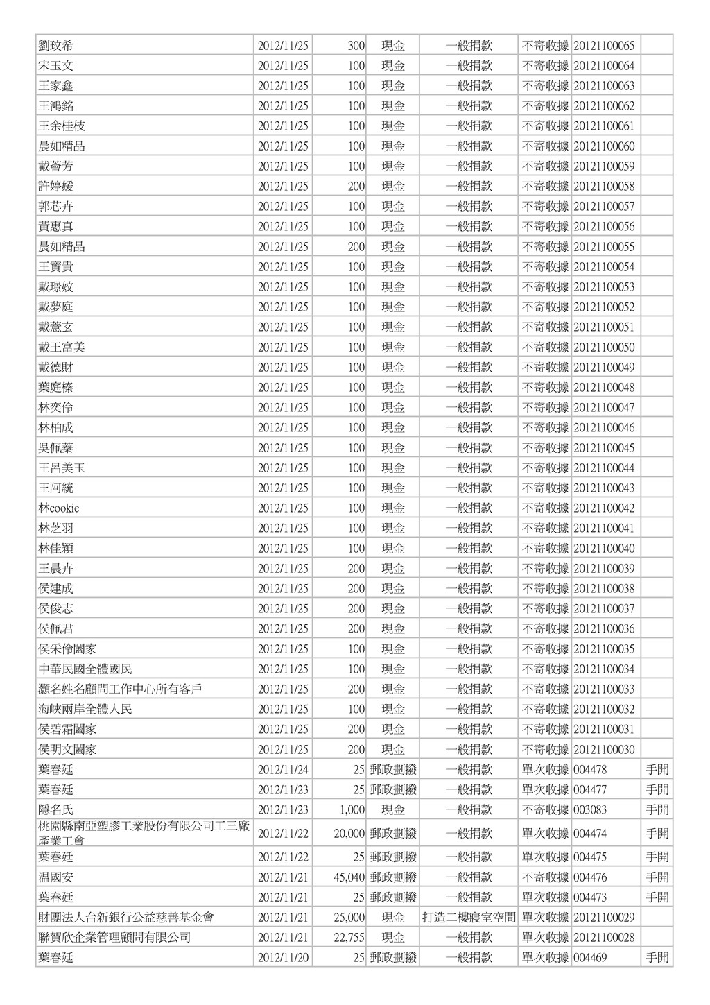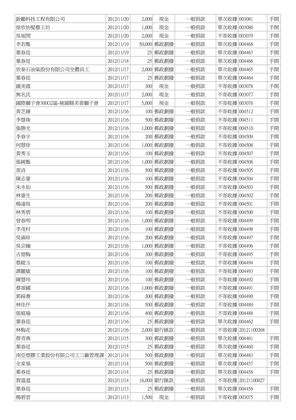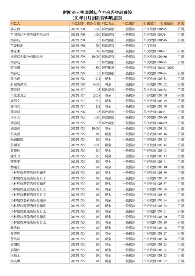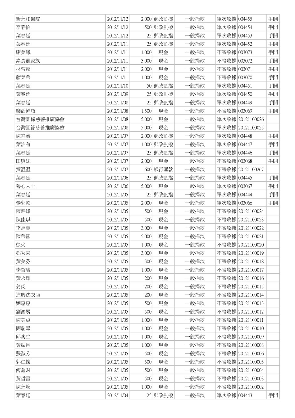 500 郵政劃撥 一般捐款 單次收據 004454 手開 葉春廷 2012/11/12 25 郵政劃撥 一般捐款 單次收據 004453 手開 葉春廷 2012/11/11 25 郵政劃撥 一般捐款 單次收據 004452 手開 康美鳳 2012/11/11 1,000 現金 一般捐款 不寄收據 003073 手開 素食麵家族 2012/11/11 3,000 現金 一般捐款 不寄收據 003072 手開 林育霆 2012/11/11 2,000 現金 一般捐款 不寄收據 003071 手開 蕭榮華 2012/11/11 1,000 現金 一般捐款 不寄收據 003070 手開 葉春廷 2012/11/10 50 郵政劃撥 一般捐款 單次收據 004451 手開 葉春廷 2012/11/09 25 郵政劃撥 一般捐款 單次收據 004450 手開 葉春廷 2012/11/08 25 郵政劃撥 一般捐款 單次收據 004449 手開 樂活鮮瓶 2012/11/08 1,500 現金 一般捐款 不寄收據 003069 手開 台灣圓緣慈善推廣協會 2012/11/08 5,000 現金 一般捐款 單次收據 20121100026 台灣圓緣慈善推廣協會 2012/11/08 5,000 現金 一般捐款 單次收據 20121100025 陳卉蓁 2012/11/07 2,000 郵政劃撥 一般捐款 單次收據 004448 手開 葉治有 2012/11/07 1,000 郵政劃撥 一般捐款 單次收據 004447 手開 葉春廷 2012/11/07 25 郵政劃撥 一般捐款 單次收據 004446 手開 田庚妹 2012/11/07 2,000 現金 一般捐款 不寄收據 003068 手開 賀溫溫 2012/11/07 600 銀行匯款 一般捐款 不寄收據 20121100267 葉春廷 2012/11/06 25 郵政劃撥 一般捐款 單次收據 004445 手開 善心人士 2012/11/06 5,000 現金 一般捐款 單次收據 003067 手開 葉春廷 2012/11/05 25 郵政劃撥 一般捐款 單次收據 004444 手開 楊郭款 2012/11/05 2,000 現金 一般捐款 單次收據 003066 手開 陳錦峰 2012/11/05 500 現金 一般捐款 不寄收據 20121100024 陳佳琪 2012/11/05 500 現金 一般捐款 不寄收據 20121100023 李進豐 2012/11/05 3,000 現金 一般捐款 不寄收據 20121100022 陳華國 2012/11/05 5,000 現金 一般捐款 不寄收據 20121100021 徐火 2012/11/05 1,000 現金 一般捐款 不寄收據 20121100020 鄧秀喜 2012/11/05 3,000 現金 一般捐款 不寄收據 20121100019 黃美芬 2012/11/05 300 現金 一般捐款 不寄收據 20121100018 李哲皓 2012/11/05 1,000 現金 一般捐款 不寄收據 20121100017 黃永輝 2012/11/05 200 現金 一般捐款 不寄收據 20121100016 姜炎 2012/11/05 200 現金 一般捐款 不寄收據 20121100015 進興洗衣店 2012/11/05 200 現金 一般捐款 不寄收據 20121100014 劉恵恵 2012/11/05 500 現金 一般捐款 不寄收據 20121100013 劉鴻展 2012/11/05 500 現金 一般捐款 不寄收據 20121100012 陳美貞 2012/11/05 1,000 現金 一般捐款 不寄收據 20121100011 簡瑞霖 2012/11/05 1,000 現金 一般捐款 不寄收據 20121100010 邱奕生 2012/11/05 1,000 現金 一般捐款 不寄收據 20121100009 黃振昌 2012/11/05 1,000 現金 一般捐款 不寄收據 20121100008 張淑芳 2012/11/05 500 現金 一般捐款 不寄收據 20121100006 郭仁懷 2012/11/05 500 現金 一般捐款 不寄收據 20121100005 傅鑫財 2012/11/05 500 現金 一般捐款 不寄收據 20121100004 黃哲書 2012/11/05 500 現金 一般捐款 不寄收據 20121100003 陳永煥 2012/11/05 1,000 現金 一般捐款 不寄收據 20121100002 葉春廷 2012/11/04 25 郵政劃撥 一般捐款 單次收據 004443 手開
